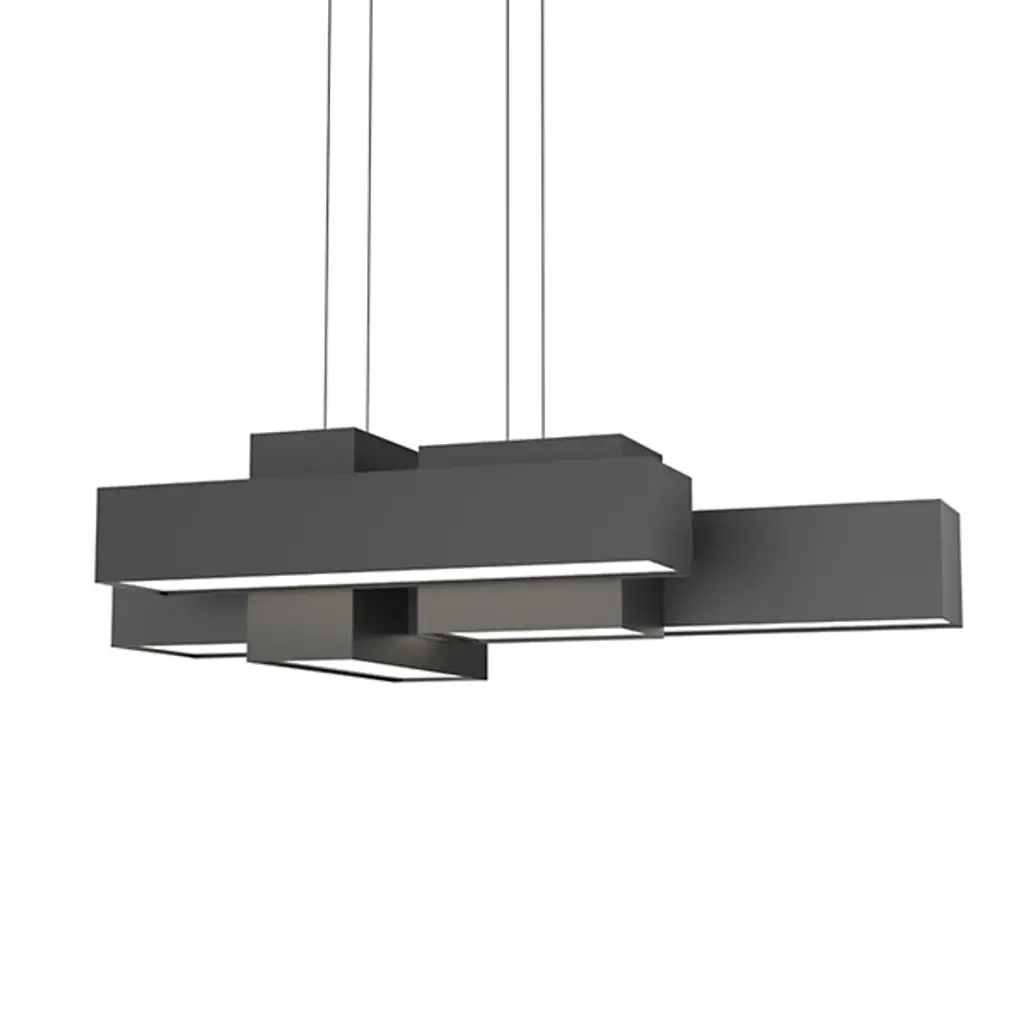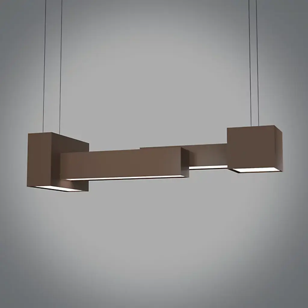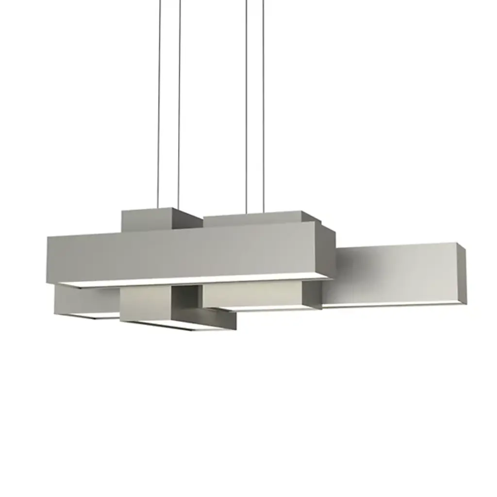The Metro 24526 LED Linear Suspension from UltraLights features an asymmetrical design that creates a unique view from each perspective. Modular-style boxes of varying dimensions work with the light shining through the opal acrylic shade beneath to create a beautiful show of reflection and shadow. Made in the United States, these boxes house high-efficiency LEDs and are UL Listed Damp, making this fixture suitable for hospitality, commercial, or residential applications.