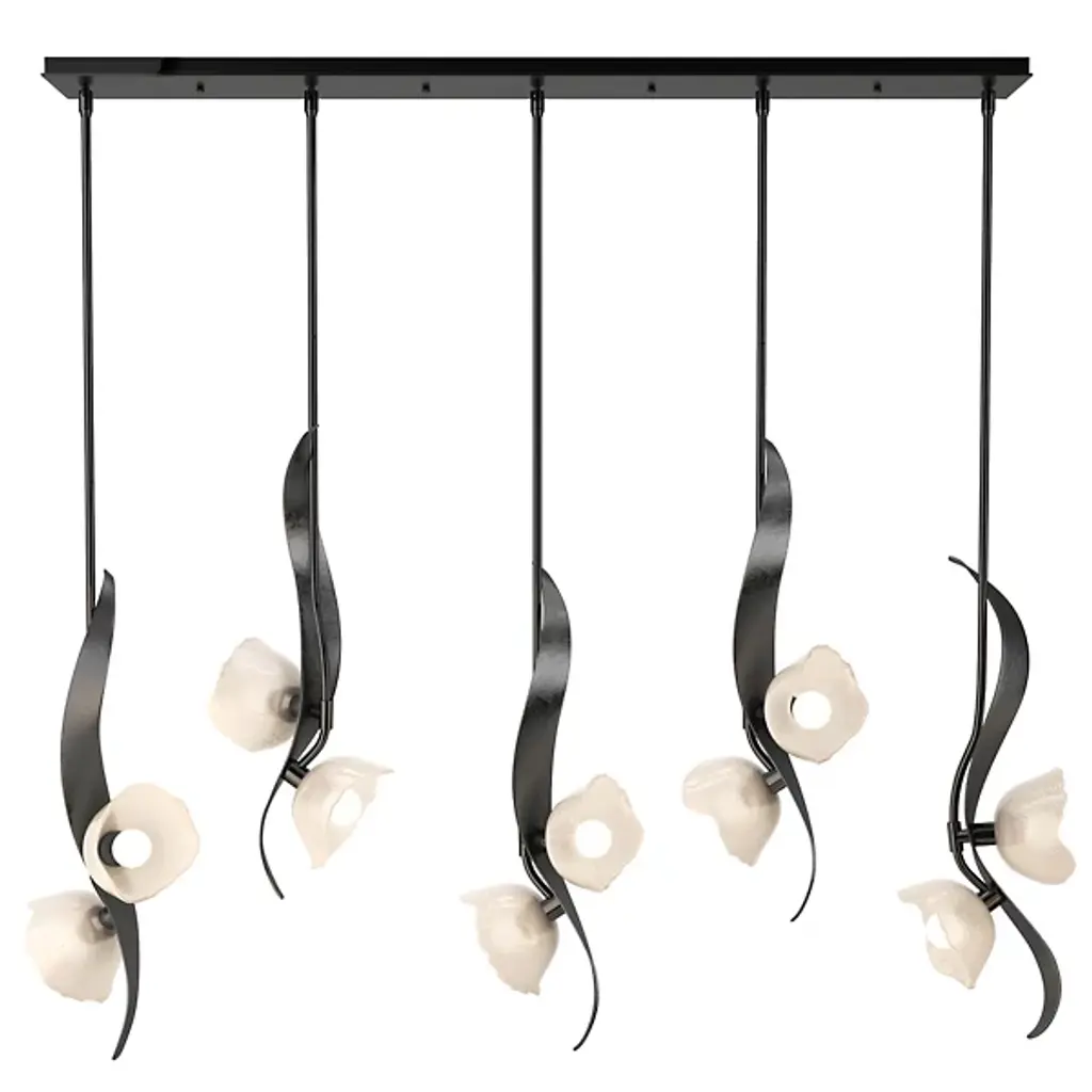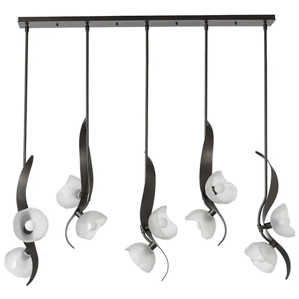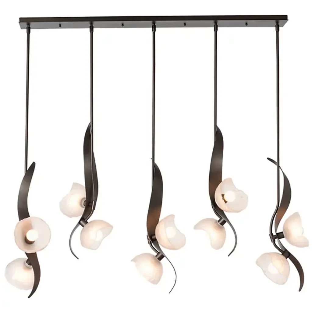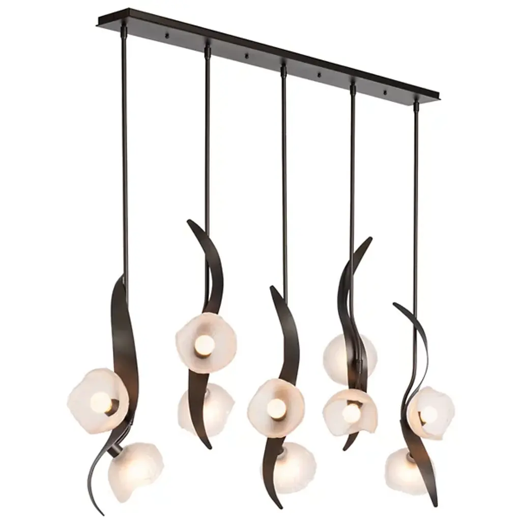 Introduce a new level of sophistication to your space with the Hubbardton Forge Mika 10-Light Linear Suspension. Distinctive and graceful, this pendant showcases a beautiful array of handmade Italian glass shades. Crafted with care in Vermont, USA, this linear pendant made of steel and glass brings both aesthetic appeal and functionality. With its irregular glass shade shape, it offers an artistic touch to any living room, kitchen, or dining room looking for transitional styling.