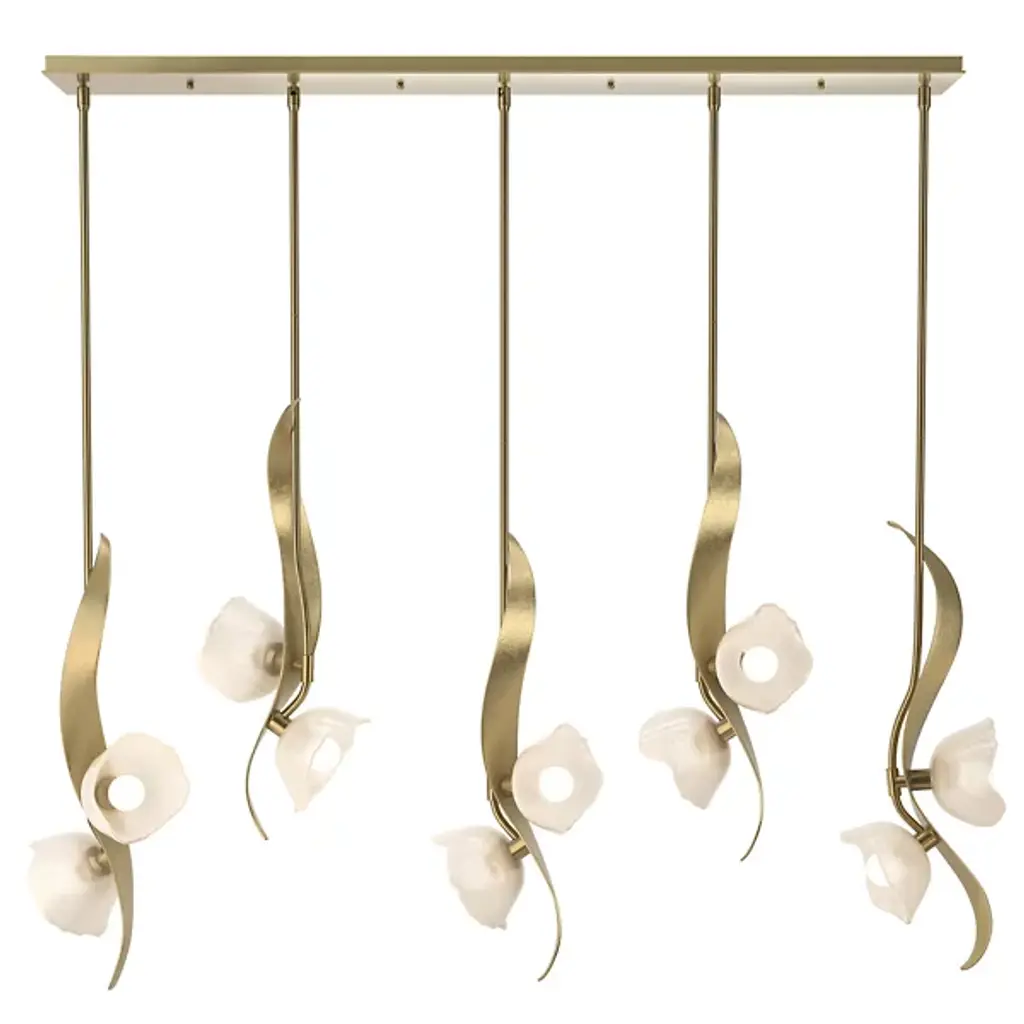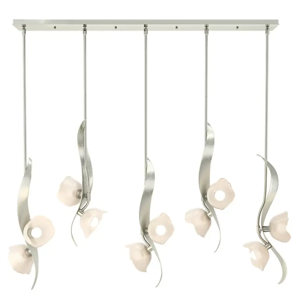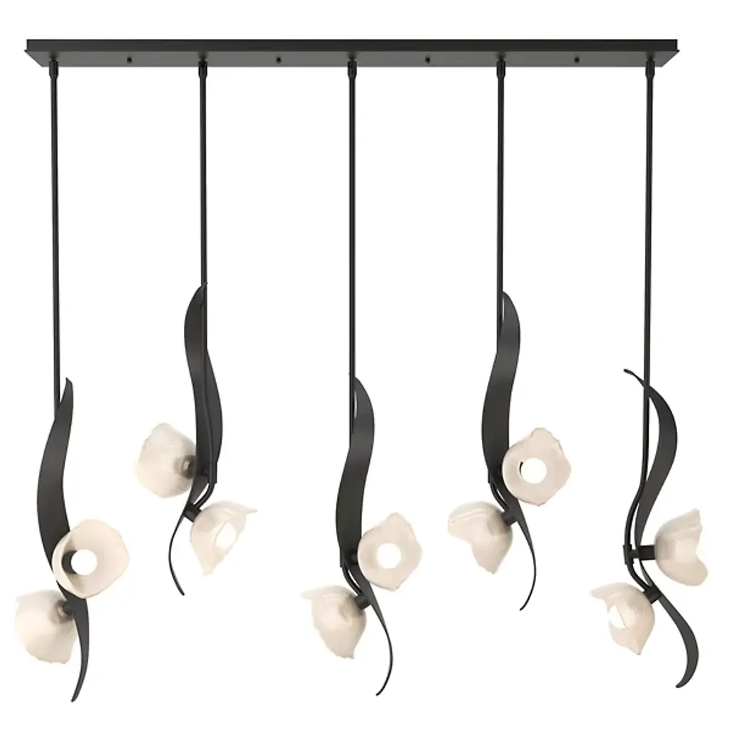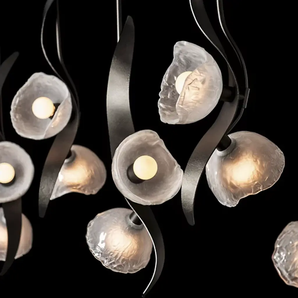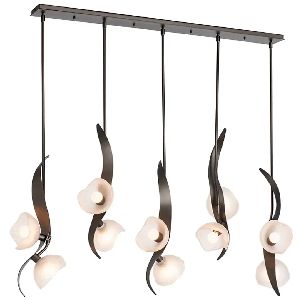 Introduce a new level of sophistication to your space with the Hubbardton Forge Mika 10-Light Linear Suspension. Distinctive and graceful, this pendant showcases a beautiful array of handmade Italian glass shades. Crafted with care in Vermont, USA, this linear pendant made of steel and glass brings both aesthetic appeal and functionality. With its irregular glass shade shape, it offers an artistic touch to any living room, kitchen, or dining room looking for transitional styling.