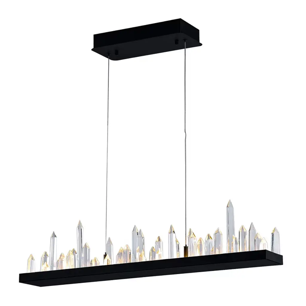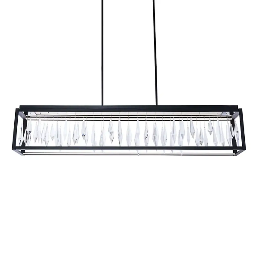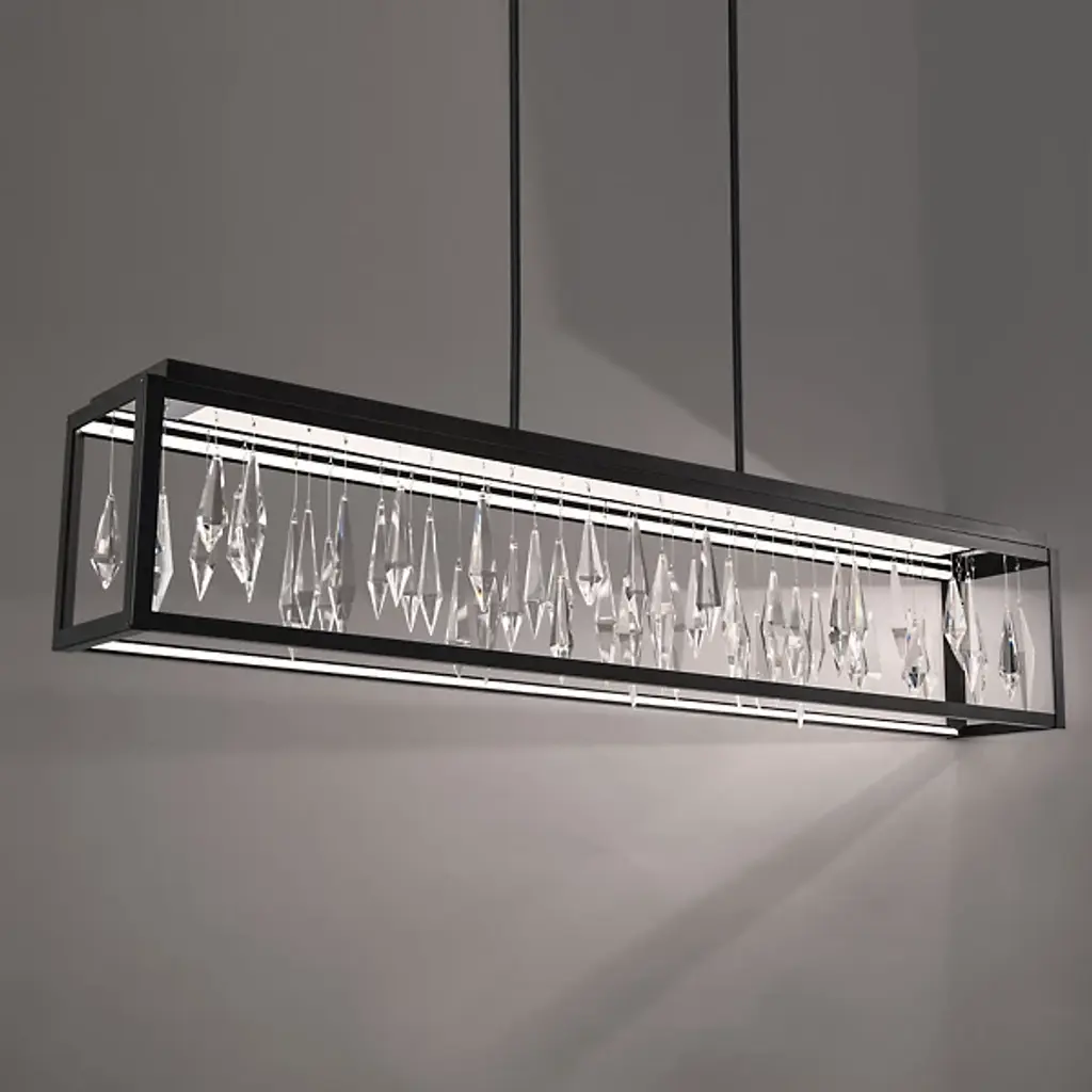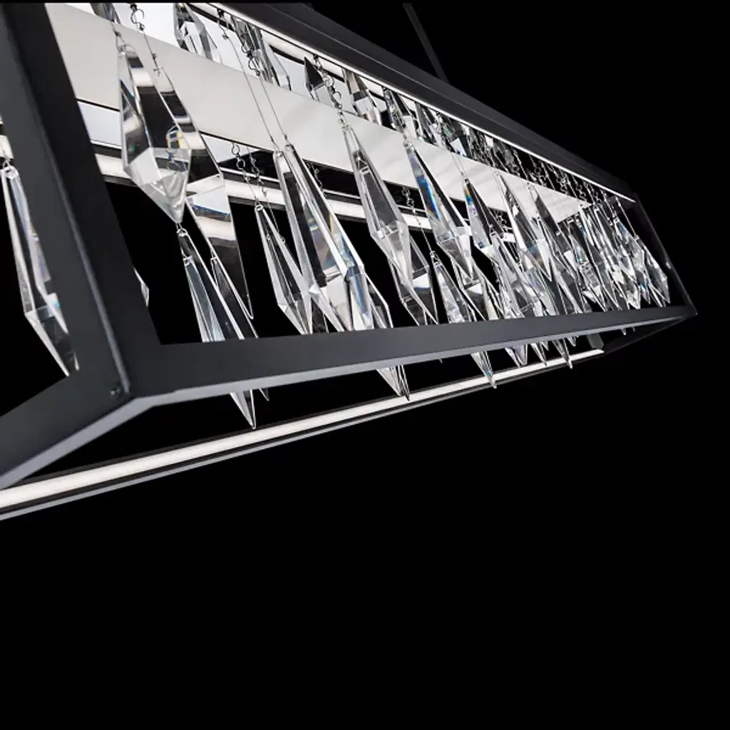 An airy, elegant addition suited to large inside spaces. The Mirage LED Linear Suspension from Schonbek Beyond expresses an expansive character, relying on parallel rods sweeping down from a stepped rectangular canopy to hold a large rectangular prism frame below. Illumination is provided by damp-rated LED lamping set within each inner edge of the long steel frame, illuminating a series of pointed crystals suspended within the frame and expressing a mix of even warmth and twinkling ambiance.