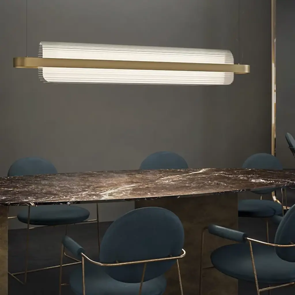 Translating to “wave” in Japanese, the Nami LED Linear Suspension from Kundalini stays true to its name with a refractive glass diffuser underlined by its easy curve. Design duo Alberto Saggia & Valerio Sommella put formal, material, technological and functional innovation at the center of each piece. The piece represents the duo’s refined contemporary visual language. This sense of refinement shows in the fine, near-disappearing quality of the wire suspension. The piece appears both bold and light by pairing metal and glass. The outer metal structure gives the piece its sharp silhouette while the glass softens things up with its pleasant arch. The striations marking the glass present the LED light with a spacious and mellow quality. This long sweeping glow is ideal for the table setting.