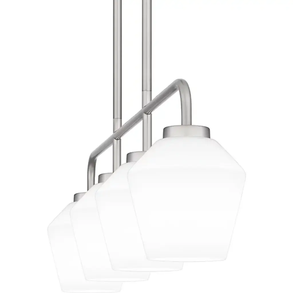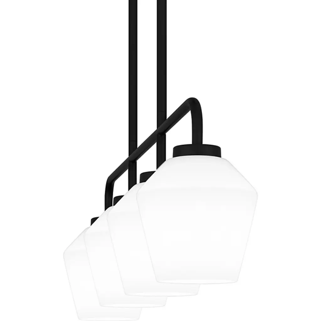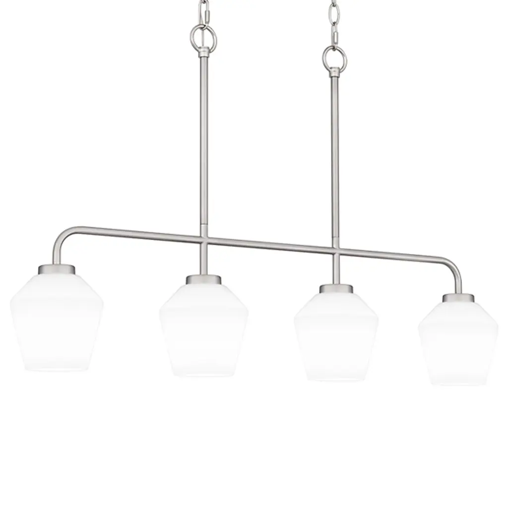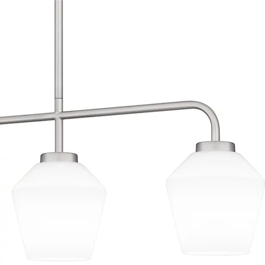 Suspend sophistication in your living space with the Nielson Linear Suspension from Quoizel, featuring a sleek steel structure supported by small, slender chains and anchored by a rectangular canopy. This fixture effortlessly blends transitional styling and clean lines, making it a versatile addition to any home decor. Opal etched glass shades with inward bevels add subtle style and sophistication, casting a soft and inviting glow in any room. Crafted from durable steel and designed to withstand damp conditions, this suspension light perfectly embodies transitional style while offering fabulous functionality and enduring elegance.