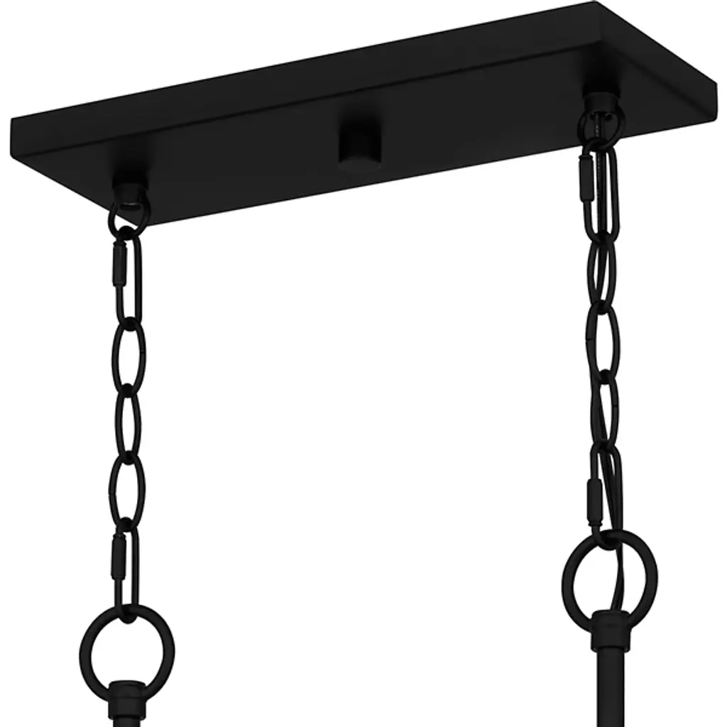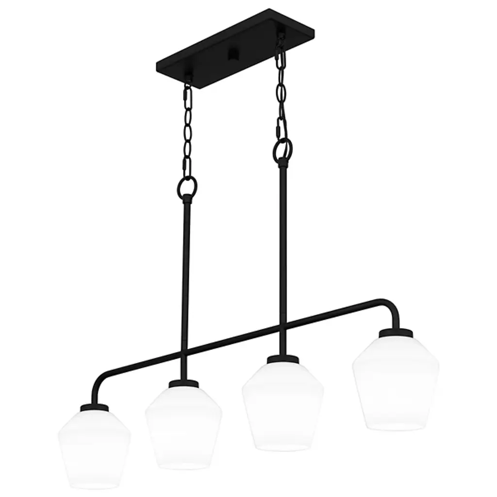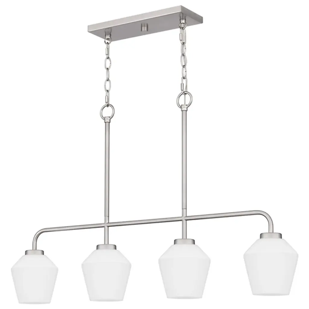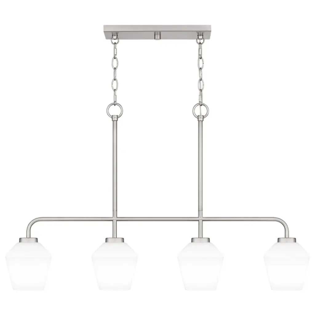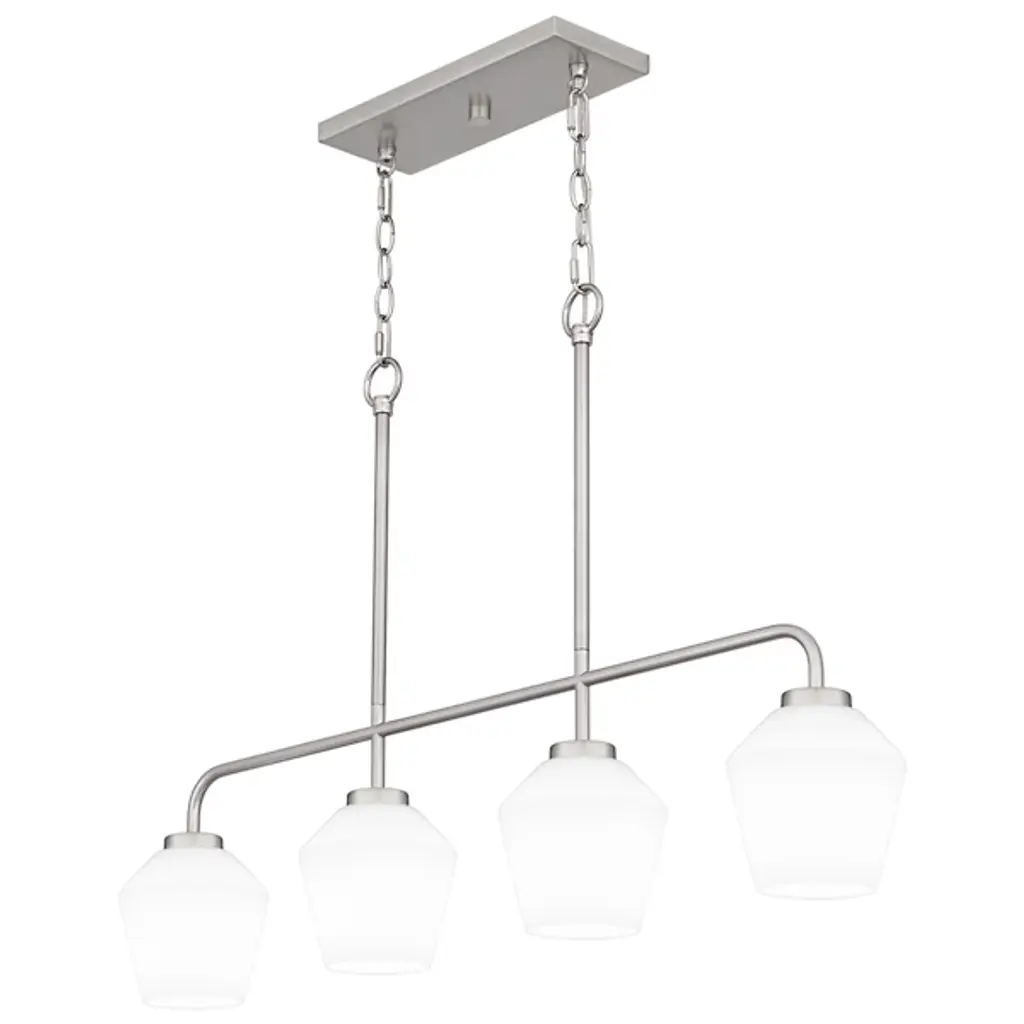 Suspend sophistication in your living space with the Nielson Linear Suspension from Quoizel, featuring a sleek steel structure supported by small, slender chains and anchored by a rectangular canopy. This fixture effortlessly blends transitional styling and clean lines, making it a versatile addition to any home decor. Opal etched glass shades with inward bevels add subtle style and sophistication, casting a soft and inviting glow in any room. Crafted from durable steel and designed to withstand damp conditions, this suspension light perfectly embodies transitional style while offering fabulous functionality and enduring elegance.