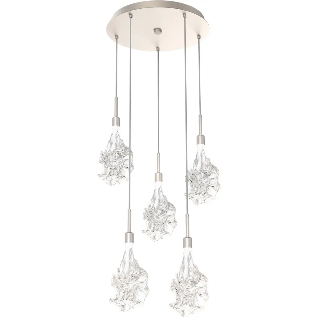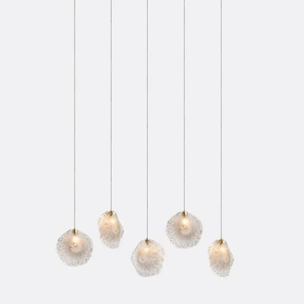 A memorable, artistic style ideal for open interiors. The Nimbus Linear Suspension from Shakuff offers an elegant, enduring appeal, descending via slim wires from a stepped rectangular canopy. LED lamping descends in a staggered array, blooming from the base of each wire within a blown glass orb. Each orb is individually dimpled, transforming the light within the individual glass shades into a subtly different character, with the natural, crinkled creases of each shade expressing its own signature ambiance.