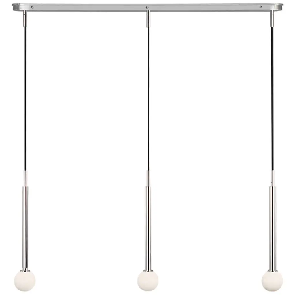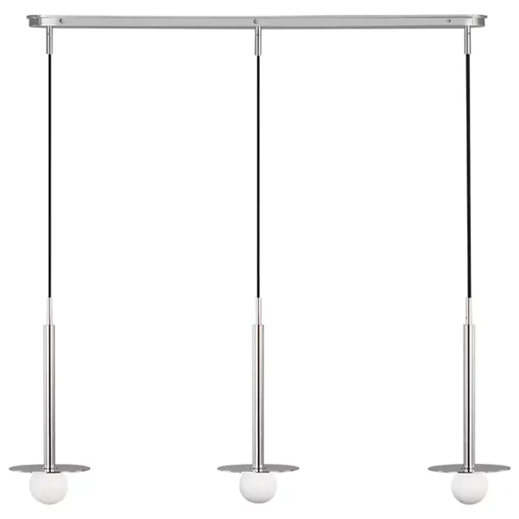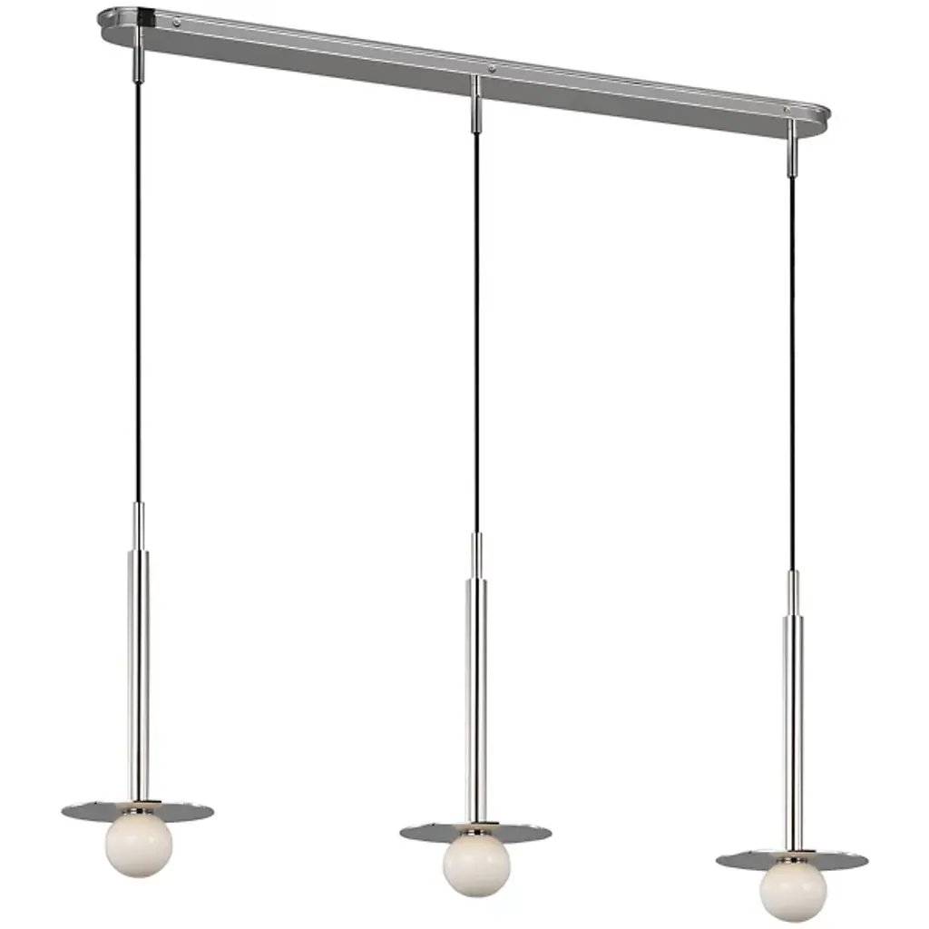 The Nodes Linear Suspension from Visual Comfort Studio blends minimalism with bold design, showcasing Kelly's signature style of mixed materials and curvilinear forms. Light radiates beautifully from milk glass globes against sleek metal discs, offering a striking visual contrast. All fixtures can be used with or without the discs, providing versatile styling options. Hanging fixtures feature elegant black fabric cords, while pivot sconces offer the choice of cord-and-plug or hardwired installation, making this collection a perfect blend of functionality and artistic design.