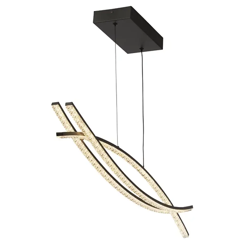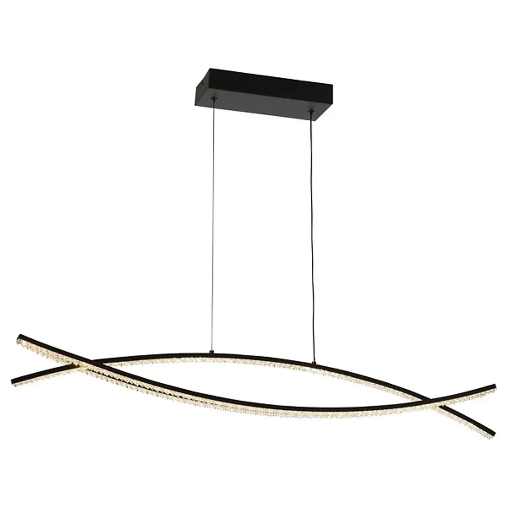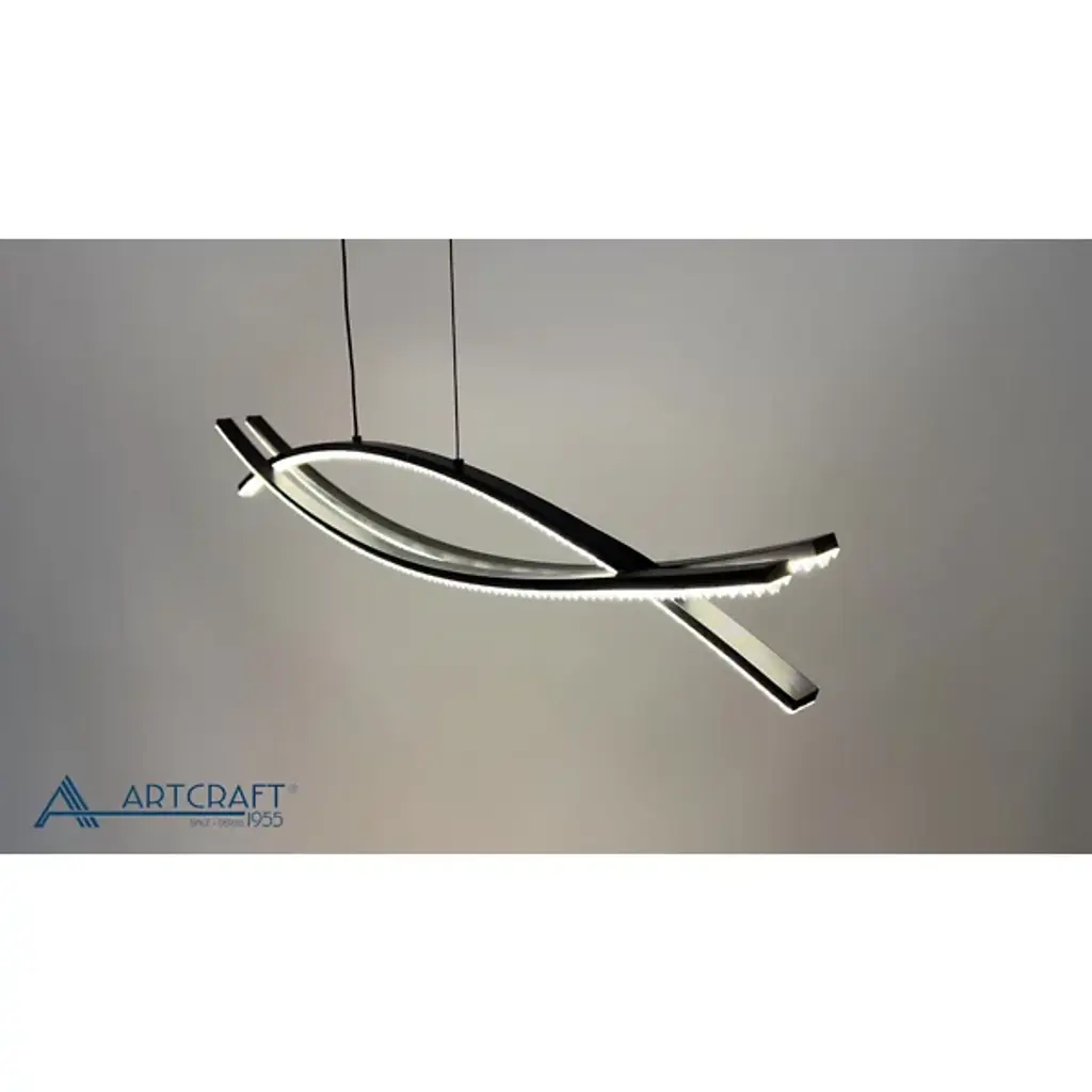 Fitting of its celestial name, the Nova LED Linear Suspension from Artcraft graces one's gathering space with delightful curves of sparkling light. The simple yet ornate quality of the piece gives it a jewel-like character in the room. Thin cables suspend the structure to accentuate the overall floating appearance. Gestural in silhouette, the contoured structure produces amazing curves that shine with a texture-rich acrylic diffuser. The sweeping, shimmering structure translates to a generous spread of illumination.