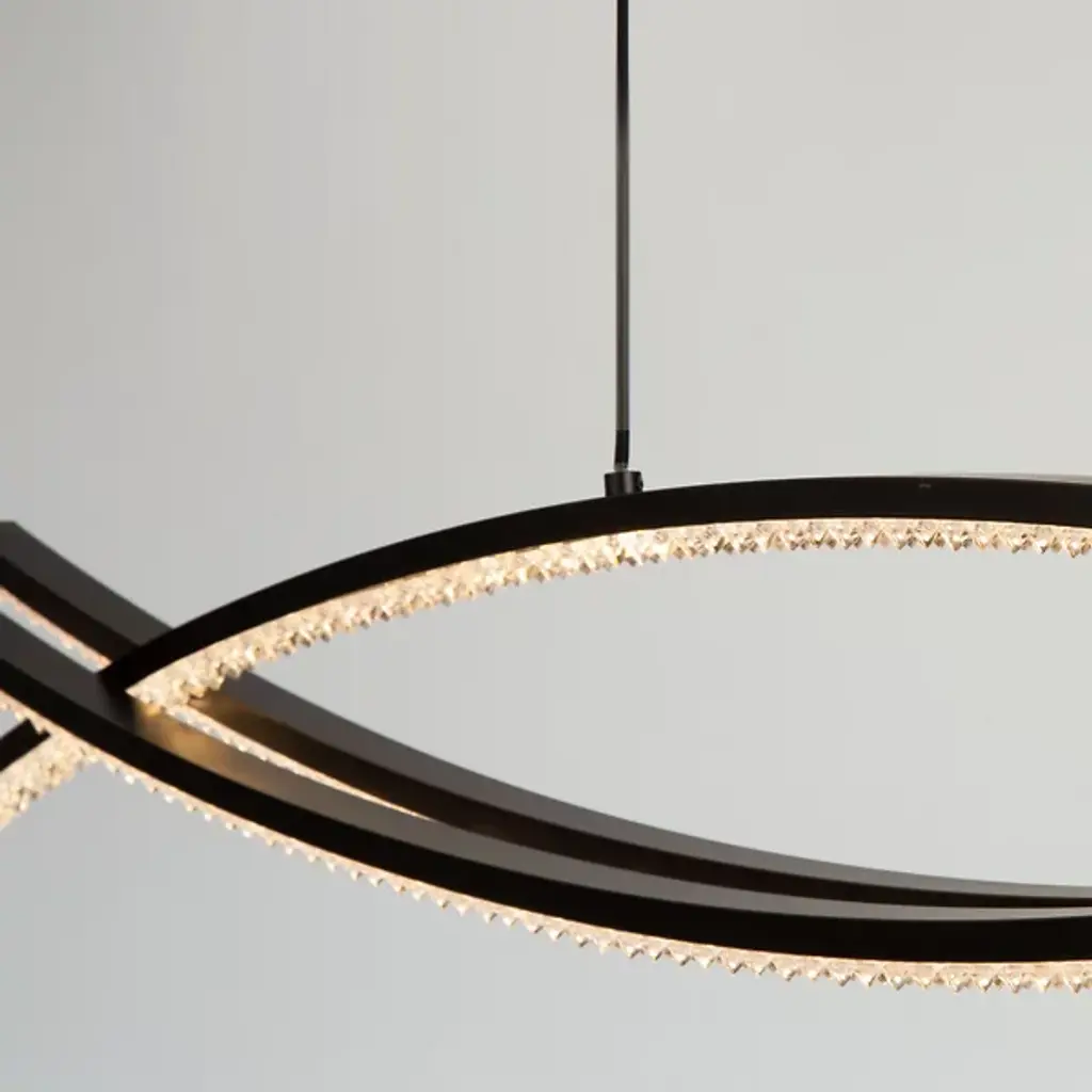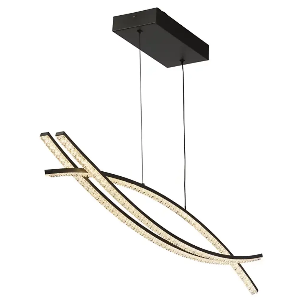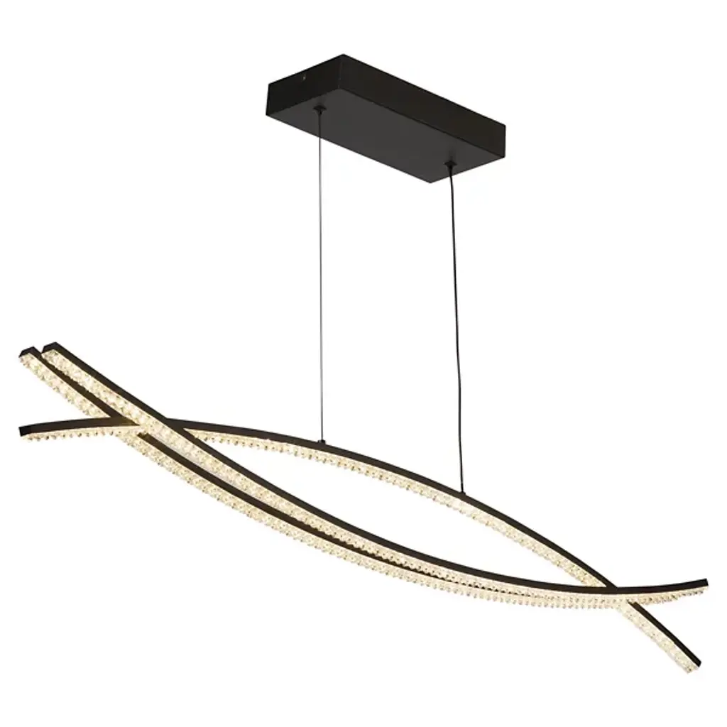 Fitting of its celestial name, the Nova LED Linear Suspension from Artcraft graces one's gathering space with delightful curves of sparkling light. The simple yet ornate quality of the piece gives it a jewel-like character in the room. Thin cables suspend the structure to accentuate the overall floating appearance. Gestural in silhouette, the contoured structure produces amazing curves that shine with a texture-rich acrylic diffuser. The sweeping, shimmering structure translates to a generous spread of illumination.