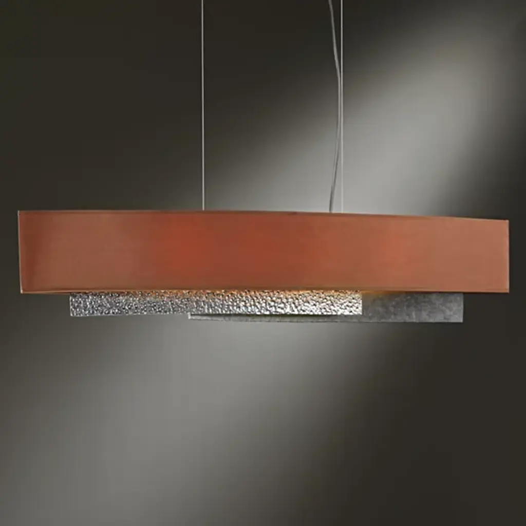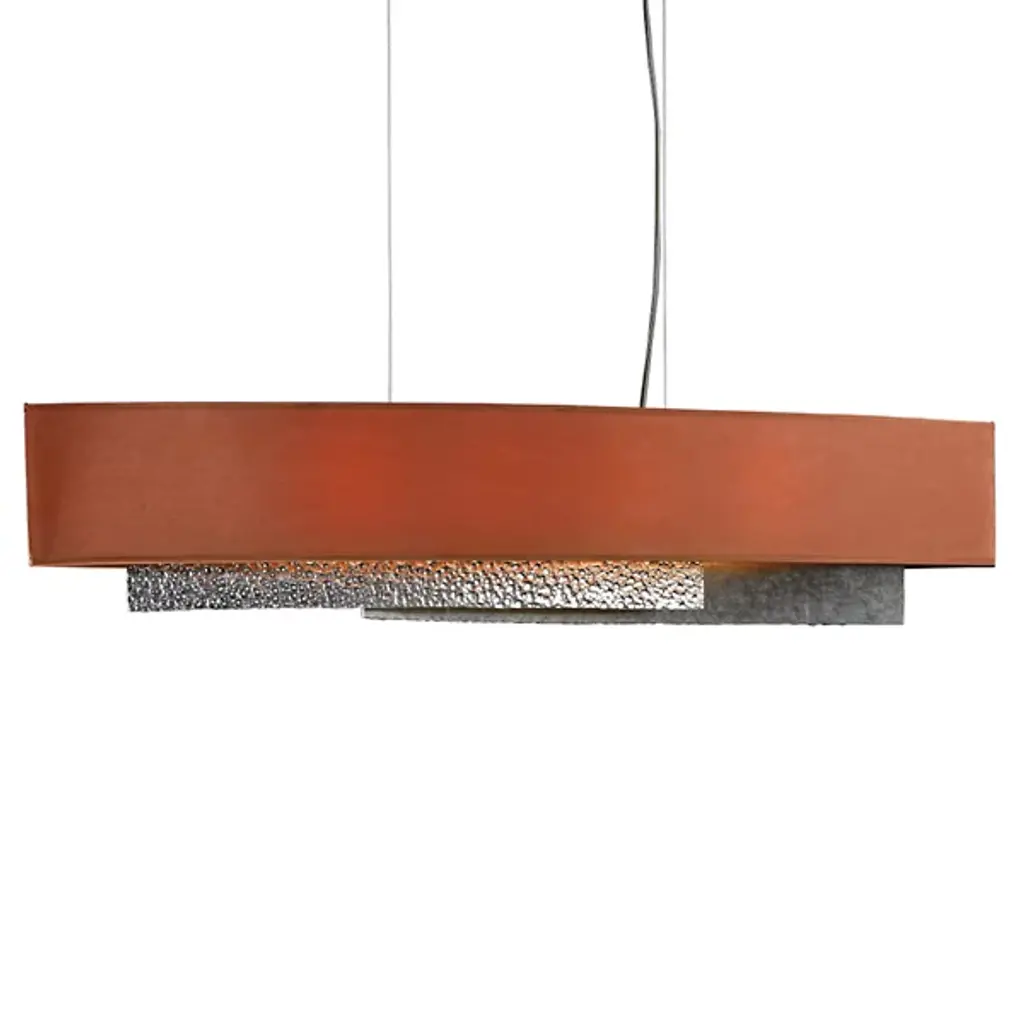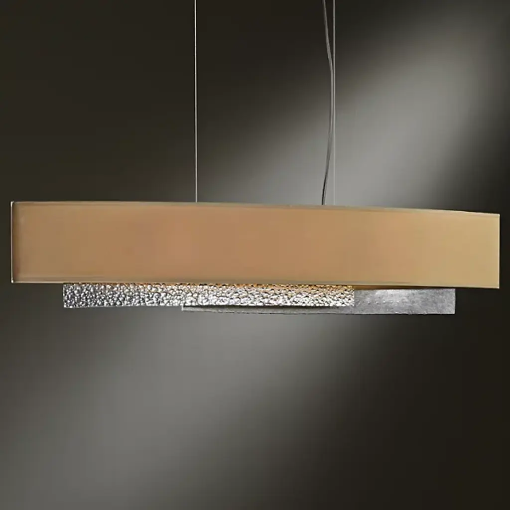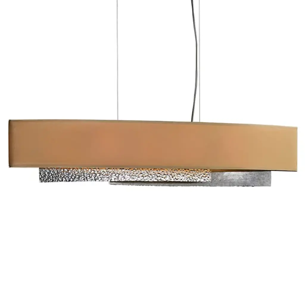 Like a luxury liner cutting through the waves, the Hubbardton Forge Oceanus Linear Suspension makes a dramatic statement with its attractive lines and impressive scale. An elongated marquise-shaped fabric shade offers a crisp and tailored look with a slim profile when viewed from either end. Below the shade, waves of hammered aluminum in a lustrous finish, creating a dappled effect like light sparkling over water.