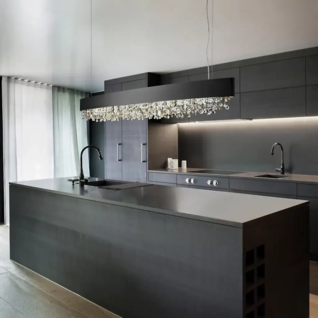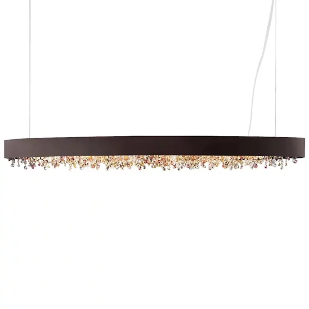A contemporary mix of muscular metallics and gleaming gems, the Masiero Ola Linear Suspension features a continuous expanse of coated Italian glass strands spilling downward from its sleek frame. Ola is available in four finishes and its own individual assortment of cascading colored crystals. The different styling arrangements result in four unique looks that would complement a wide range of interior spaces.