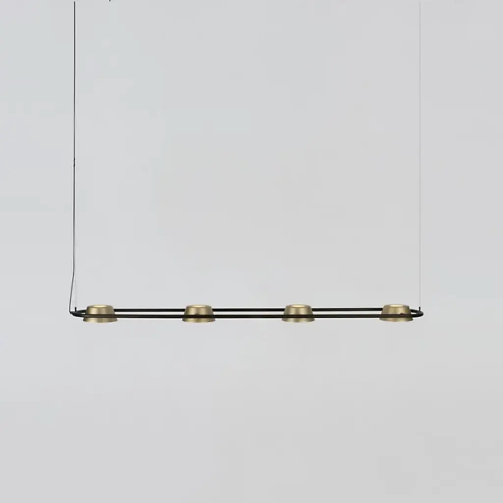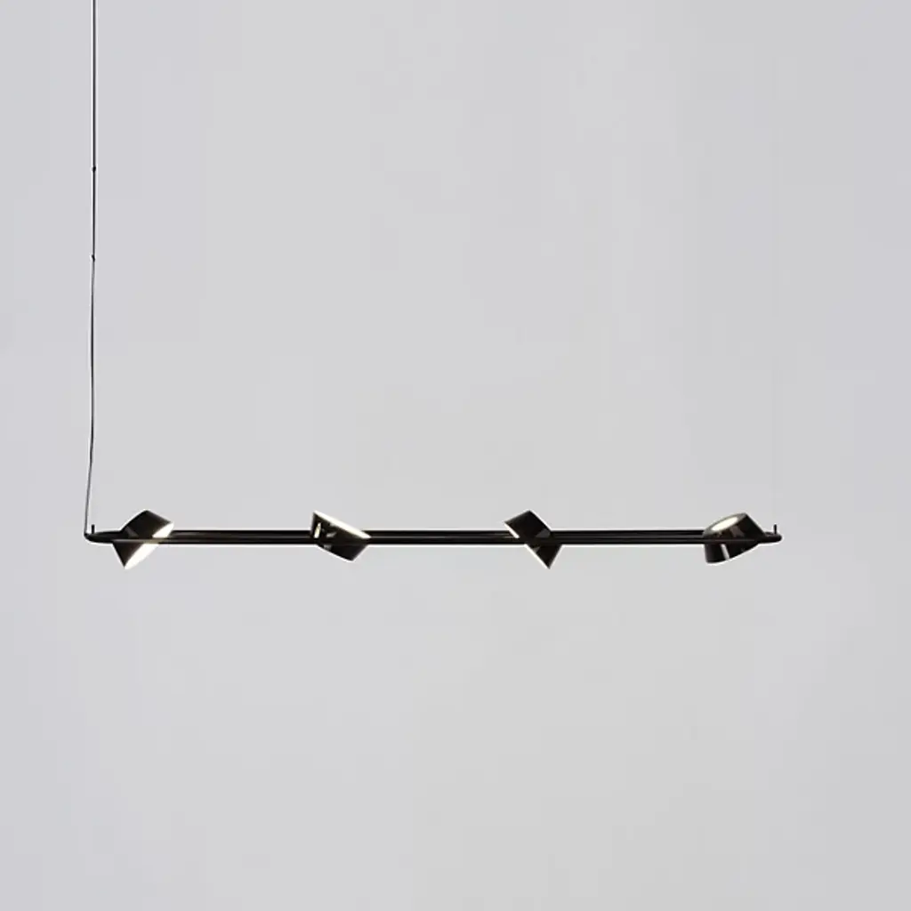 An elegant combination of nostalgia and contemporary style defines the Olo LED Linear Suspension by Seed Design. Slender cabled suspend an elongated frame that holds a series of tapered metal shades. Each open-top shade boasts a frosted interior that acts as a diffuser for its integrated LED light and can rotate to channel its glare-free light in any direction. A simple and tasteful design enhanced by its adjustability and versatility, this piece is ideal over a dining table.