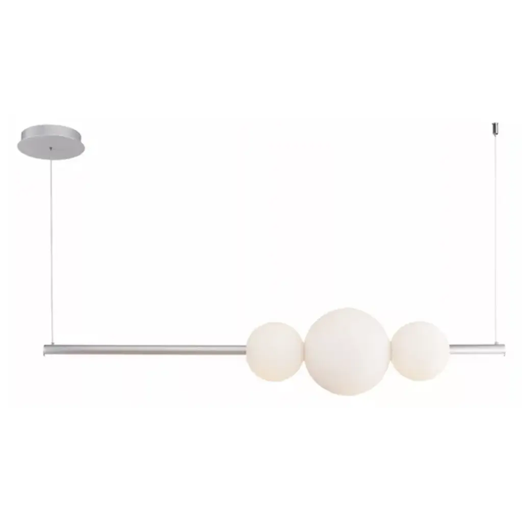 The ORB Triple Linear Suspension from Abra is a tone-setting piece connecting a charming bubble-like cluster with a piercing linear array. A minimalist setup from top to bottom makes it ideal in the refined setting. It enhances the spaciousness of the room by extending a wide LED array. This array slots under the bold steel crossbar to produce an encompassing down glow. The down glow pours into opal glass globe shades, filling them up with a golden hue. By playing with different sizes and asymmetry along the crossbar, the globes help break up the uniformity of the room’s architectural lines.