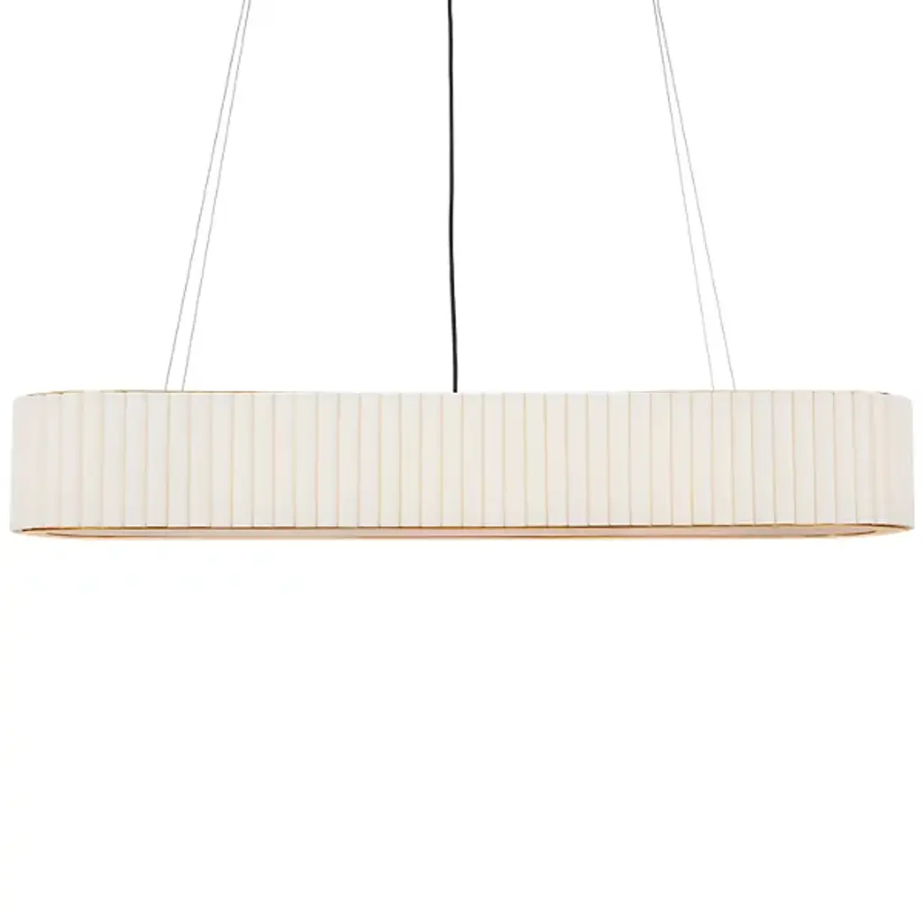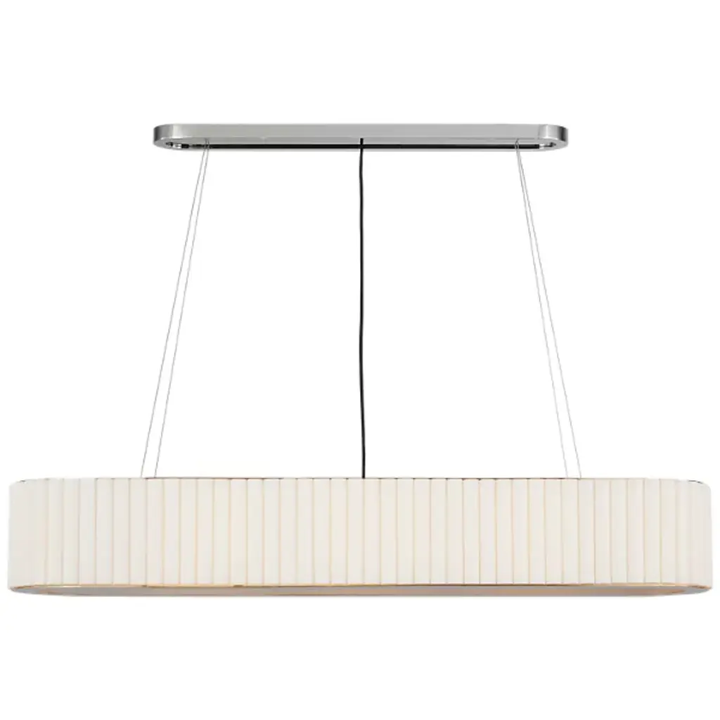 The Palati Linear Suspension from Visual Comfort Signature presents a glorious accompaniment to high-ceilinged gathering spaces. An enticing, expansive design created by Ian K. Fowler, it pairs clever contemporary design with softer modern elements, using a single stem and oval steel frame to support a vertically-pleated linen diffuser around strong lamping within. Ideal over a large open space or to highlight a large table or island, the shade is left open below, extending a splash of direct downlight accompanied by a warm wash of ambiance through the gauzy fabric shade.
