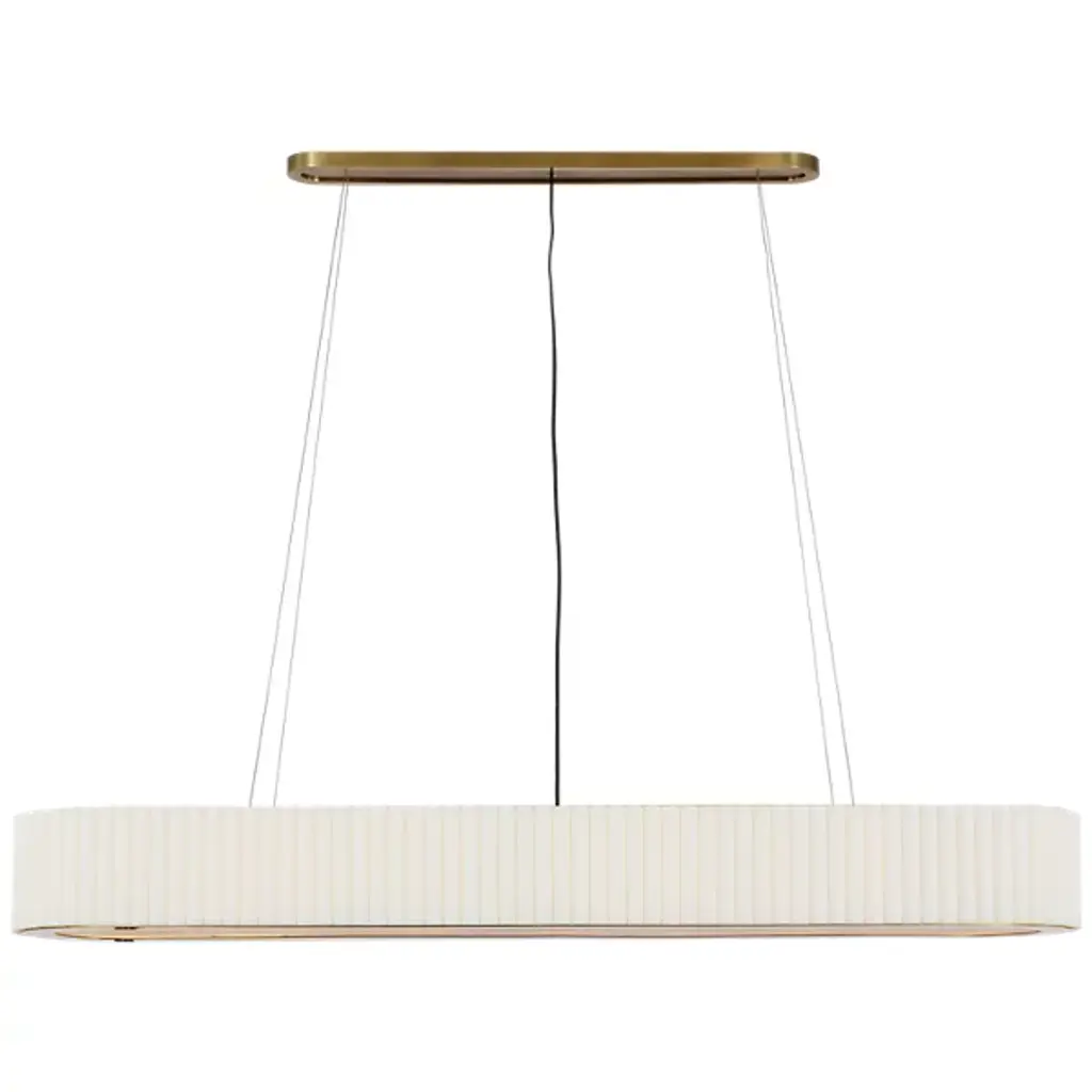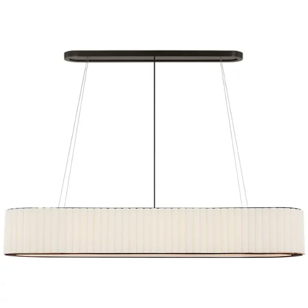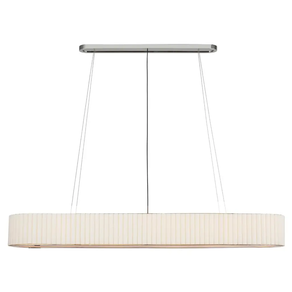 The Palati Linear Suspension from Visual Comfort Signature presents a glorious accompaniment to high-ceilinged gathering spaces. An enticing, expansive design created by Ian K. Fowler, it pairs clever contemporary design with softer modern elements, using a single stem and oval steel frame to support a vertically-pleated linen diffuser around strong lamping within. Ideal over a large open space or to highlight a large table or island, the shade is left open below, extending a splash of direct downlight accompanied by a warm wash of ambiance through the gauzy fabric shade.