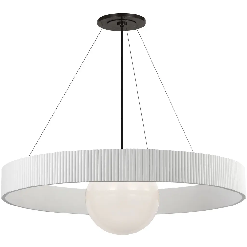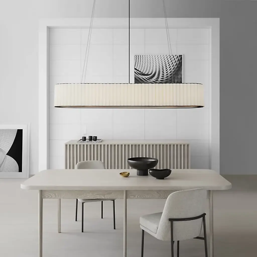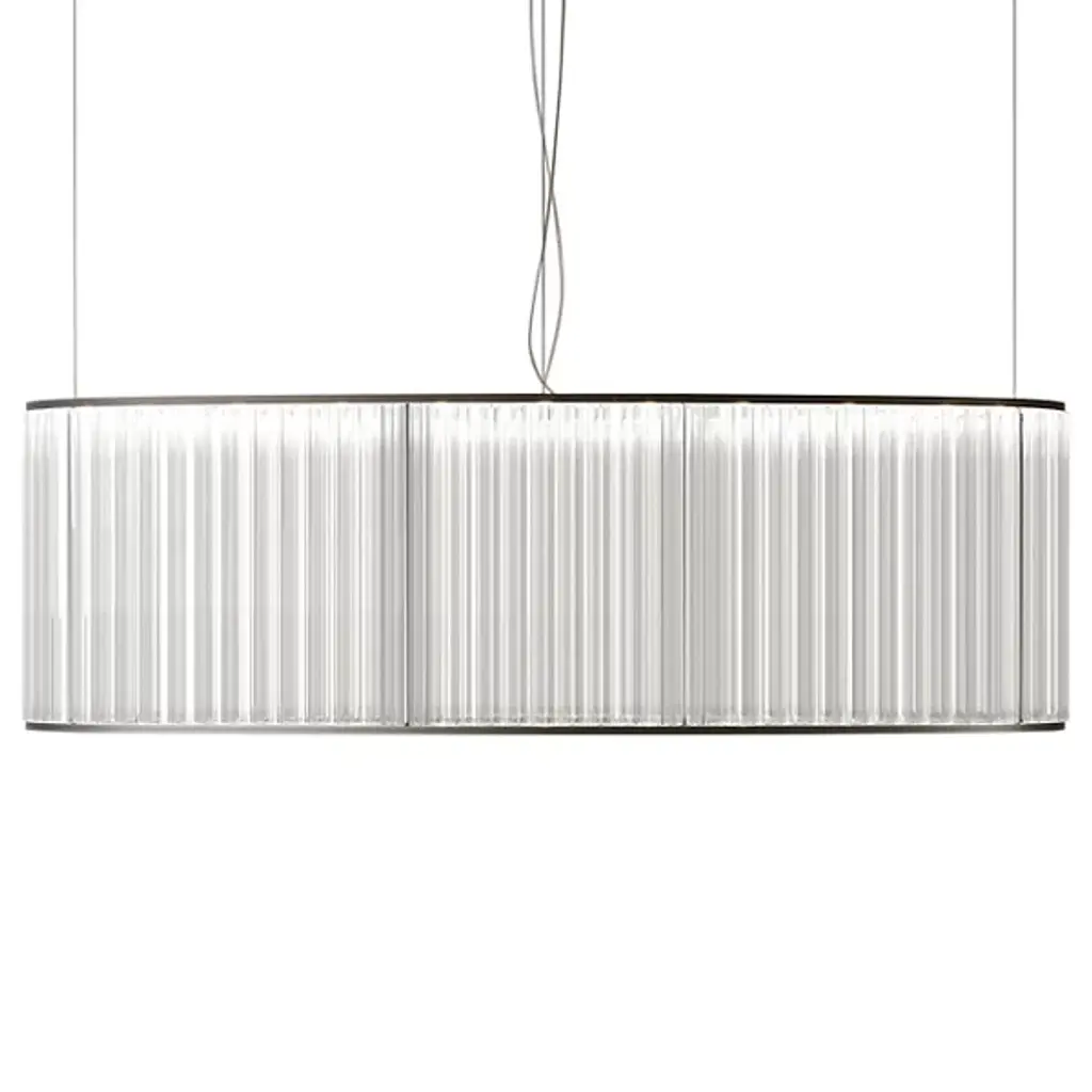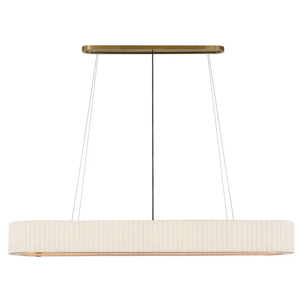 The Palati Linear Suspension from Visual Comfort Signature presents a glorious accompaniment to high-ceilinged gathering spaces. An enticing, expansive design created by Ian K. Fowler, it pairs clever contemporary design with softer modern elements, using a single stem and oval steel frame to support a vertically-pleated linen diffuser around strong lamping within. Ideal over a large open space or to highlight a large table or island, the shade is left open below, extending a splash of direct downlight accompanied by a warm wash of ambiance through the gauzy fabric shade.