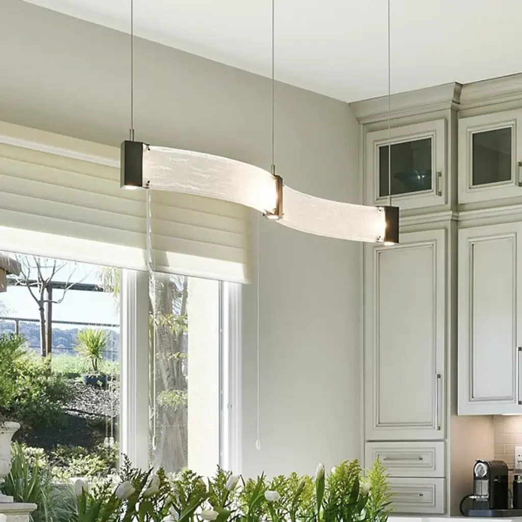 Bring contemporary luxury home with the Parallel Curved LED Linear Suspension by Hammerton Studio. Its wave-like silhouette consists of parallel handcrafted, kiln-fused, textured glass panels that are joined and capped by finished metal inserts. These metal inserts contain Cree brand integrated LEDs that sit flush behind Frosted Glass diffusers, pointed both down and sideways for a dazzling display once lit.