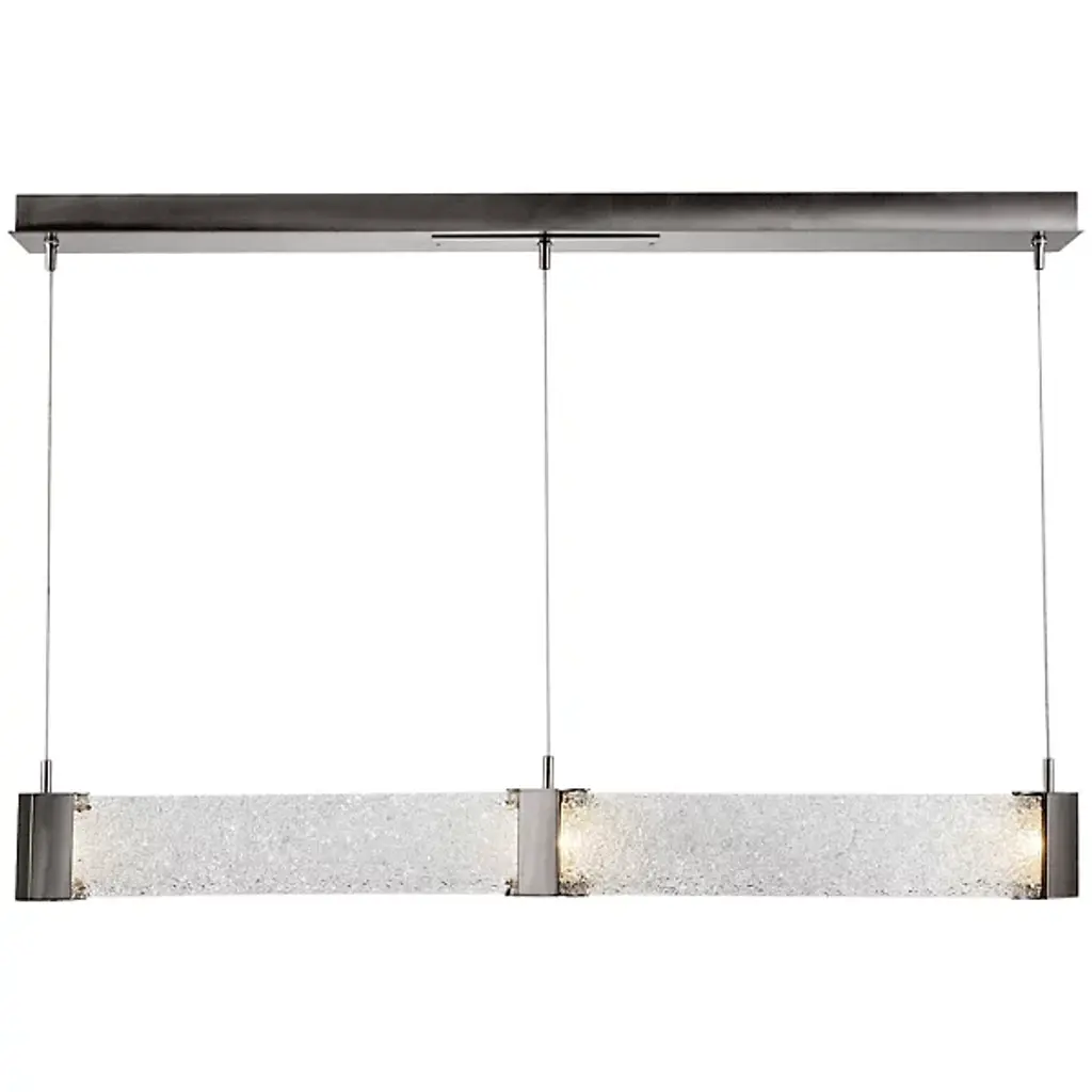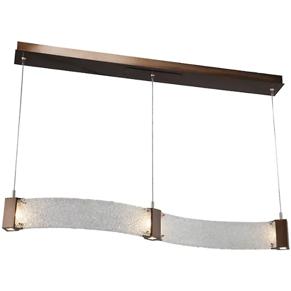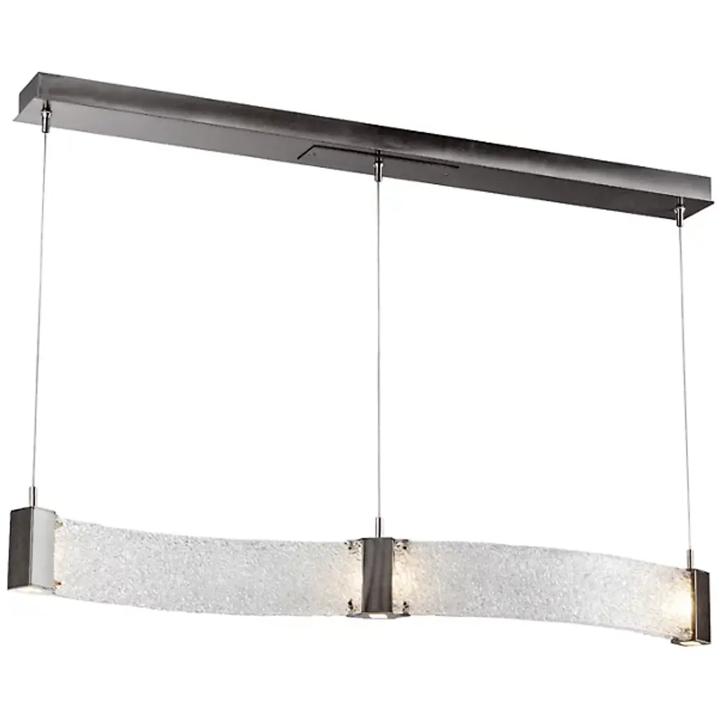 Bring contemporary luxury home with the Parallel Curved LED Linear Suspension by Hammerton Studio. Its wave-like silhouette consists of parallel handcrafted, kiln-fused, textured glass panels that are joined and capped by finished metal inserts. These metal inserts contain Cree brand integrated LEDs that sit flush behind Frosted Glass diffusers, pointed both down and sideways for a dazzling display once lit.