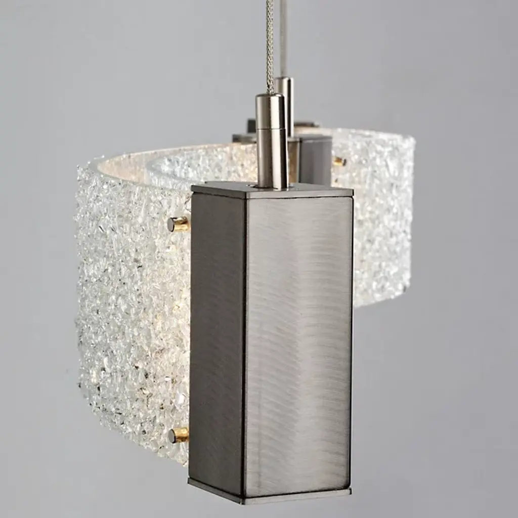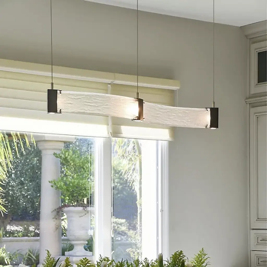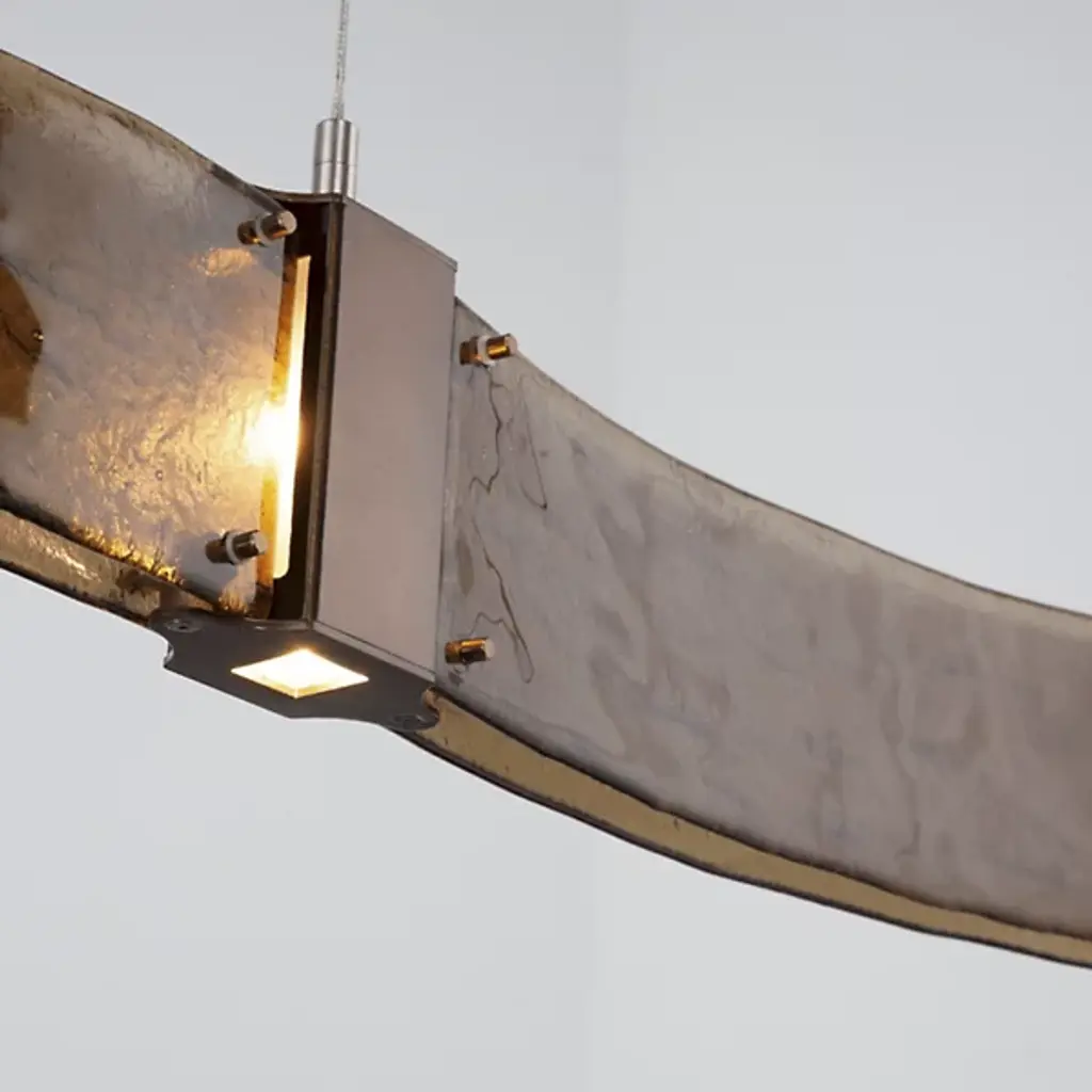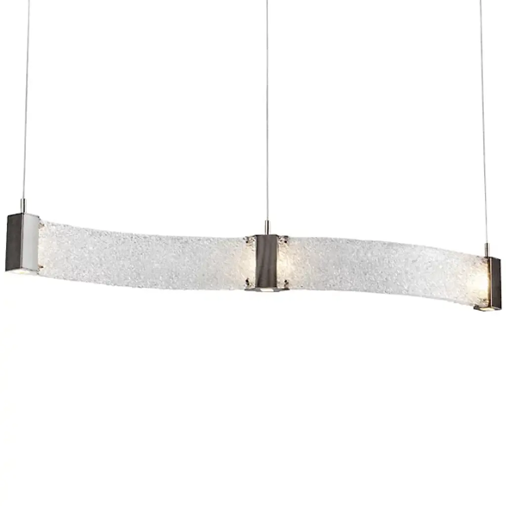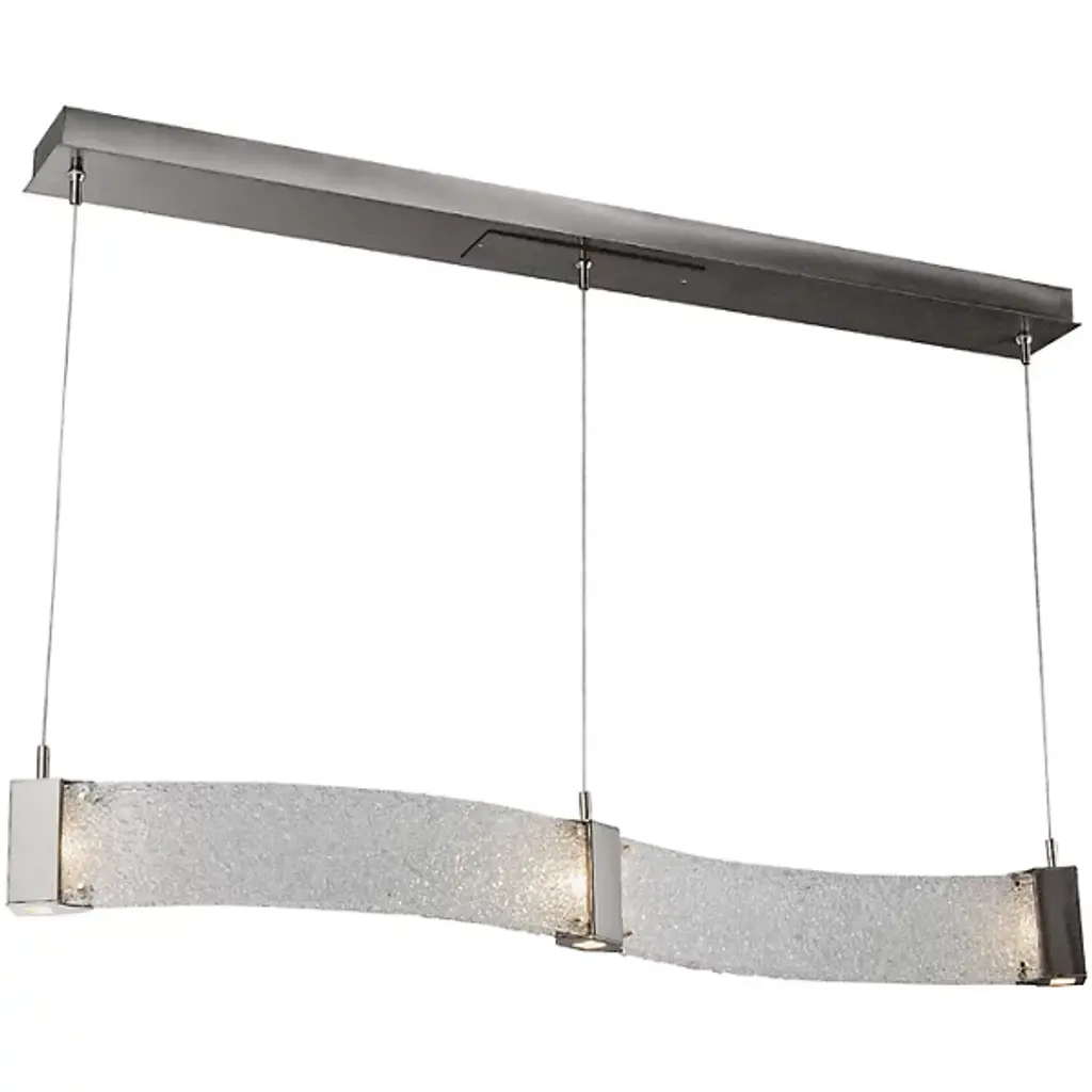 Bring contemporary luxury home with the Parallel Curved LED Linear Suspension by Hammerton Studio. Its wave-like silhouette consists of parallel handcrafted, kiln-fused, textured glass panels that are joined and capped by finished metal inserts. These metal inserts contain Cree brand integrated LEDs that sit flush behind Frosted Glass diffusers, pointed both down and sideways for a dazzling display once lit.