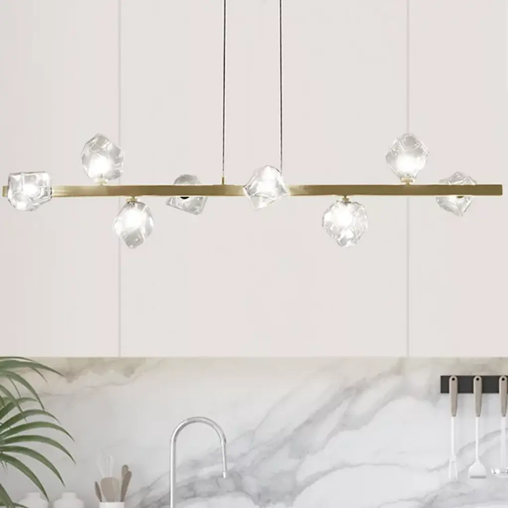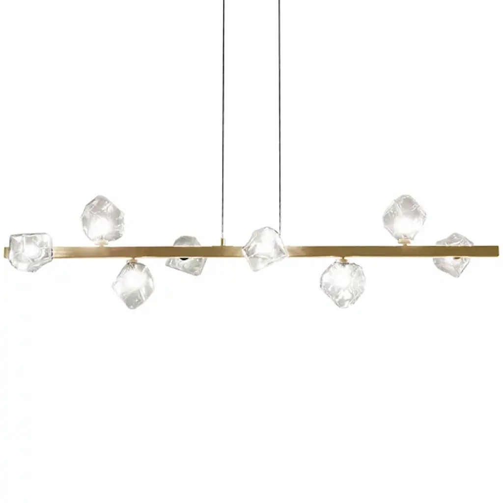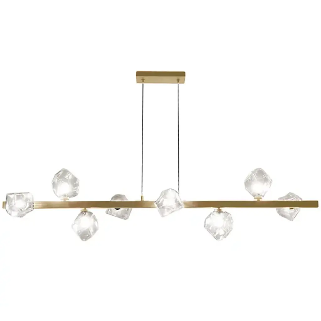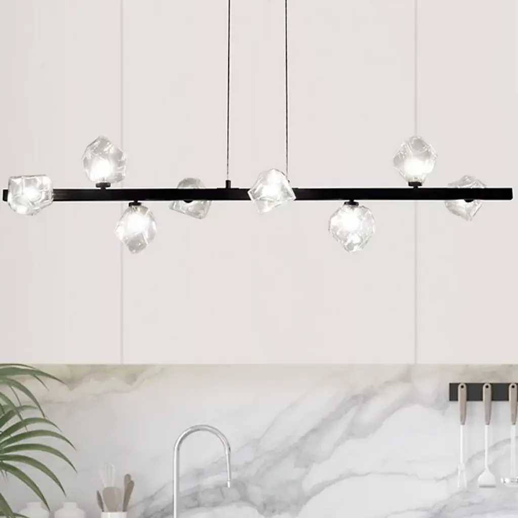 A beautiful bauble for glamorous interiors. Along the length of the Pearlene Linear Suspension by Dainolite, jagged glass shades evoke rough cut crystals or diamonds. They project out from all sides of the square metal bar, casting sparkling light all around a dining room or kitchen. Slender aircraft cables hold the sparkling structure aloft with perfect balance, and they are field-cuttable to hang at the perfect height over a table or island.