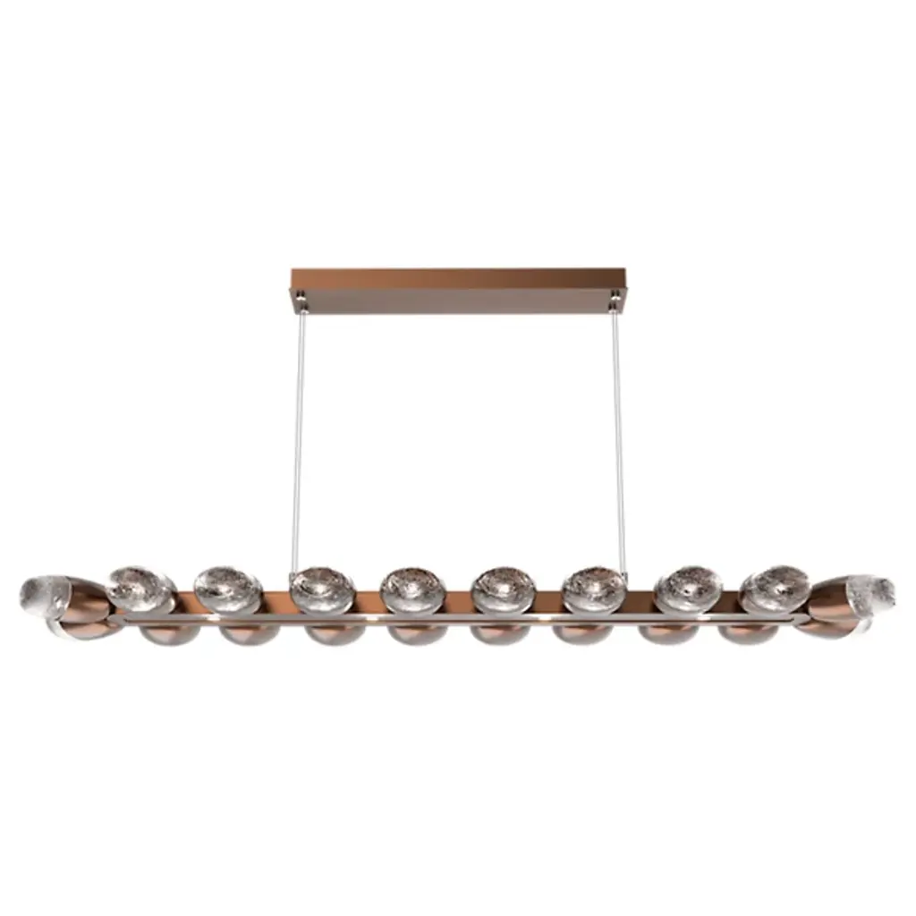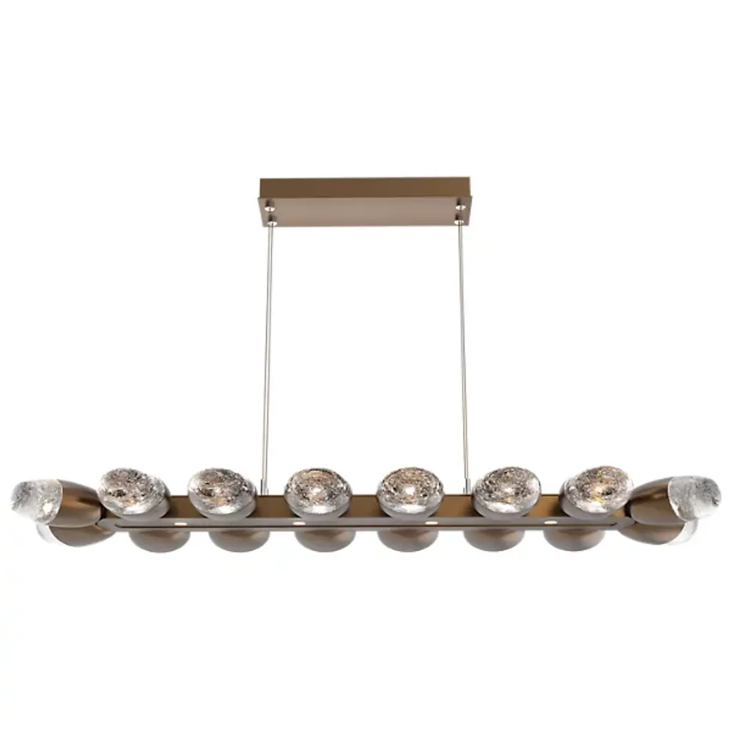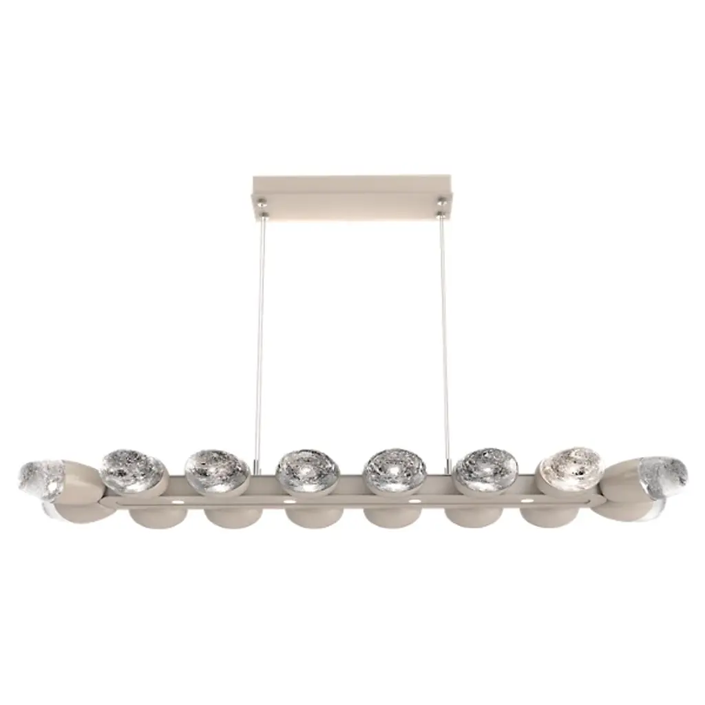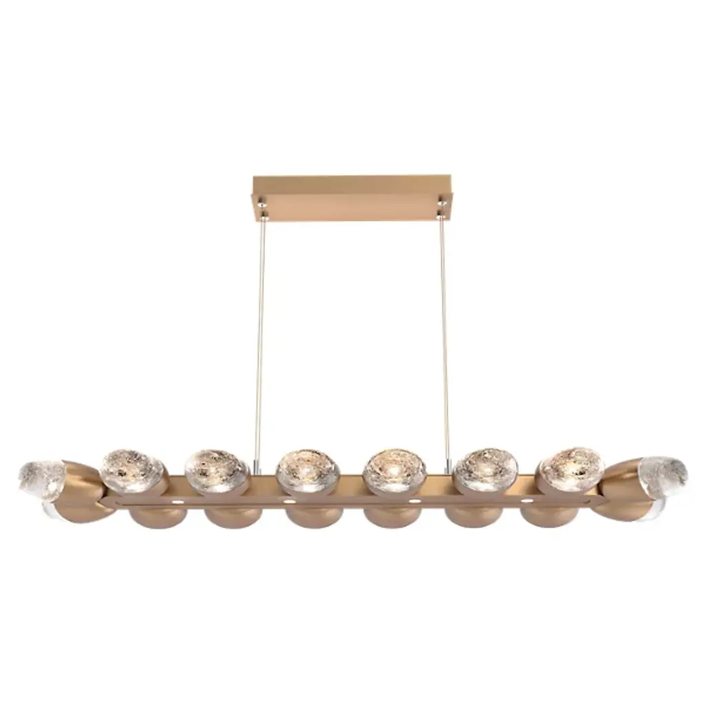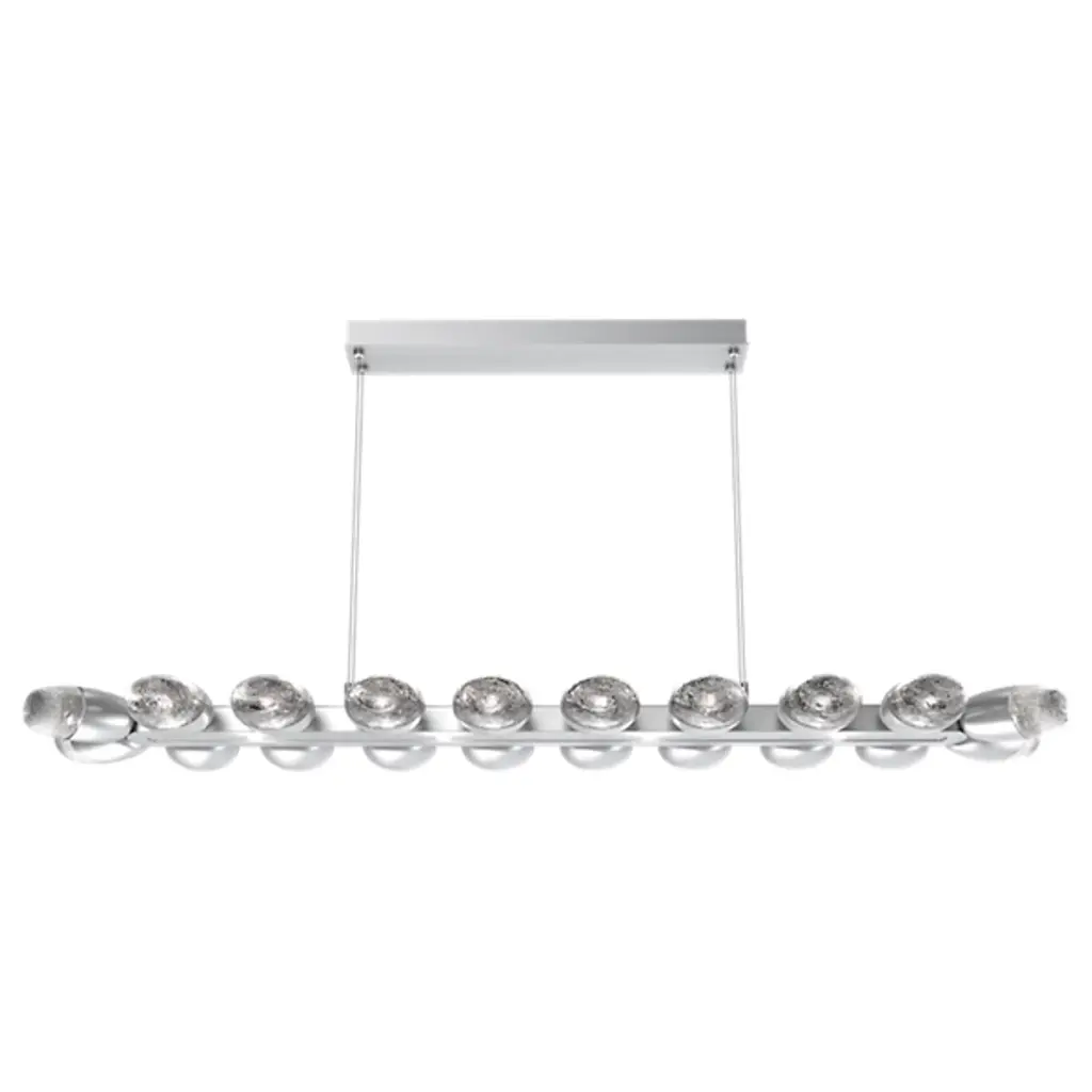 Hammerton Studio presents the Pebble LED Linear Suspension. Ideal above dining and game tables, this artful linear chandelier design sets an elegant tone with a beautifully finished, precision-machined metalwork. Softly illuminated rondelles of artisan cast glass handcrafted in Hammerton's glass studio delight in their shimmering properties. The glass housings can be positioned at preset angles to help create a dynamic, spacious glow.