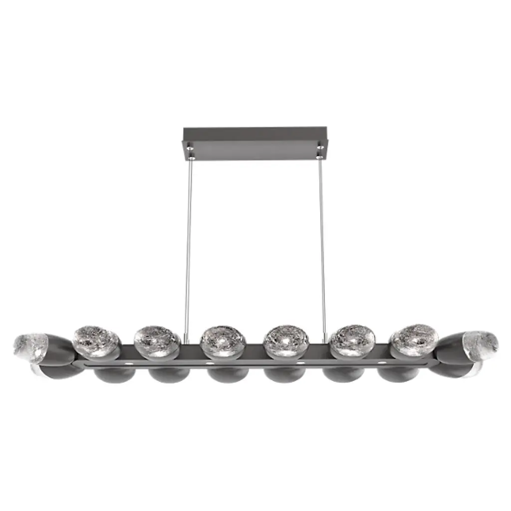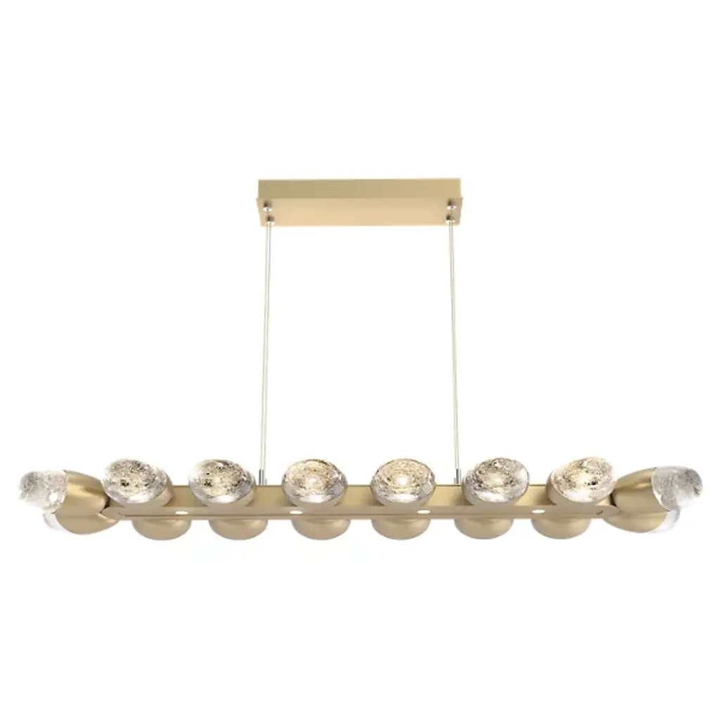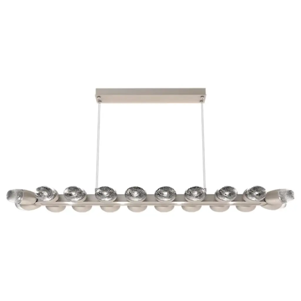 Hammerton Studio presents the Pebble LED Linear Suspension. Ideal above dining and game tables, this artful linear chandelier design sets an elegant tone with a beautifully finished, precision-machined metalwork. Softly illuminated rondelles of artisan cast glass handcrafted in Hammerton's glass studio delight in their shimmering properties. The glass housings can be positioned at preset angles to help create a dynamic, spacious glow.