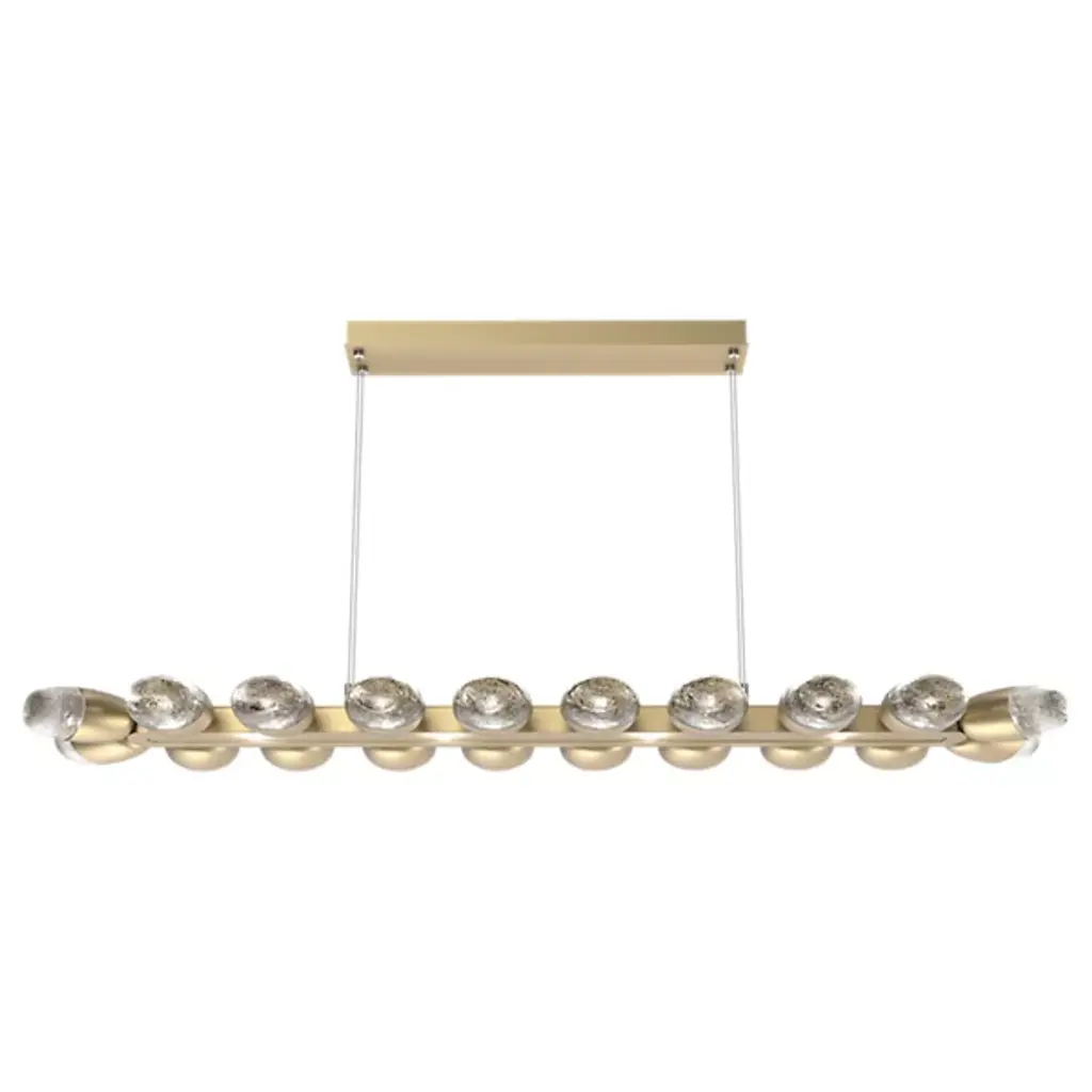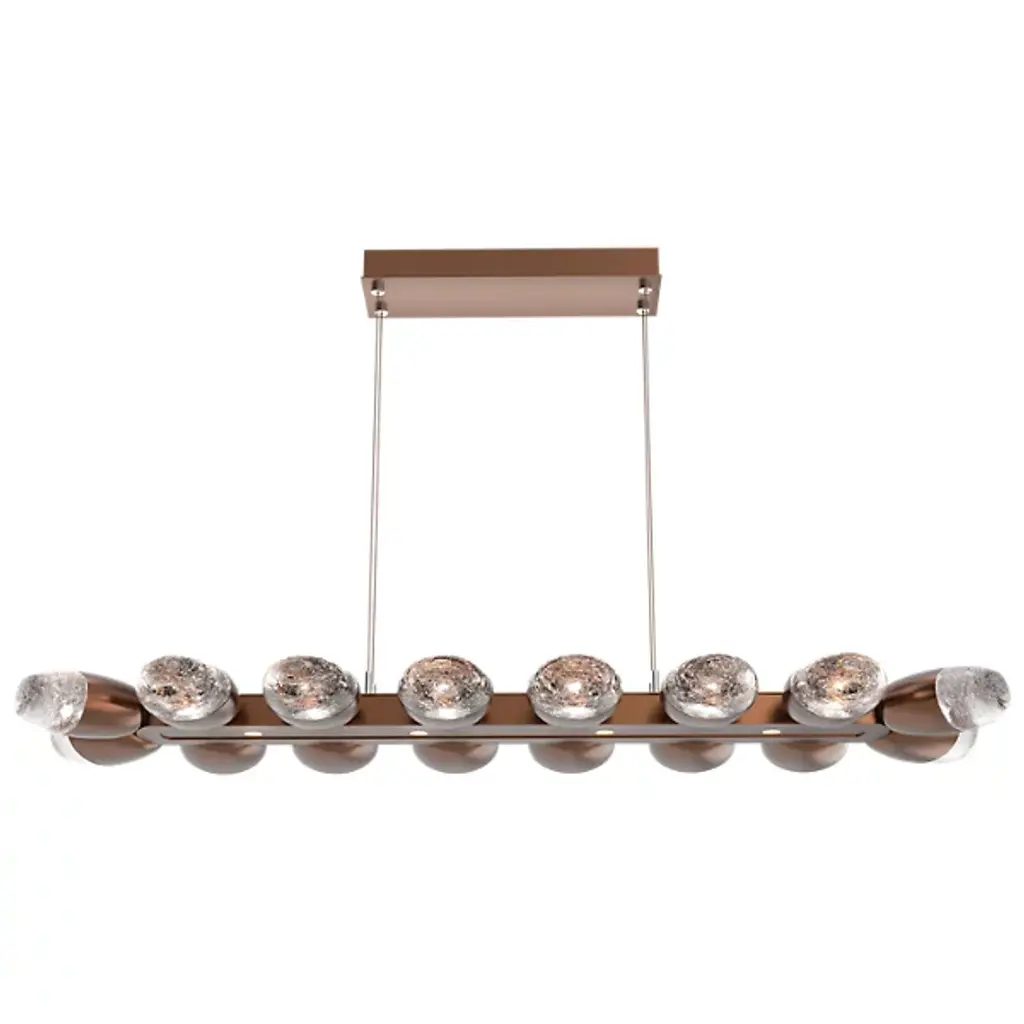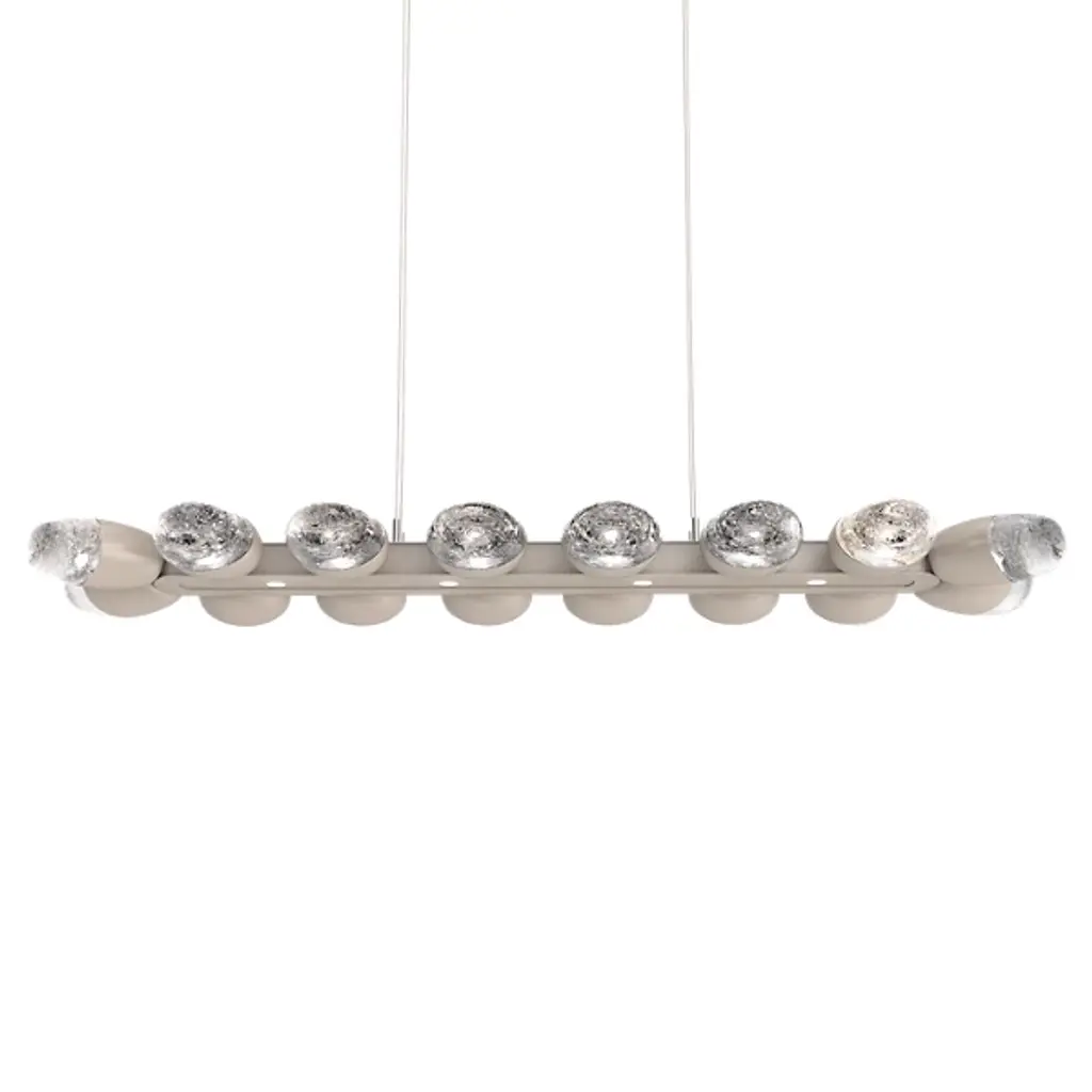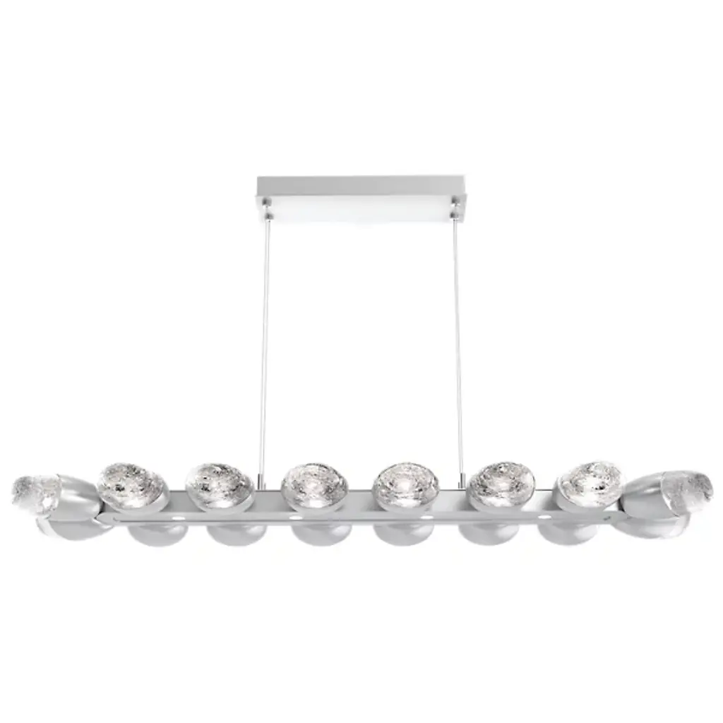Hammerton Studio presents the Pebble LED Linear Suspension. Ideal above dining and game tables, this artful linear chandelier design sets an elegant tone with a beautifully finished, precision-machined metalwork. Softly illuminated rondelles of artisan cast glass handcrafted in Hammerton's glass studio delight in their shimmering properties. The glass housings can be positioned at preset angles to help create a dynamic, spacious glow.