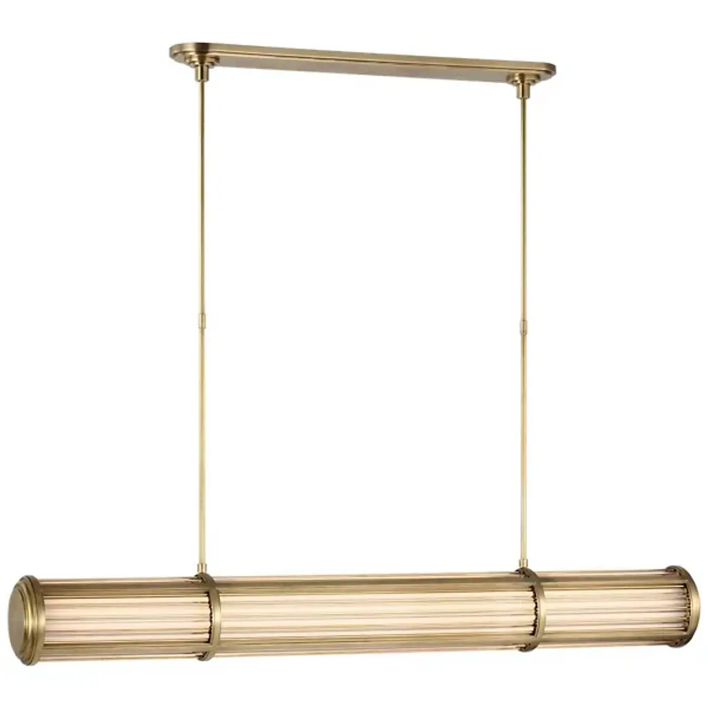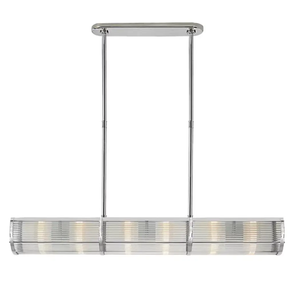 The Perren Linear Suspension by Visual Comfort Signature, formerly known as Visual Comfort, is a sophisticated, modern design that dazzles as an array of glass tubes create an elongated, cylindrical body that light playfully filters and refracts throughout. Capped neatly on either end and wrapped with smooth metal bands that help suspend this linear design from an oval-shaped canopy thanks to a pair of down rods, this piece brings a tailored, bright touch to its surroundings.