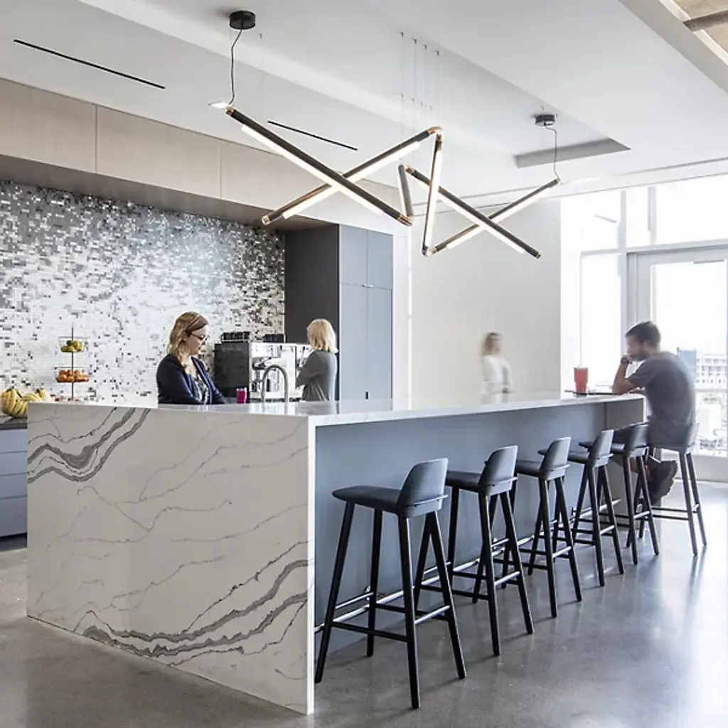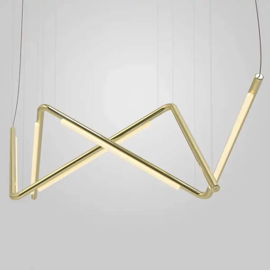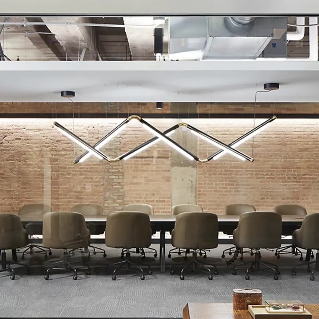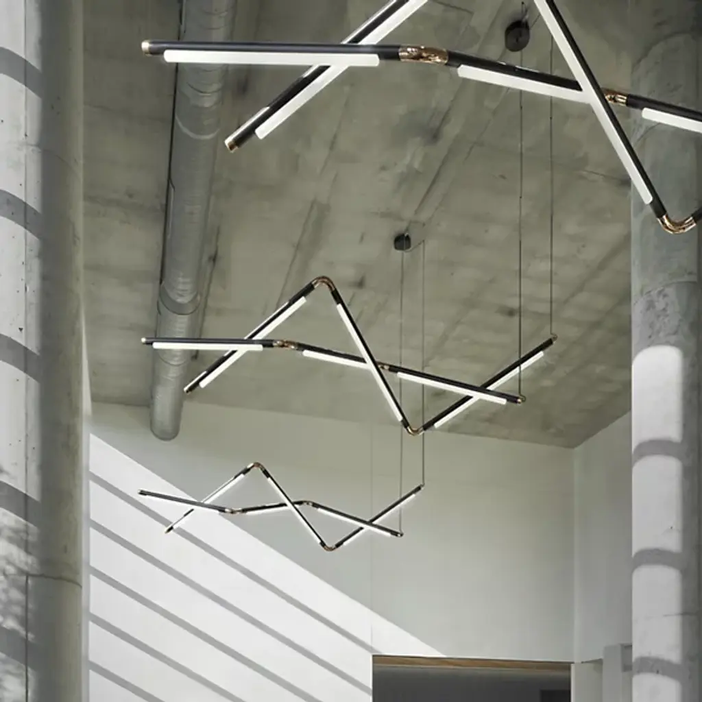 The Pipeline CM9 LED Linear Suspension by AND light is a intricate, detailed fixture that twists the pieces of aluminum around one another, creating a delicate fixture. The linear suspension light is made from both aluminum and acrylic and can be customized with a variety of colors and color temperatures. The linear suspension light creates indirect downlighting.