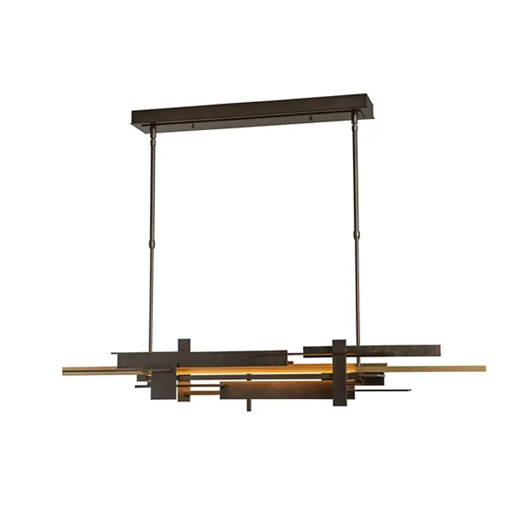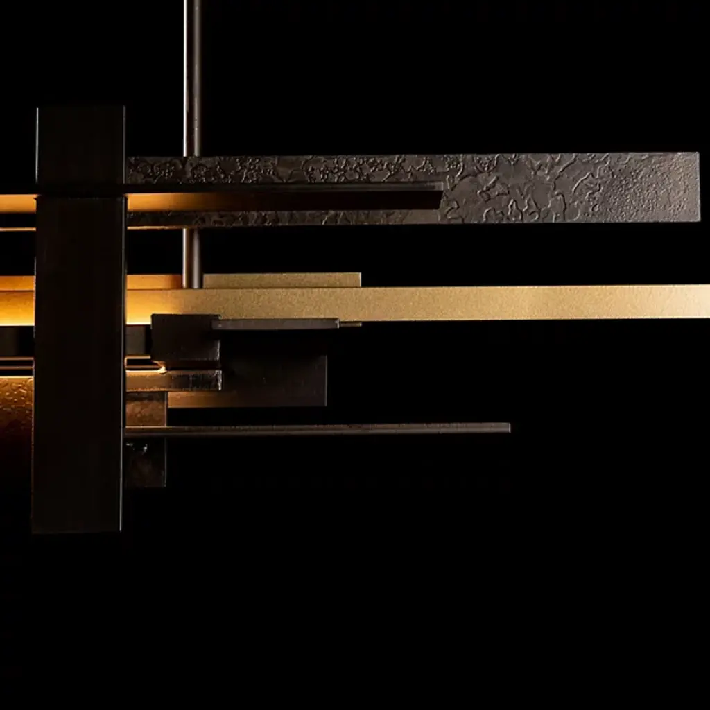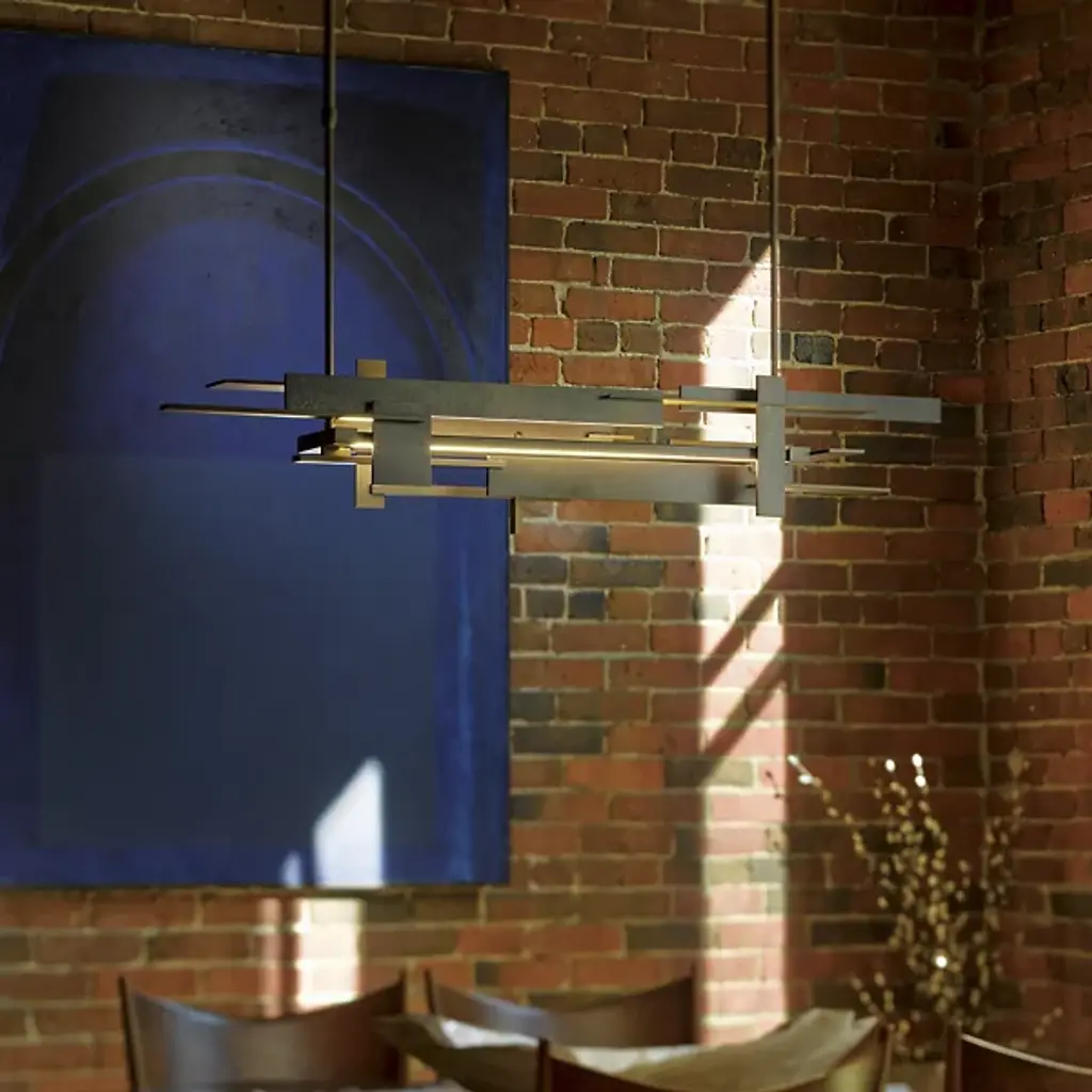 With a strong, structural design evoking iconic architecture, the Planar LED Linear Suspension from Hubbardton Forge brings contemporary style to the home. This mesmerizing fixture draws inspiration from Frank Lloyd Wright’s iconic 1930s Fallingwater home. A rectangular canopy drops twin downrods to a flat LED housing. A series of hand-forged metal panels surround the housing to form an asymmetrical, yet balanced, silhouette that hold and reflect its light for a soft, ambient glow throughout.
