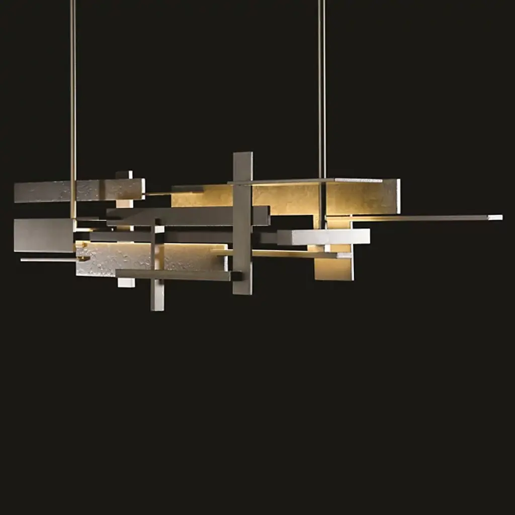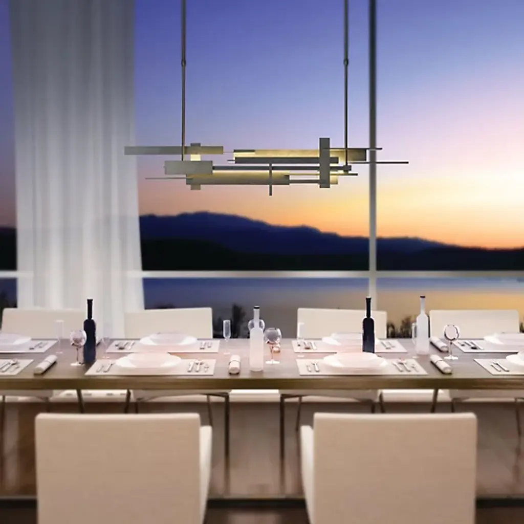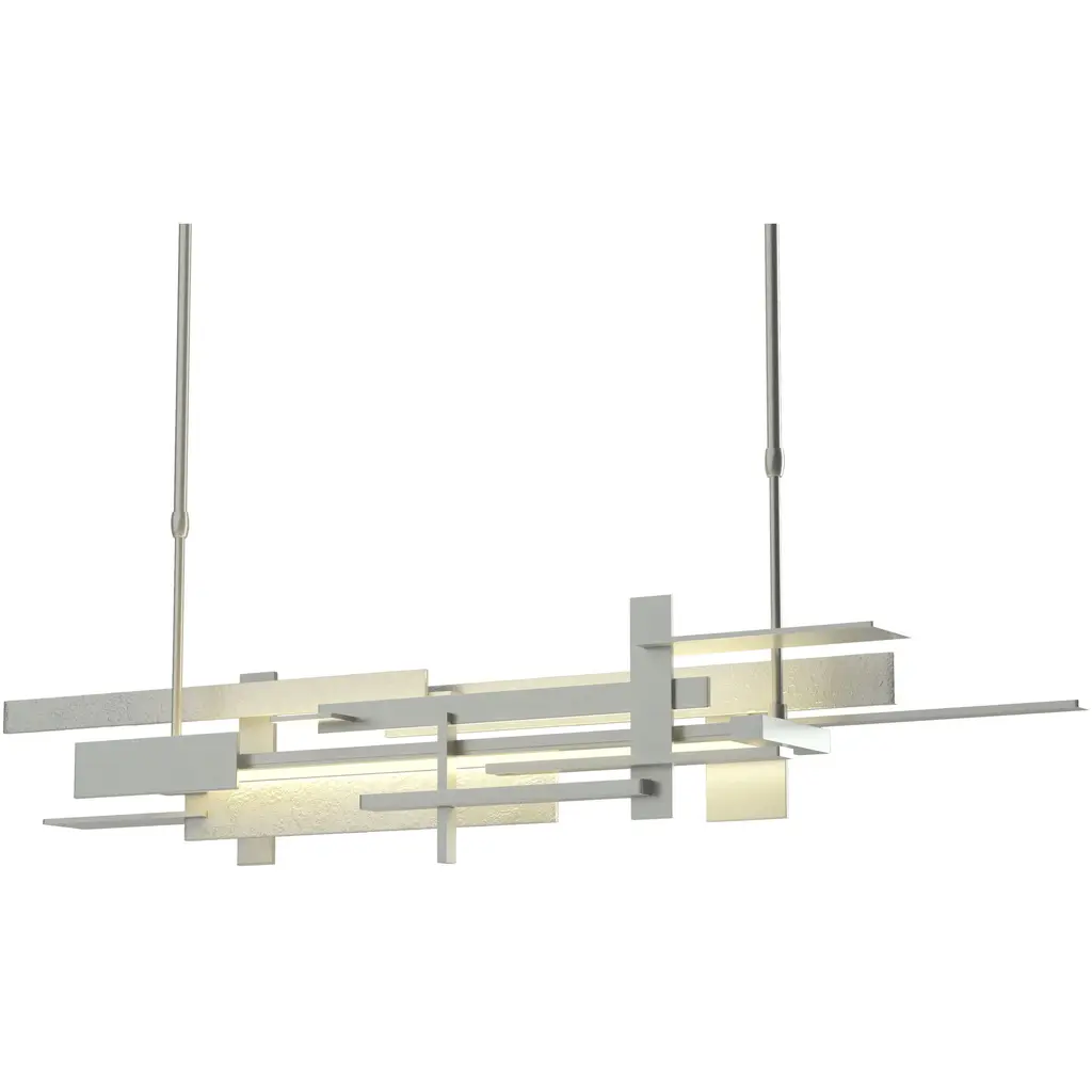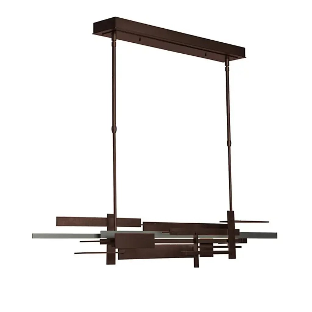 With a strong, structural design evoking iconic architecture, the Planar LED Linear Suspension from Hubbardton Forge brings contemporary style to the home. This mesmerizing fixture draws inspiration from Frank Lloyd Wright’s iconic 1930s Fallingwater home. A rectangular canopy drops twin downrods to a flat LED housing. A series of hand-forged metal panels surround the housing to form an asymmetrical, yet balanced, silhouette that hold and reflect its light for a soft, ambient glow throughout.