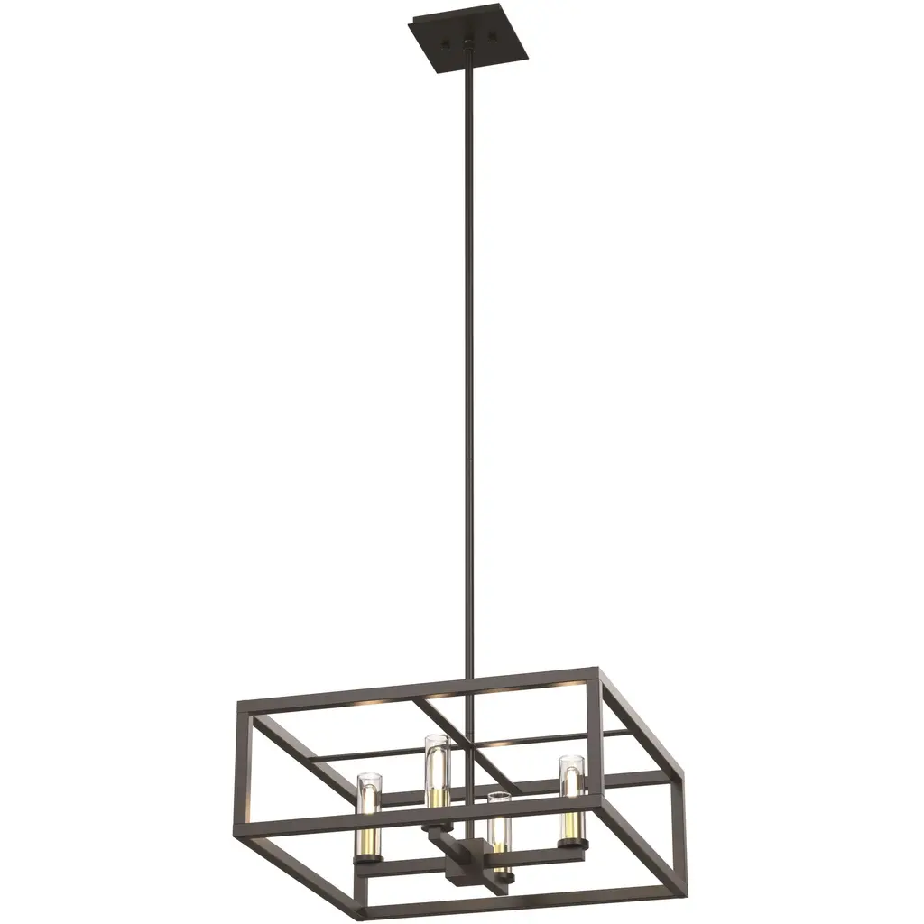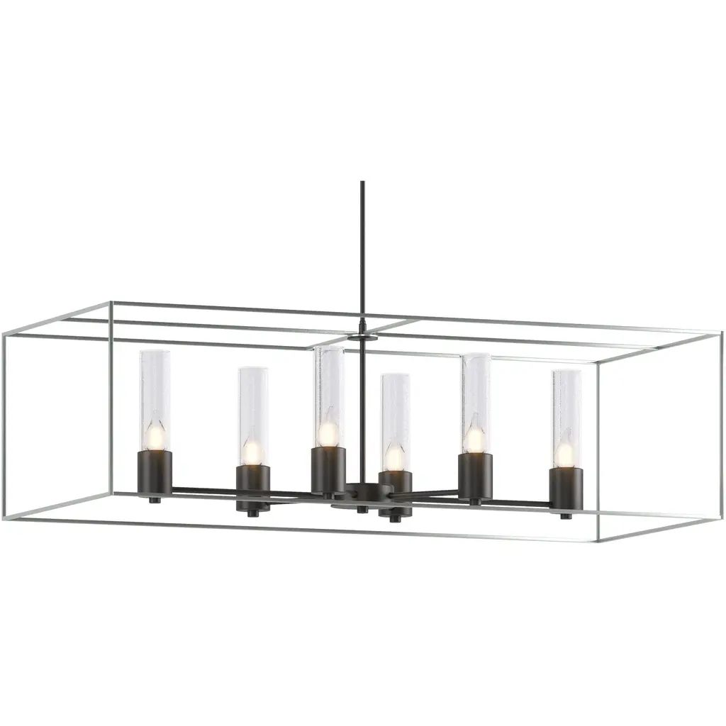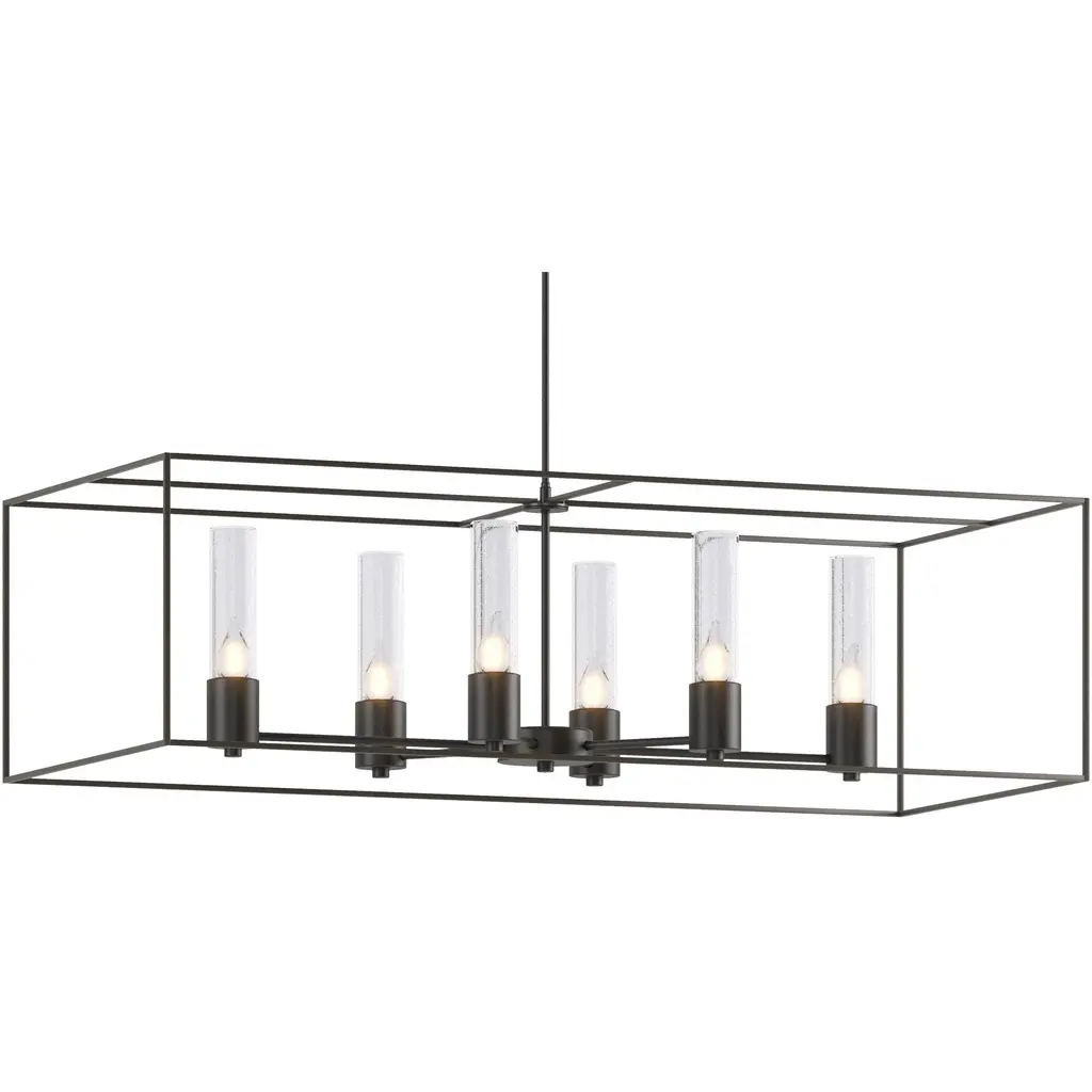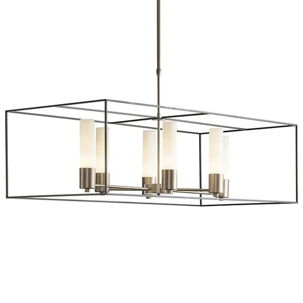 The Portico Linear Suspension by Hubbardton Forge features clean architectural lines combined with hand blown glass to gently diffuse the illumination. The airy open box design is anchored by a series of sturdy glass cylinders, choose from a selection of glass styles to suit your established motif. The bulbs illuminate from within the glass, lighting the space with a modern twist on traditional concepts. This highly versatile piece also offers a two tone finish option, or choose a matching finish for both the frame and candelabra for a cohesive look. The architectural design has a modern vibe, yet will still enhance a number of interior decor styles with its minimal flair.