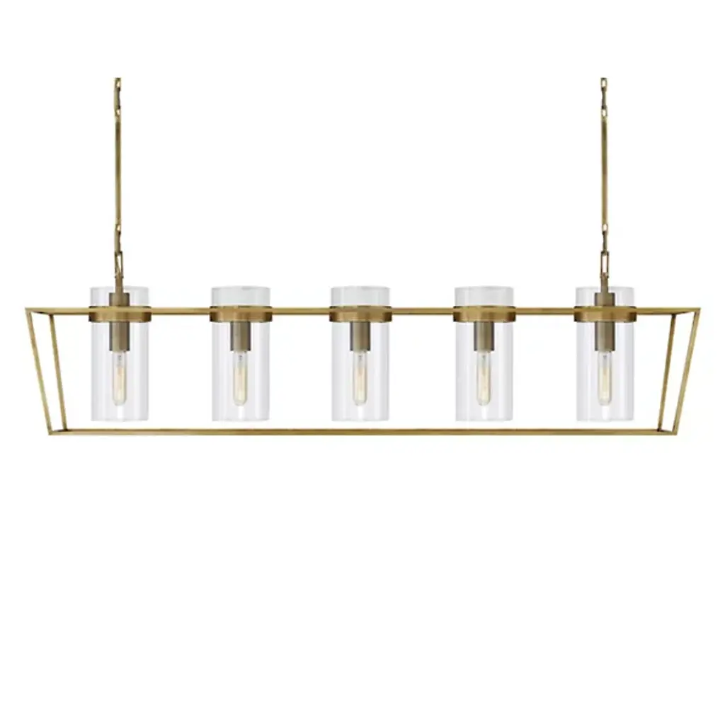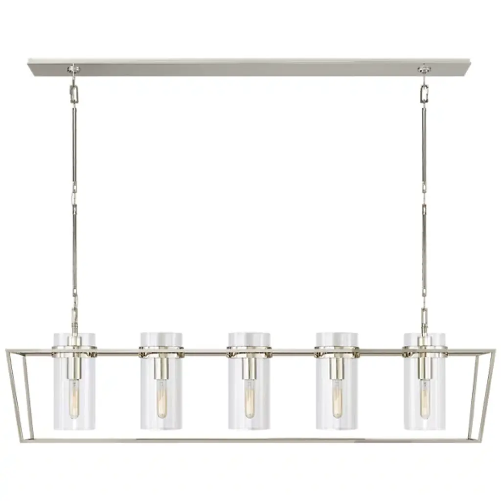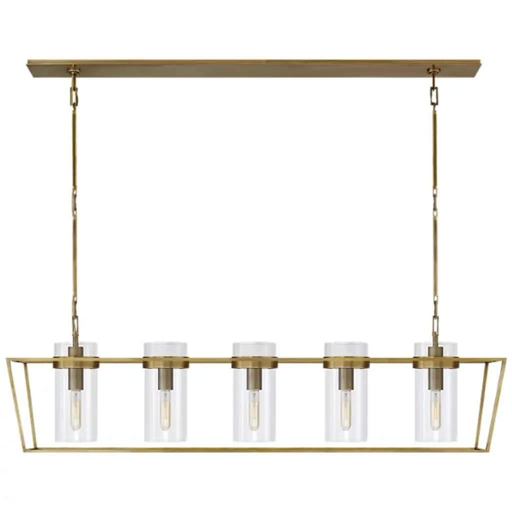 A balance of classic and contemporary styles, the Presidio 5-Light Linear Suspension by Visual Comfort Signature, formerly known as Visual Comfort, is a welcoming addition to any living space. Designed by Ian K. Fowler, it boasts a striking frame that’s suspended from two sturdy cords and encompasses a line of gorgeous clear glass cylinder shades. Available in multiple finishes, this fixture delivers a strong yet relaxing glow that’s ideal for an eat-in kitchen or dining room.