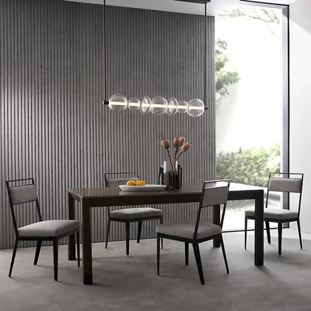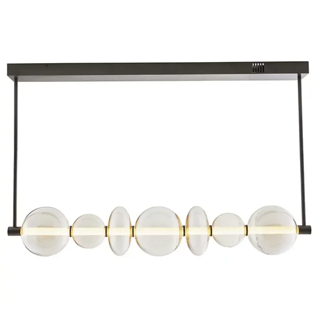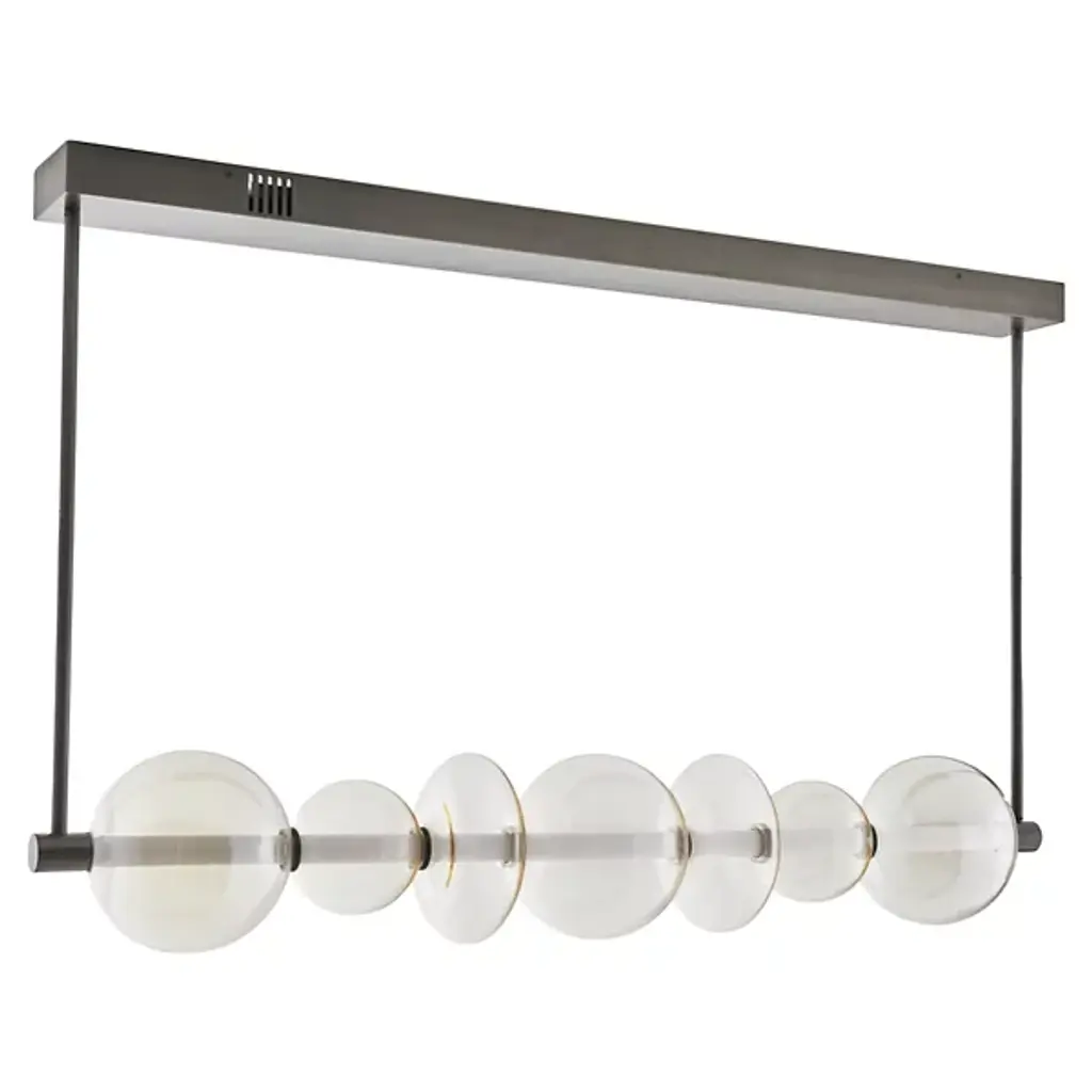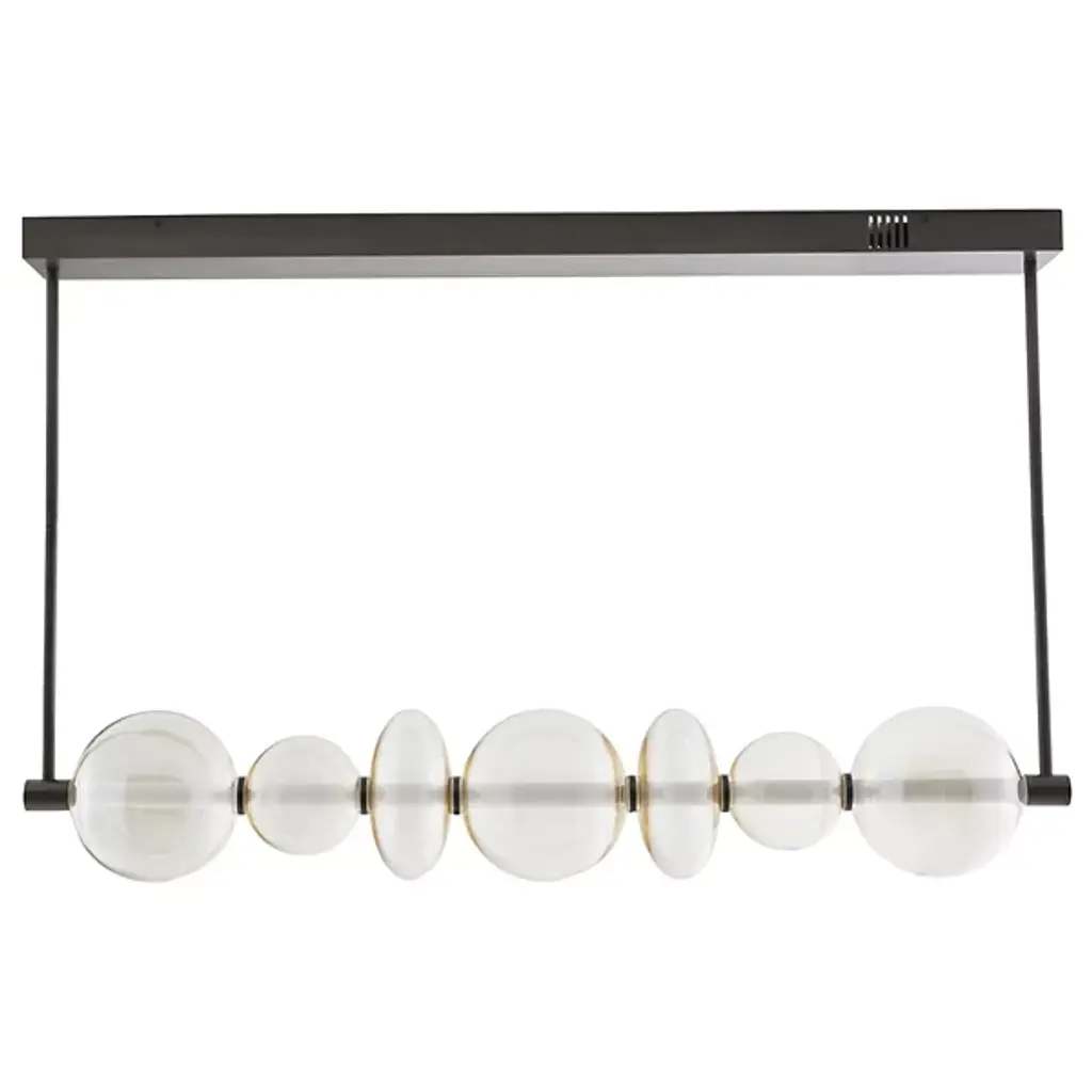 The Raphael LED Linear Suspension from Arteriors leads the eyes from one side to the other like charming beads on a string. The wide-spanning piece gives attention to each edge of one’s table surface below. It sets a refined tone with a low-profile canopy and graphic suspension. The metal hardware’s finish adds a punch of beautiful contrast. Tubular acrylic diffusers flow from one side to the other, concealing the LEDs for minimal glare. Glass globes of various sizes sandwich together in a smile-worthy silhouette. These globes receive lively highlights as a uniform LED light shoots past.