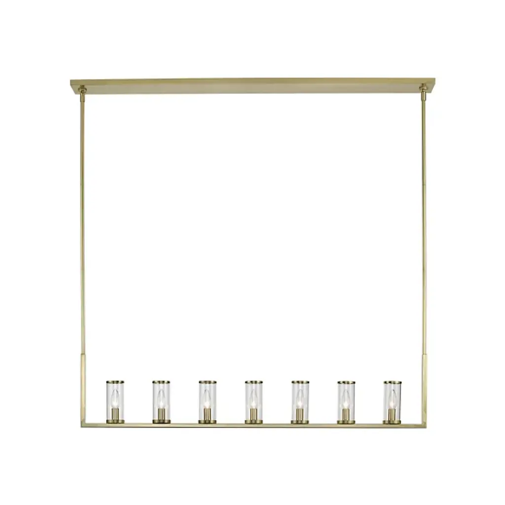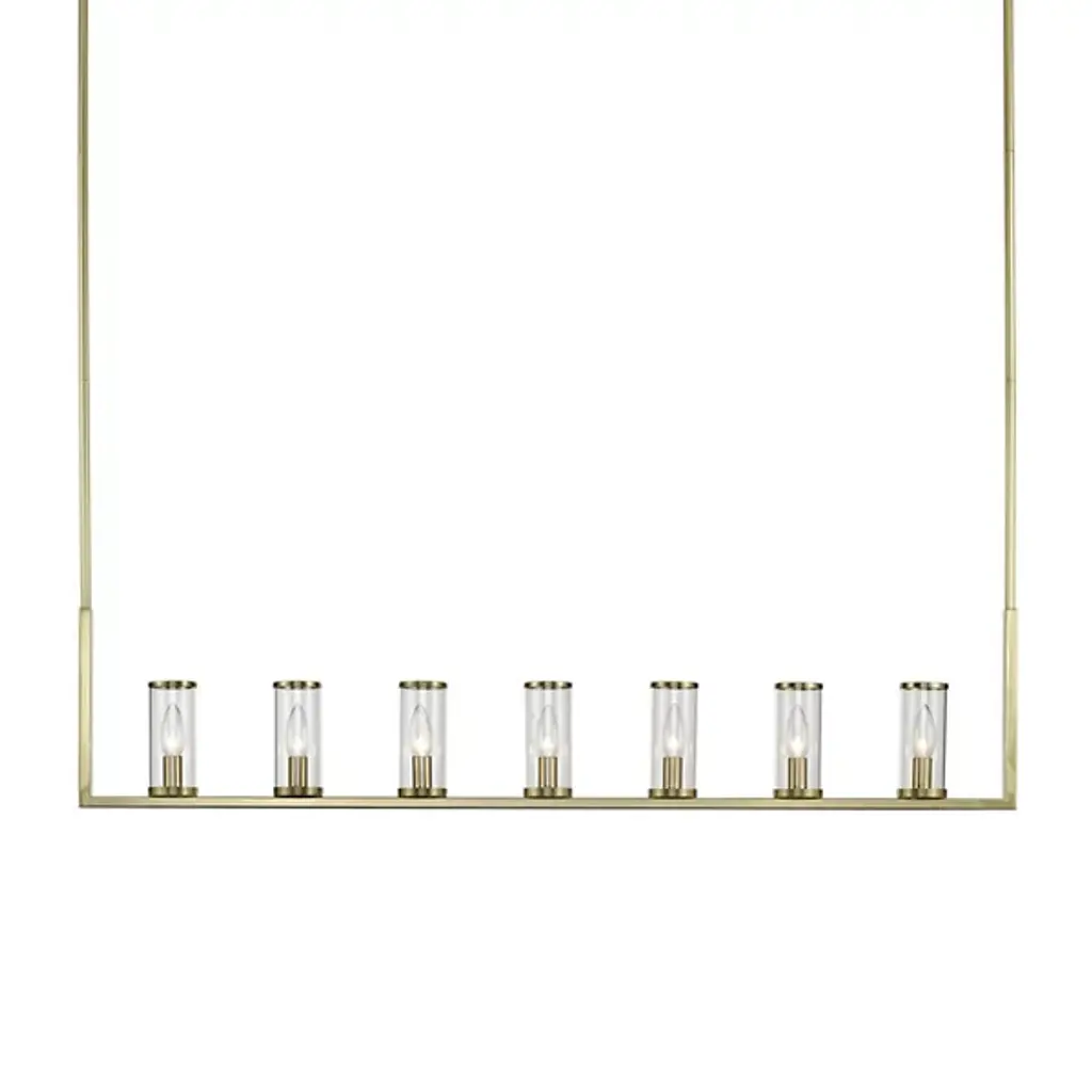 Luxurious décor at the center of it all. The Revolve Linear Suspension by Alora Lighting presents a refined glamour through its subtle shapes and clean lines. Its rectangular steel canopy drops two stems from each far end, suspending a narrow bar of equal width. Clear glass cylinders with steel-capped rims surround candelabra-style lamping, arranged in a linear formation to create a symmetrical display that lends a beautifully balanced glow over its environment.
