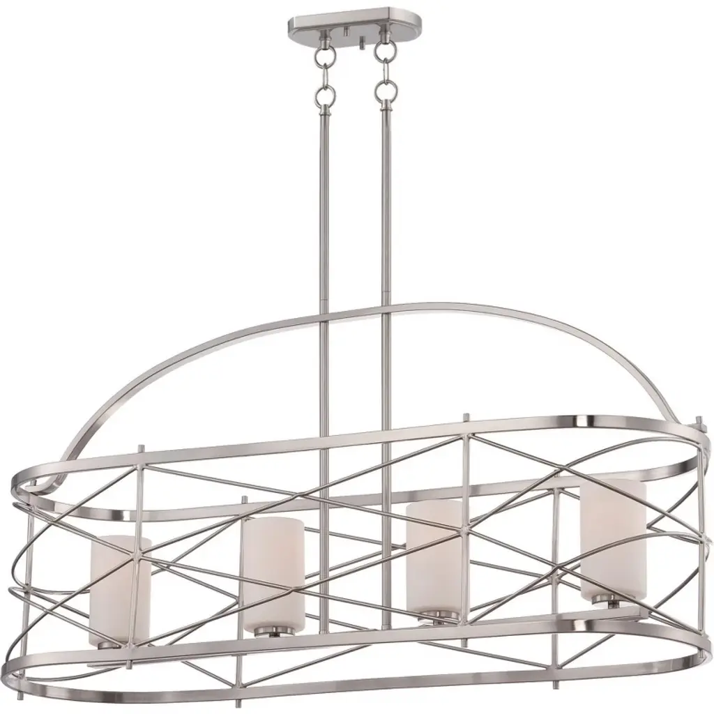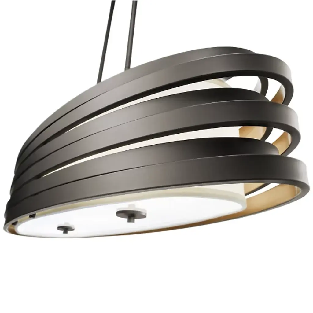 A fresh take on a linear suspension, the Kichler Roswell Oval Linear Suspension features the long lines of a more traditional fixture with a rounded, elliptical silhouette. Around the Off White linen fabric shade, six flattened metal rings are stacked in an offset pattern, creating a sense of dynamic motion. Effective task lighting pours from beneath the shade through a Satin Etched glass diffuser.