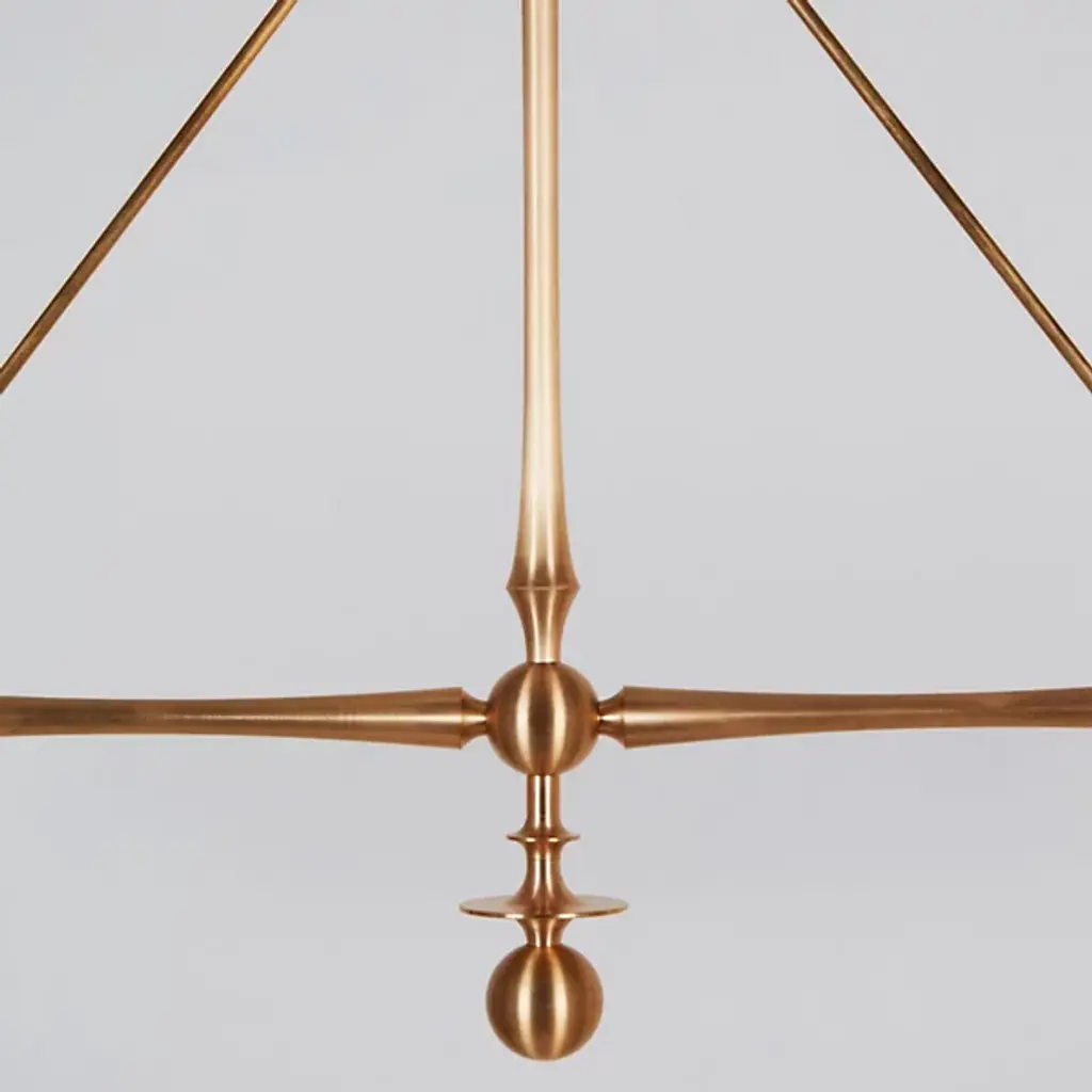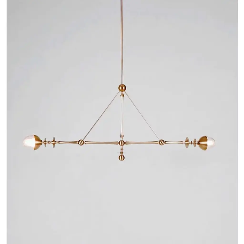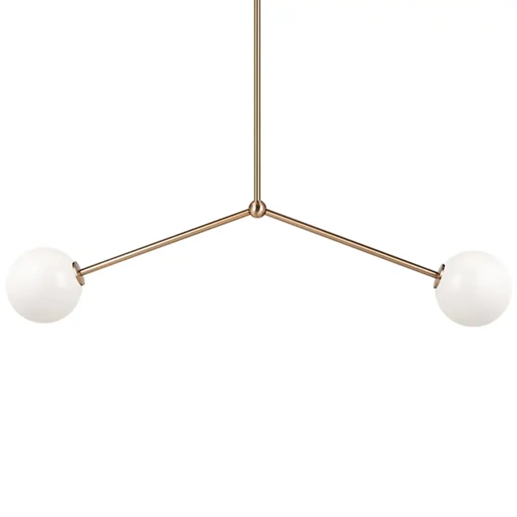 The Rue Sala Two Arm LED Pendant from Roll & Hill is a sloped-ceiling adaptable fixture designed by Jessica Helgerson, who pays tribute to summers spent in Lyon, France, taking inspiration from bronze statuettes and Louis XVI furniture. This pendant is composed of white oak, brass, and bone china. It gives your living space a contemporary look. Its integrated LED emanates a brilliant glow that can be dimmed using a separately sold ELV dimmer.