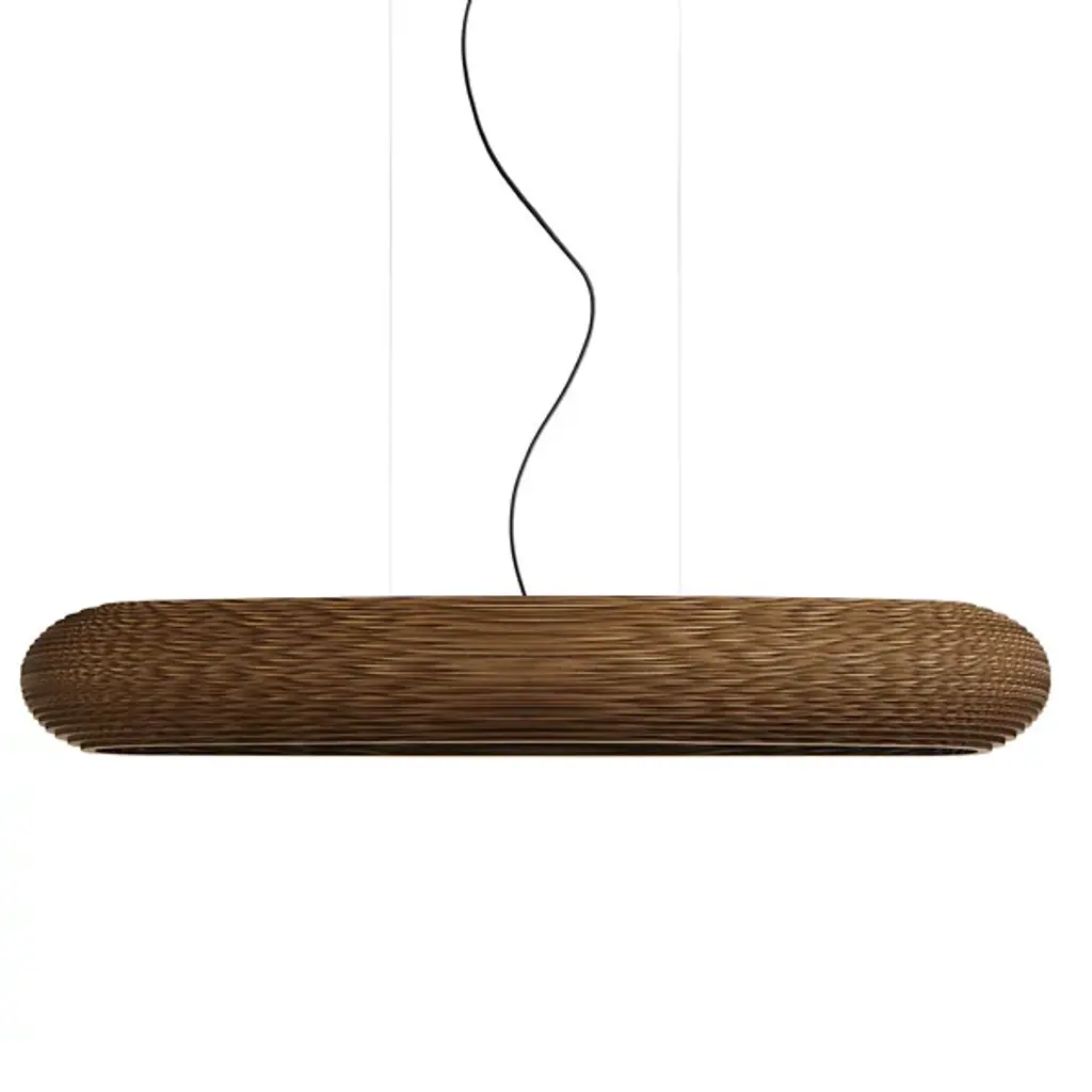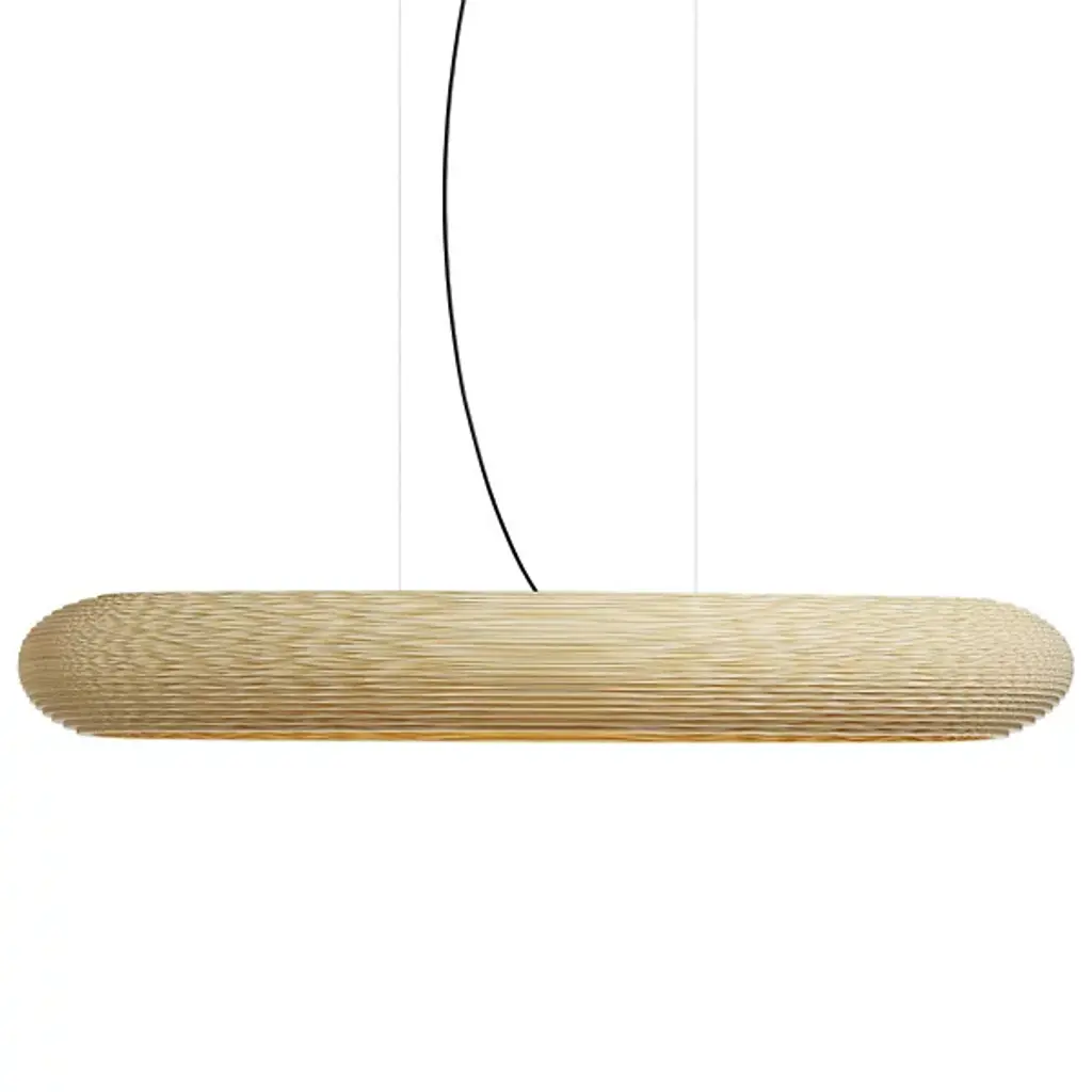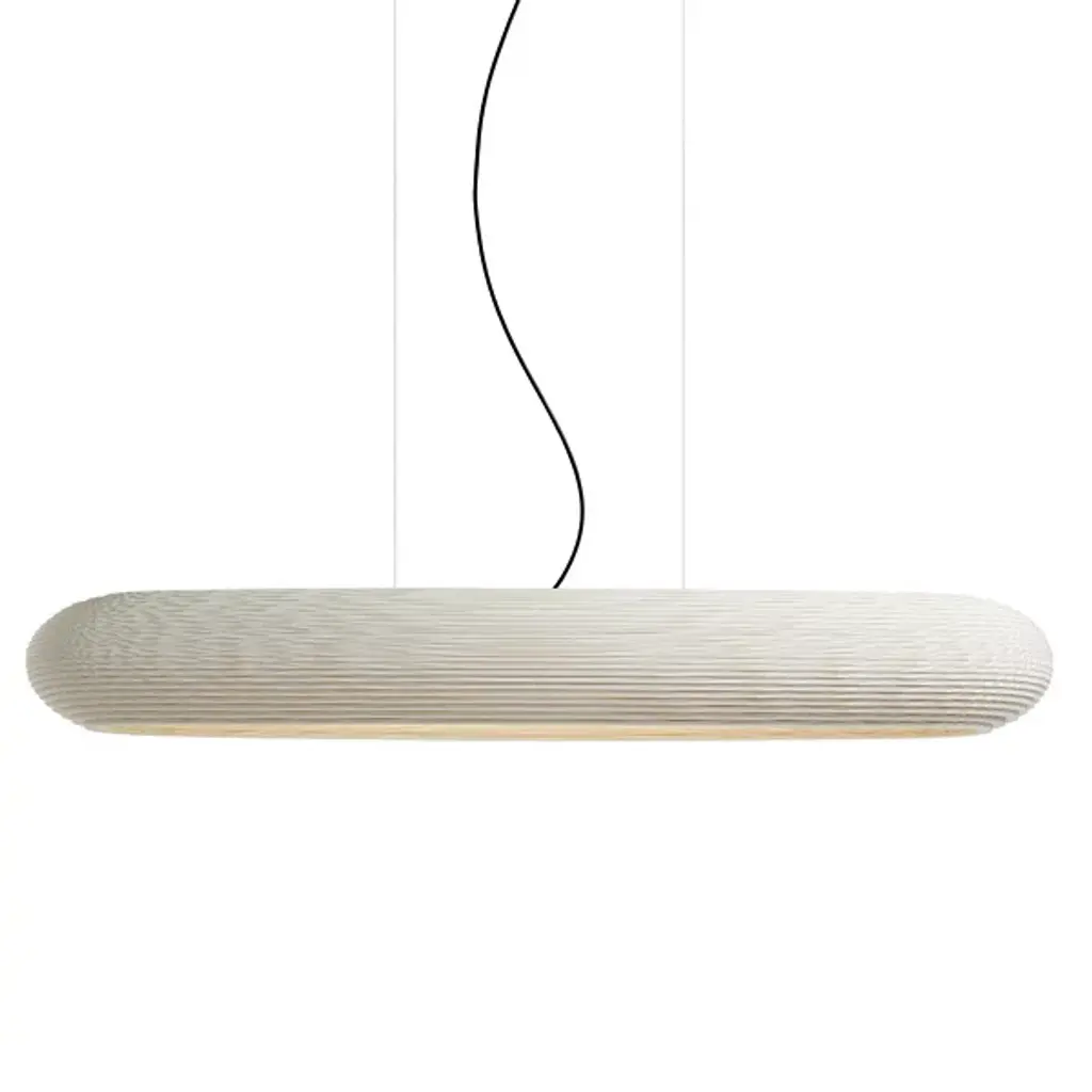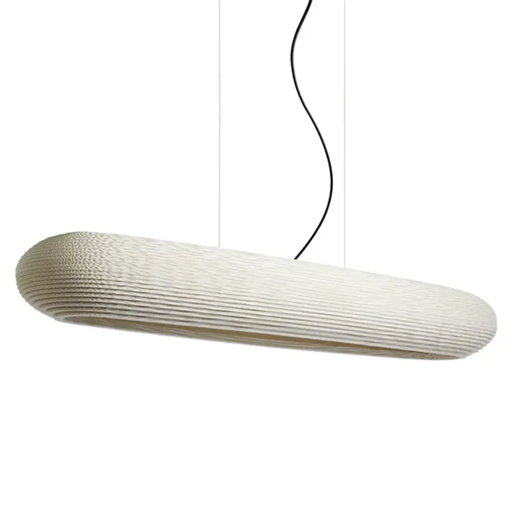 Improve large inside spaces with the layered, sculptural appeal of the Scraplights Disc LED Linear Suspension from Graypants. A capsule-shaped offering assembled from rounded “Steps” of recycled cardboard, each lamp is hand-assembled, and each concentric level is laser-cut, building a side pierced by corrugated textures, allowing the glow from the inner LED lamping to sparkle through small holes when lit. Whether lit or unlit, its ethereal suspension via slim cables makes this large fixture appear to float, ethereally suspended to add a welcome touch of appealing design above.