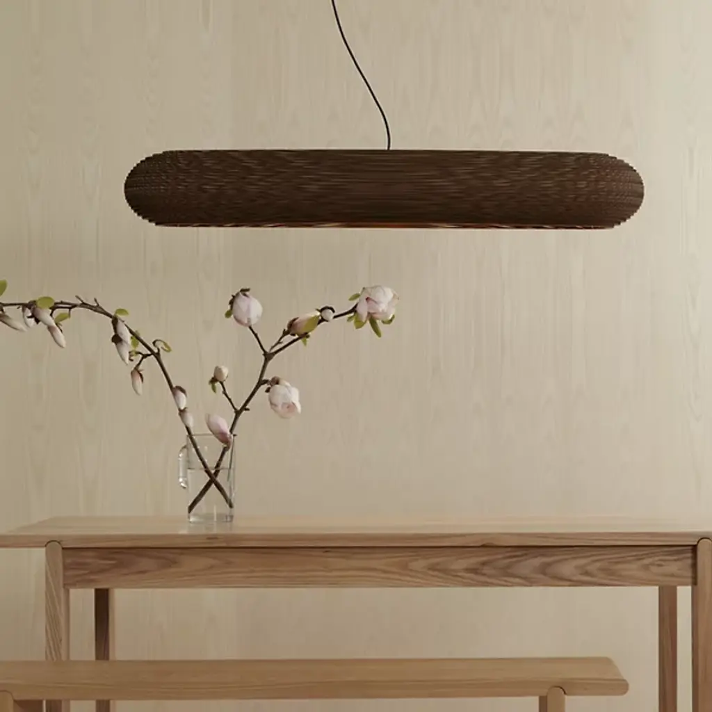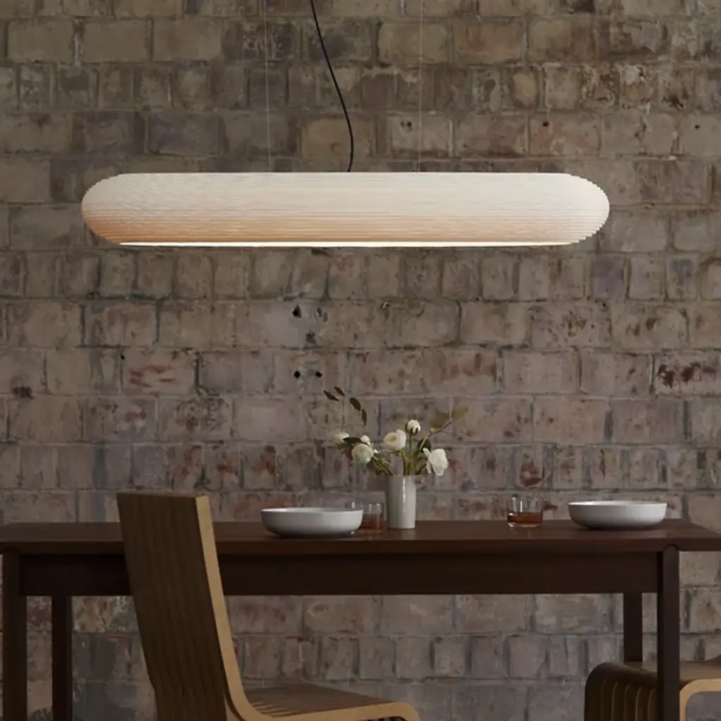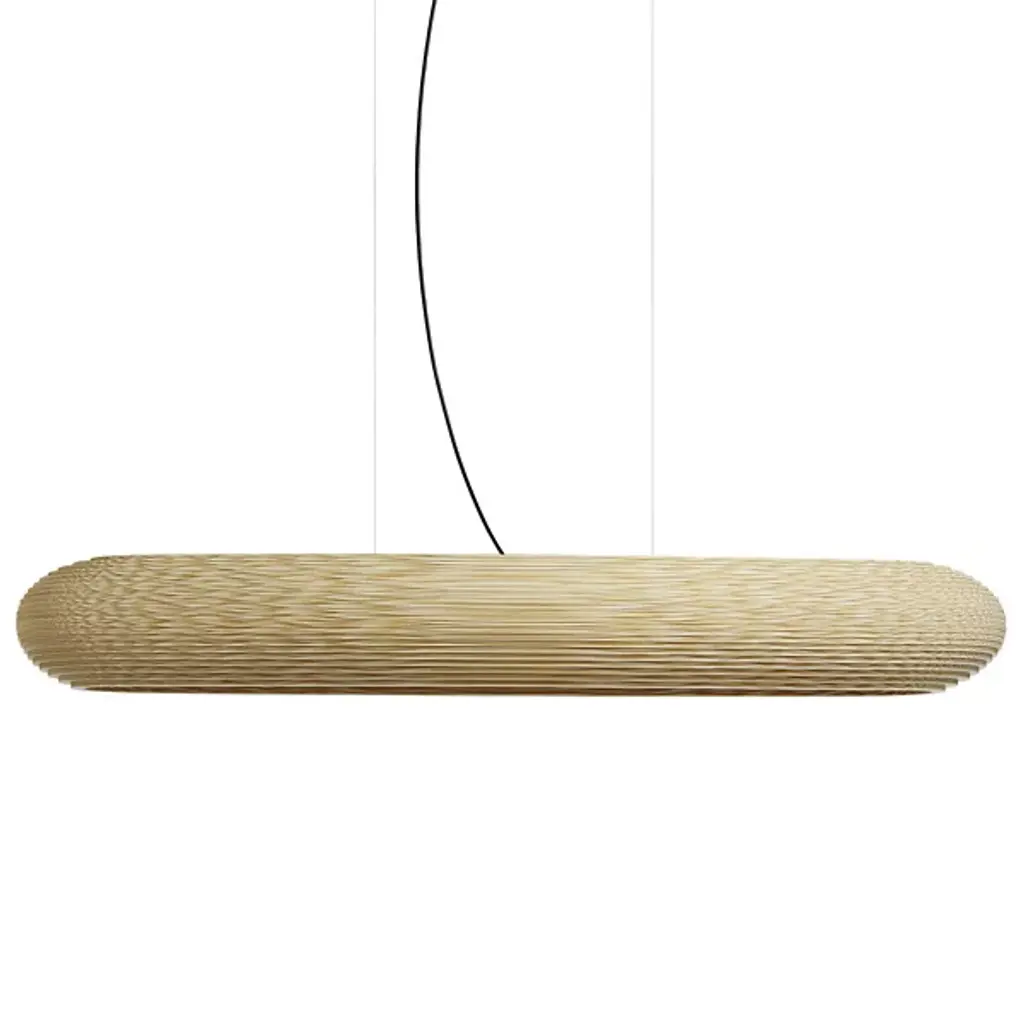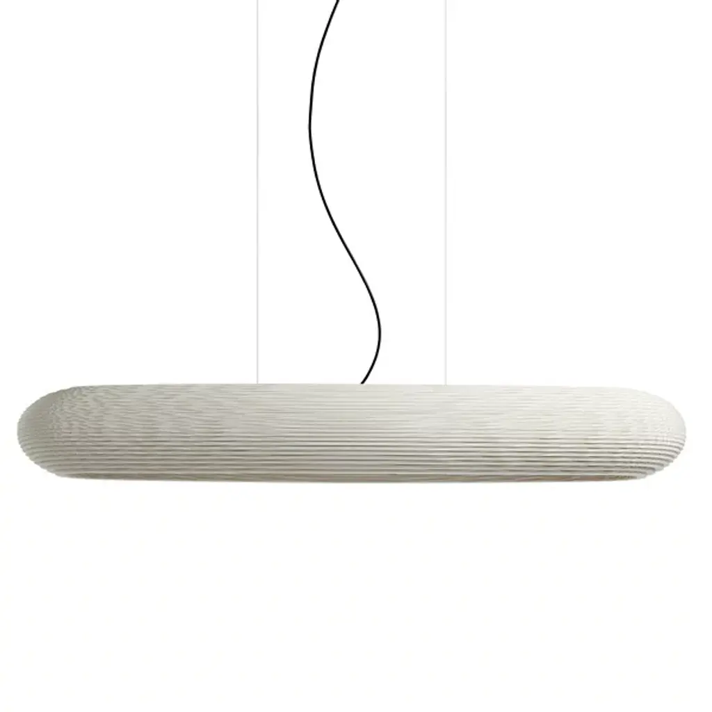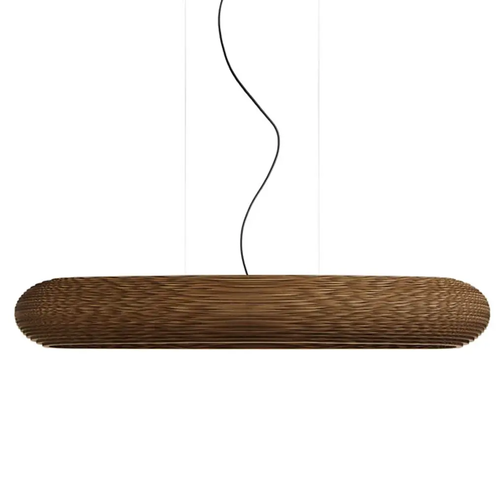 Improve large inside spaces with the layered, sculptural appeal of the Scraplights Disc LED Linear Suspension from Graypants. A capsule-shaped offering assembled from rounded “Steps” of recycled cardboard, each lamp is hand-assembled, and each concentric level is laser-cut, building a side pierced by corrugated textures, allowing the glow from the inner LED lamping to sparkle through small holes when lit. Whether lit or unlit, its ethereal suspension via slim cables makes this large fixture appear to float, ethereally suspended to add a welcome touch of appealing design above.
