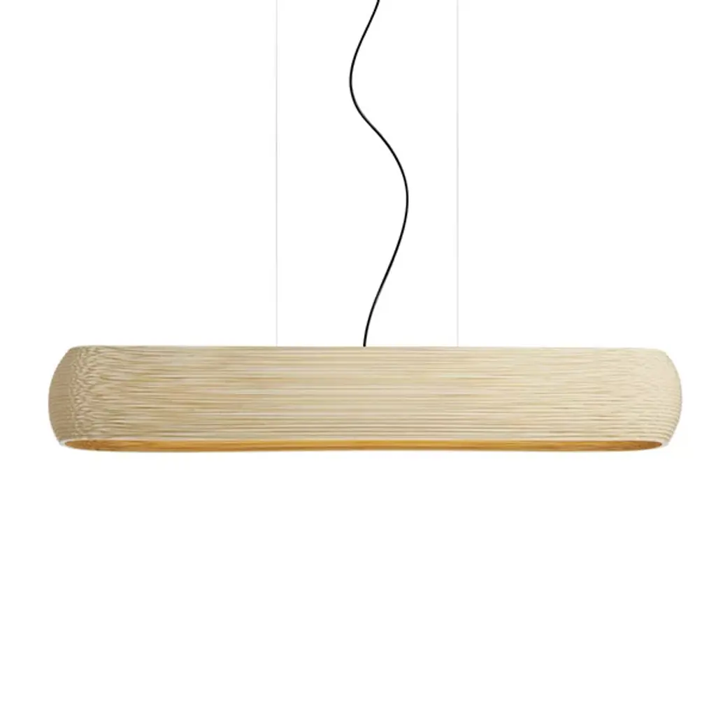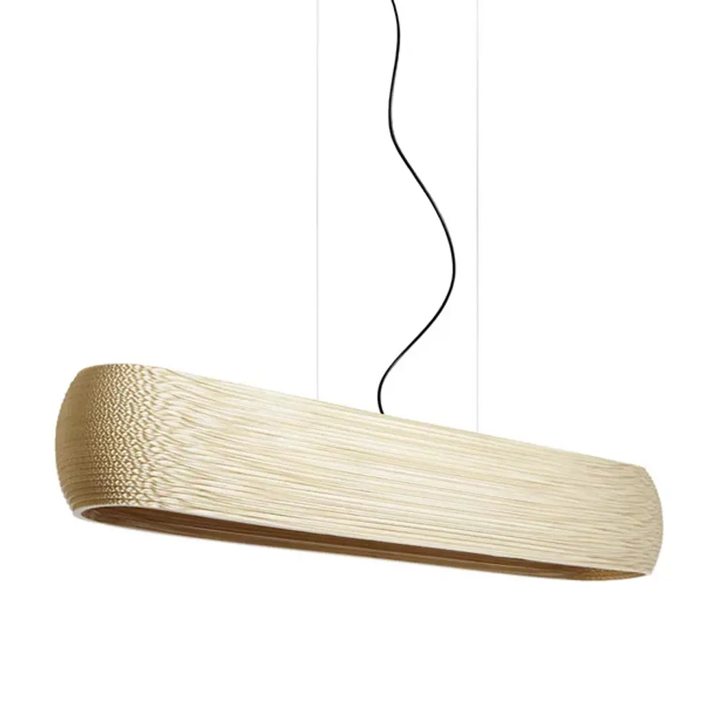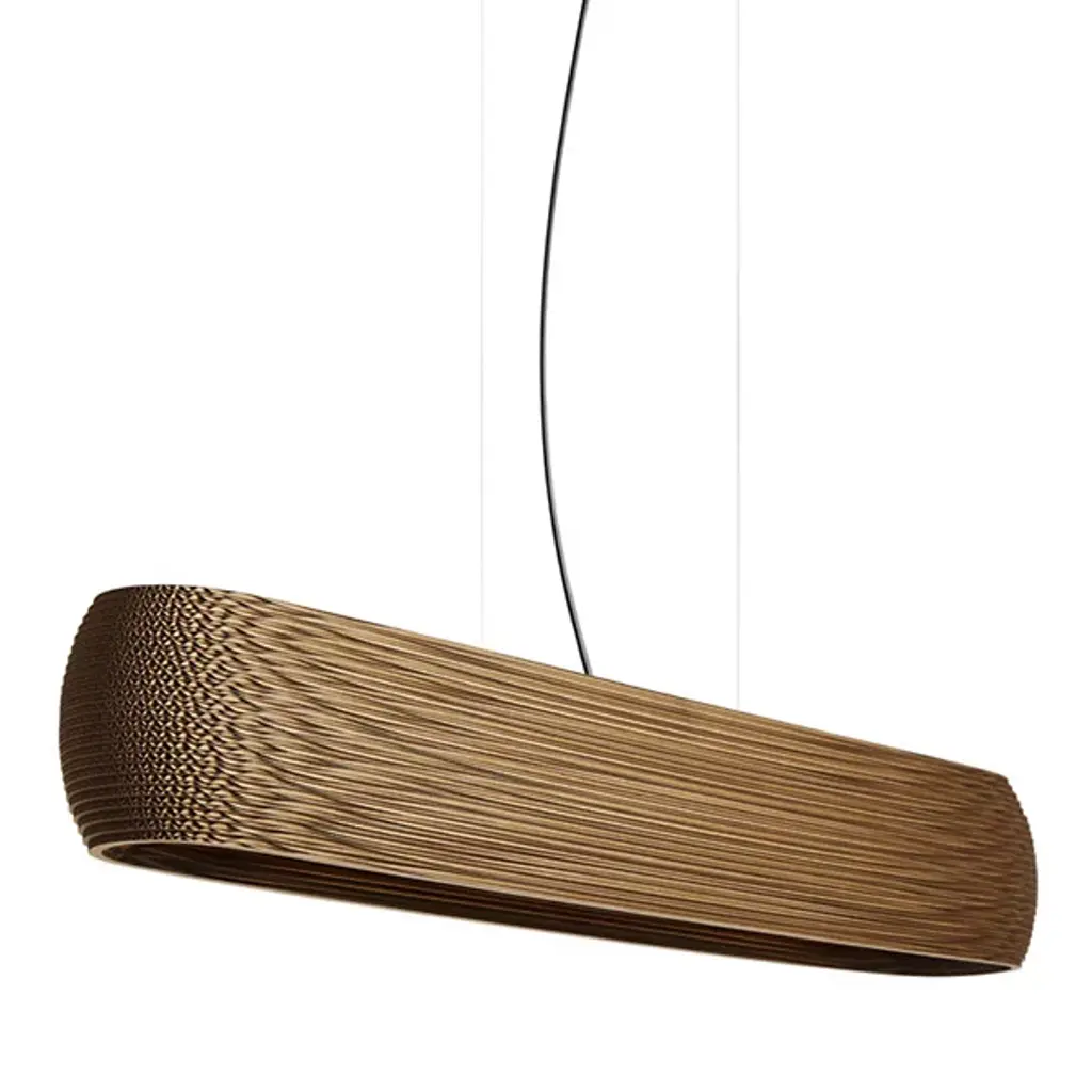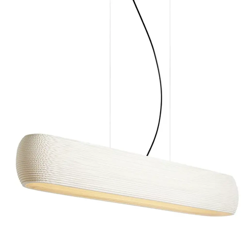 The Scraplights Oliv LED Linear Suspension from Graypants presents contemporary simplicity paired with a playful organic shape. Suspended from a slim canopy via slim cables in parallel, it ensconces strong, energy-friendly LED lamping inside an oval shade of stacked laser-cut cardboard layers joined by a non-toxic adhesive. The cardboard is recycled and sustainable, treated with a fire retardant to make it safe, and moderates bright glare to a warm and pleasant glow that washes out through the sides, crowning and surrounding direct light cast below.