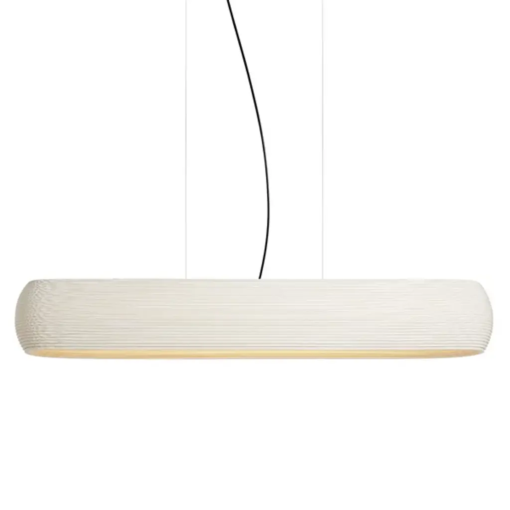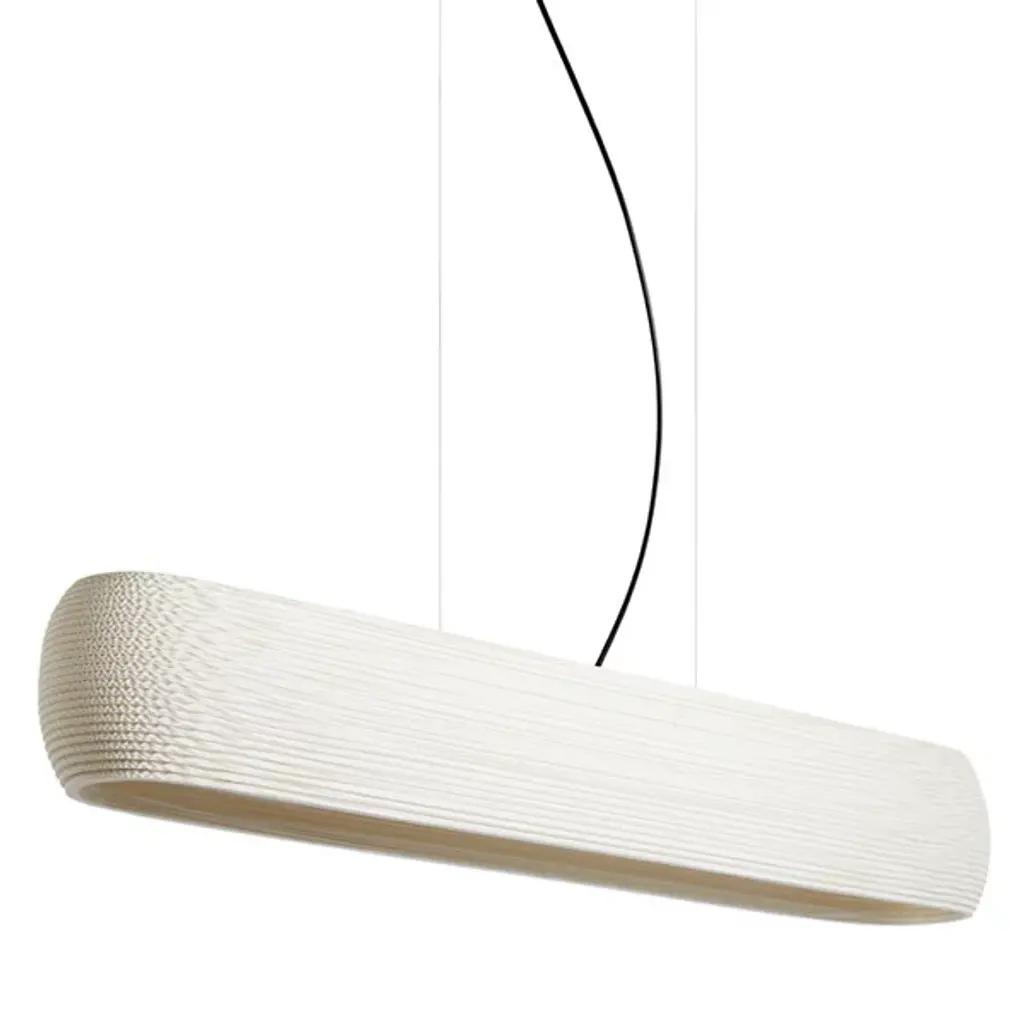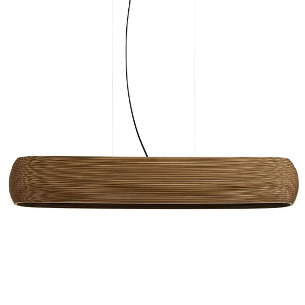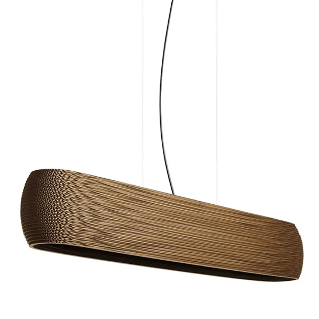 The Scraplights Oliv LED Linear Suspension from Graypants presents contemporary simplicity paired with a playful organic shape. Suspended from a slim canopy via slim cables in parallel, it ensconces strong, energy-friendly LED lamping inside an oval shade of stacked laser-cut cardboard layers joined by a non-toxic adhesive. The cardboard is recycled and sustainable, treated with a fire retardant to make it safe, and moderates bright glare to a warm and pleasant glow that washes out through the sides, crowning and surrounding direct light cast below.