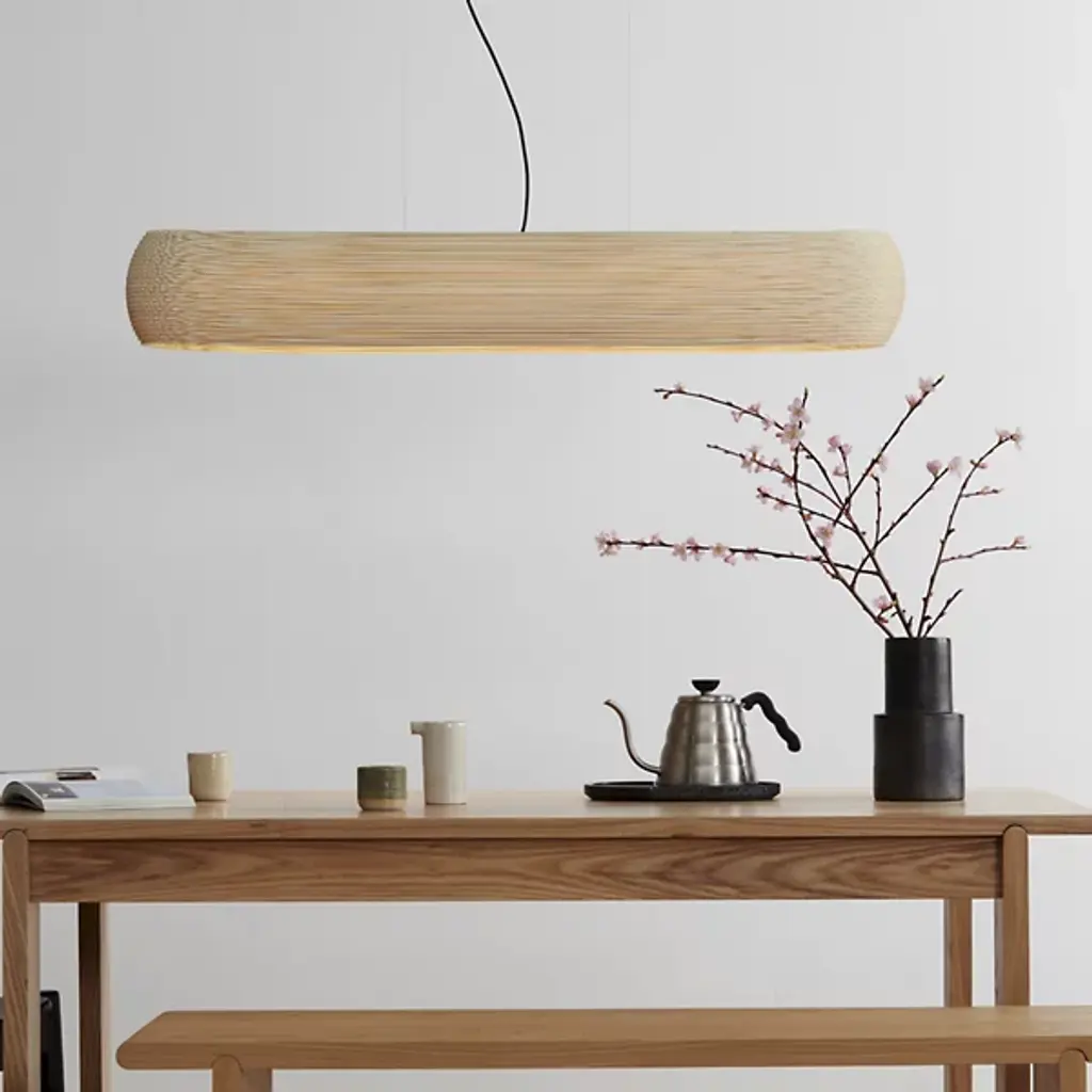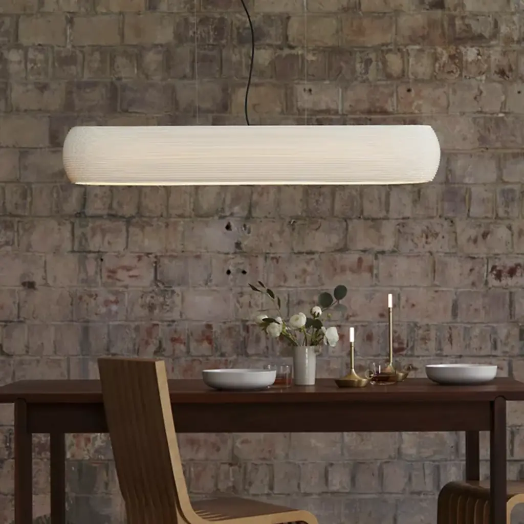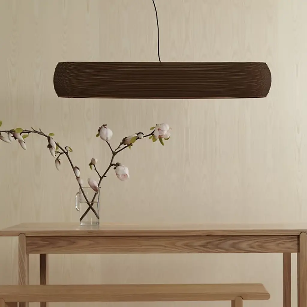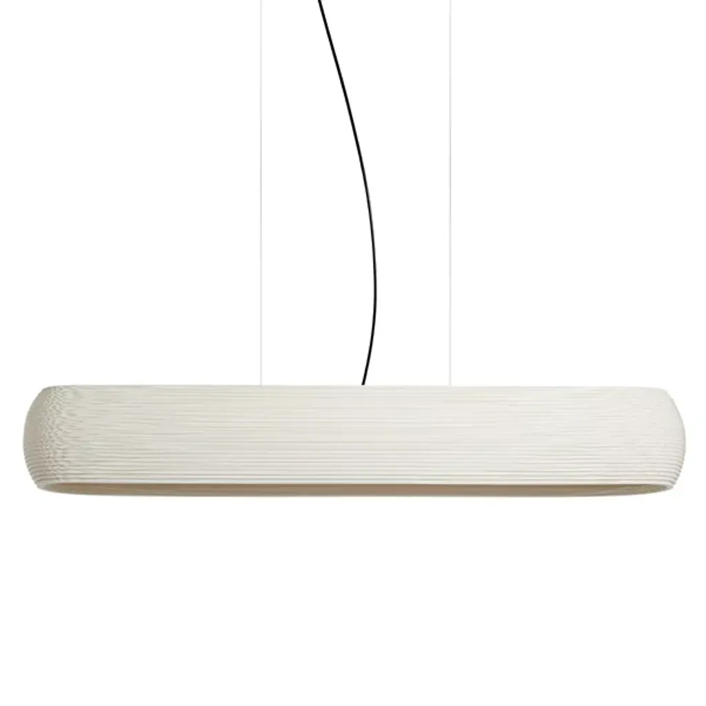 The Scraplights Oliv LED Linear Suspension from Graypants presents contemporary simplicity paired with a playful organic shape. Suspended from a slim canopy via slim cables in parallel, it ensconces strong, energy-friendly LED lamping inside an oval shade of stacked laser-cut cardboard layers joined by a non-toxic adhesive. The cardboard is recycled and sustainable, treated with a fire retardant to make it safe, and moderates bright glare to a warm and pleasant glow that washes out through the sides, crowning and surrounding direct light cast below.