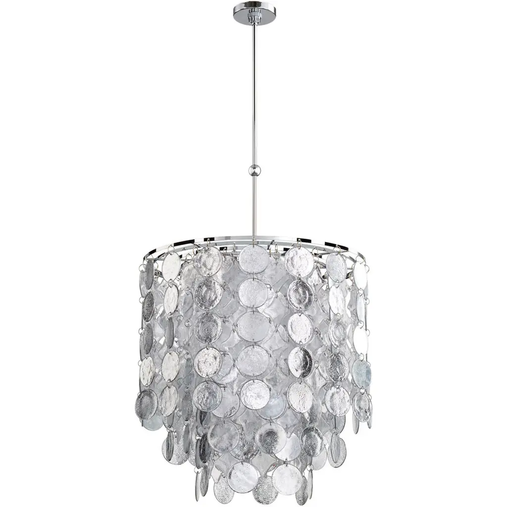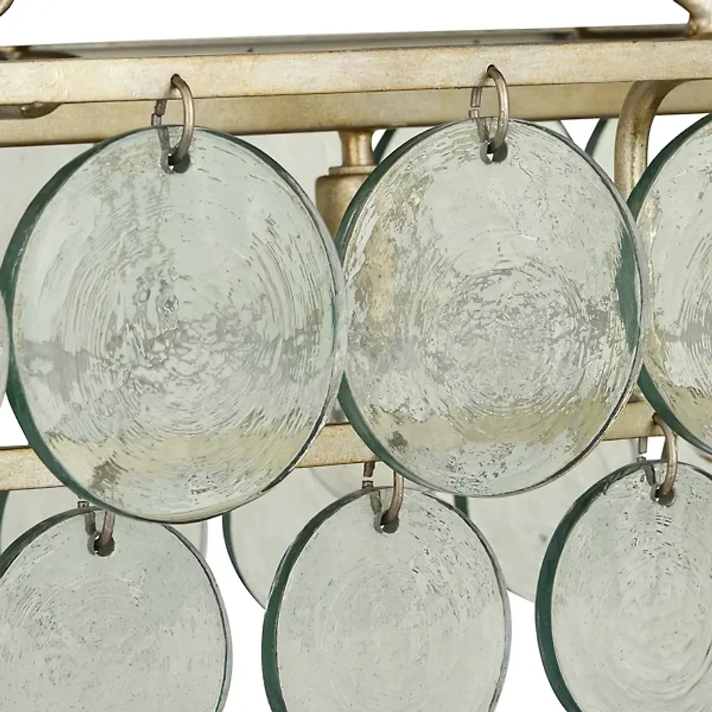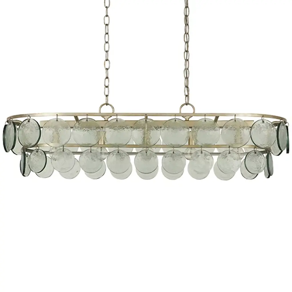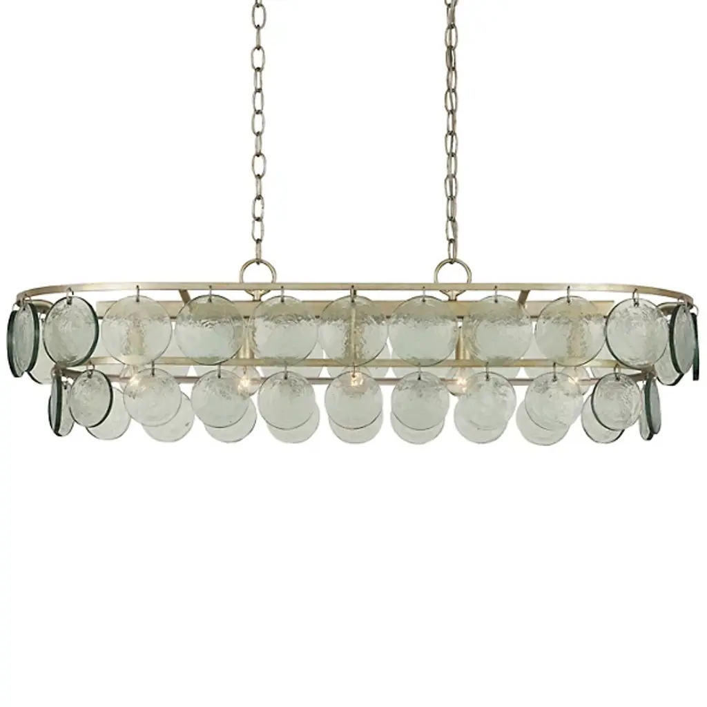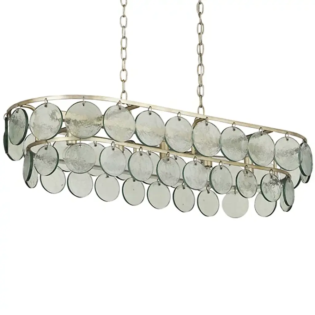 The Settat Linear Suspension by Currey & Company has recycled glass discs dangling from stacked oval ribs. This Chandelier’s light and airy design is seen throughout the minimal chains from which the light fixture hangs. The reflectivity of the glass gives this furnishment a feeling of sophistication and brings a contemporary aesthetic to your living space.