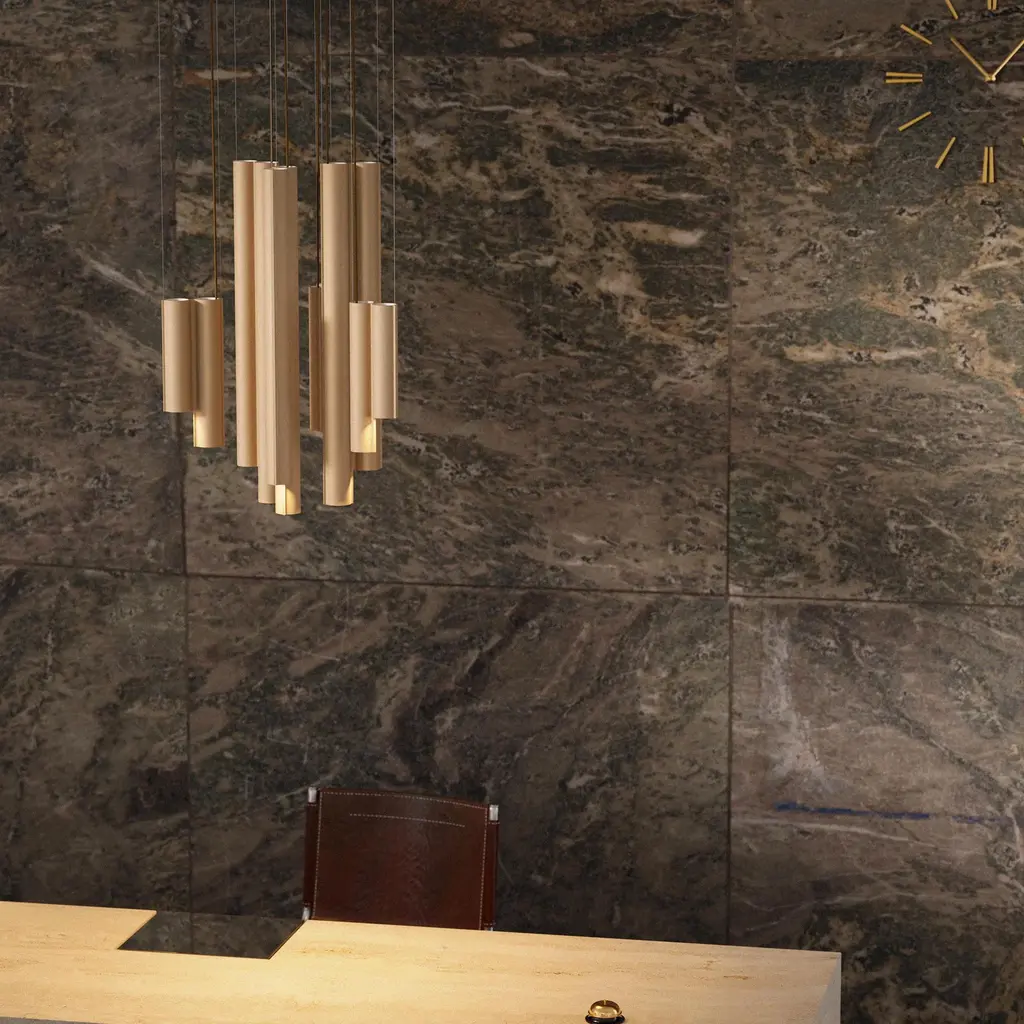 The Silo Atelier 03 Suspension Lamp is architectural lighting fixture that features custom-made aluminum extrusions. Its structure integrates 12 downlight sources, arranged to expand both vertically and horizontally, evoking the essence of brutalist architecture while maintaining a sleek and theatrical presence. The lamp is compatible with various dimming protocols, and offers a range of color temperatures with dim-to-warm functionality. Available in 5 finishes.