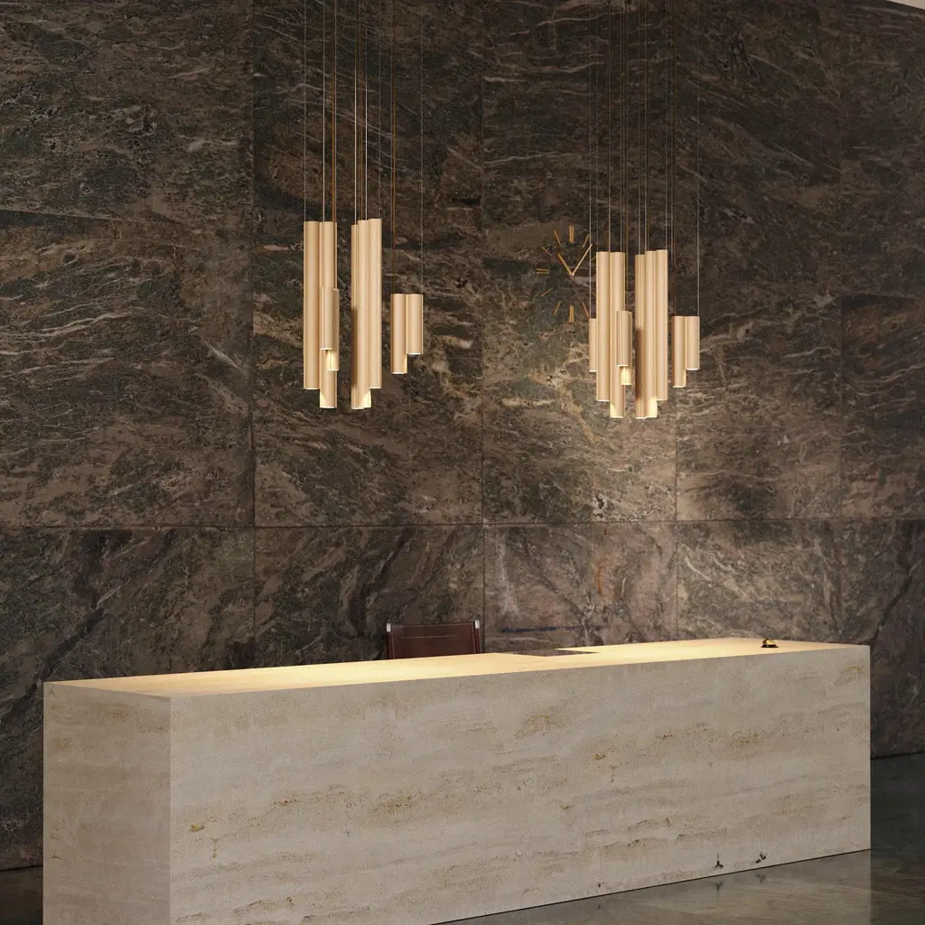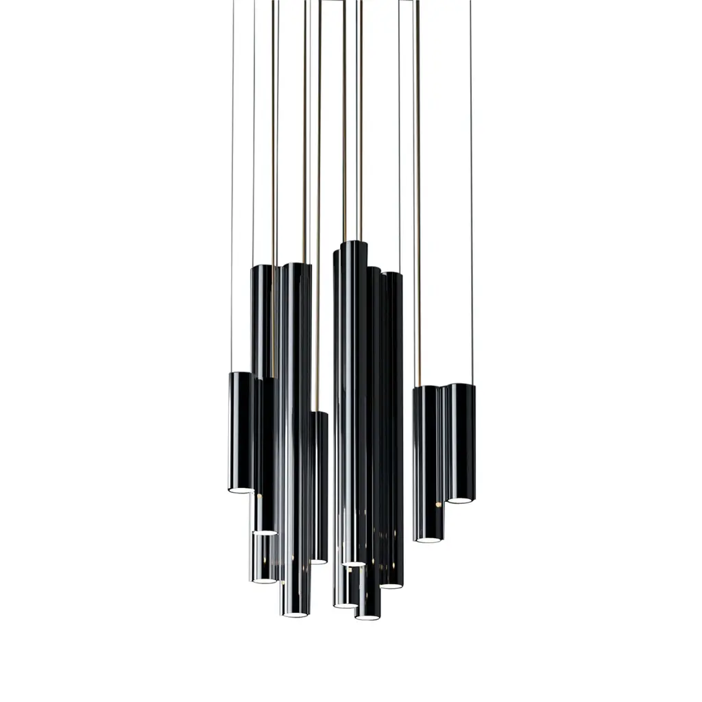 The Silo Atelier 03 Suspension Lamp is architectural lighting fixture that features custom-made aluminum extrusions. Its structure integrates 12 downlight sources, arranged to expand both vertically and horizontally, evoking the essence of brutalist architecture while maintaining a sleek and theatrical presence. The lamp is compatible with various dimming protocols, and offers a range of color temperatures with dim-to-warm functionality. Available in 5 finishes.