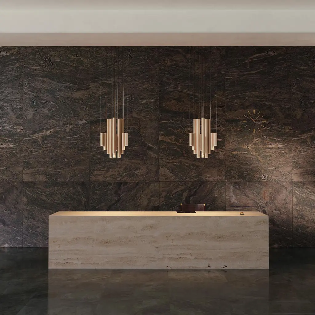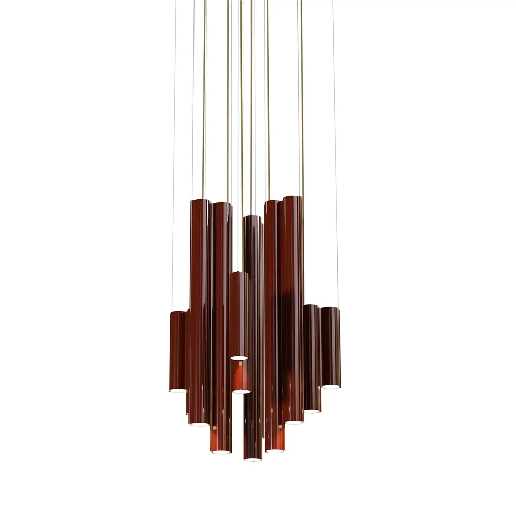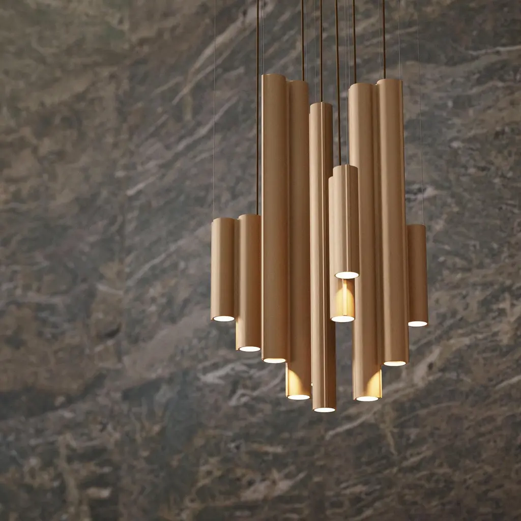 The Silo Atelier 03 Suspension Lamp is architectural lighting fixture that features custom-made aluminum extrusions. Its structure integrates 12 downlight sources, arranged to expand both vertically and horizontally, evoking the essence of brutalist architecture while maintaining a sleek and theatrical presence. The lamp is compatible with various dimming protocols, and offers a range of color temperatures with dim-to-warm functionality. Available in 5 finishes.