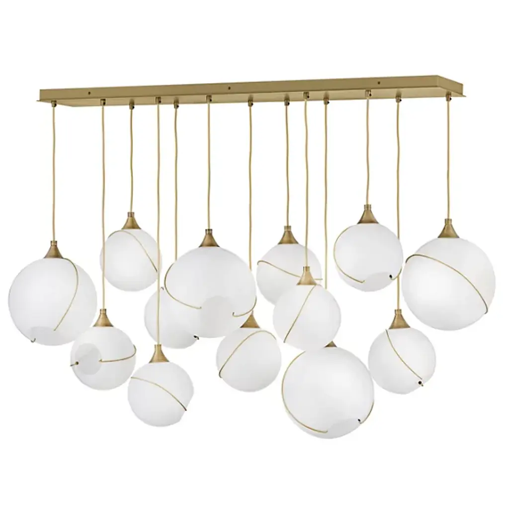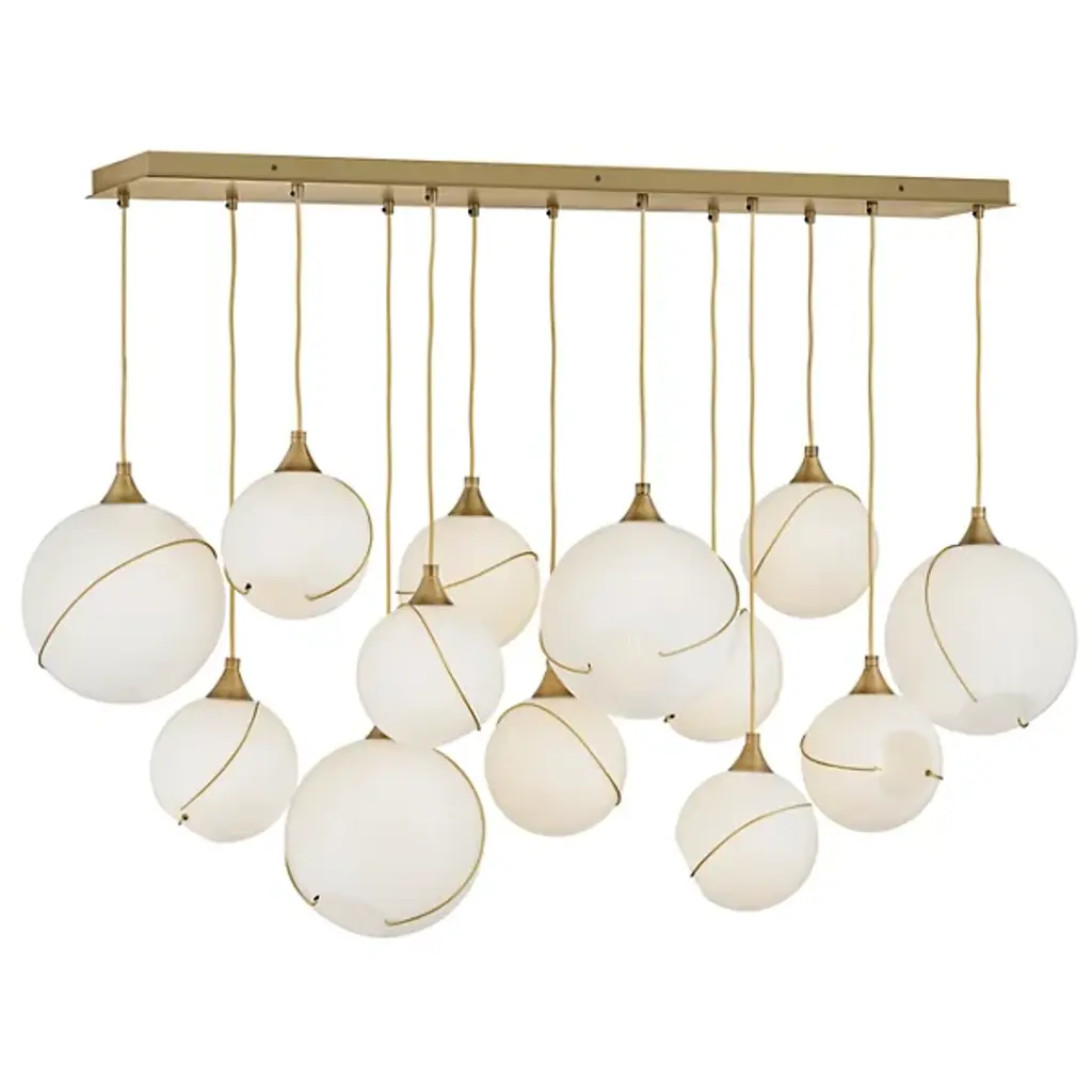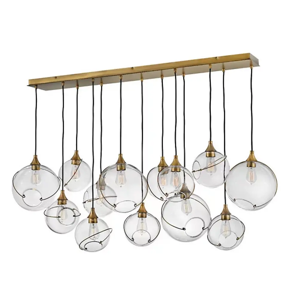Make a decorative statement while enhancing the ambiance by adding the Skye Linear Suspension by Hinkley Lighting to your kitchen or dining area. A unique approach to mid-century modern style, this fixture features a smooth, elongated canopy that drops several thin black cables to suspend open glass orbs of various sizes. Thin metal banding adorns each globe, adding decorative charm and intriguing asymmetrical quality. Its warm light glistens through the glass to brighten the room with a warm glow.
