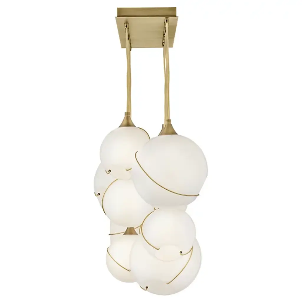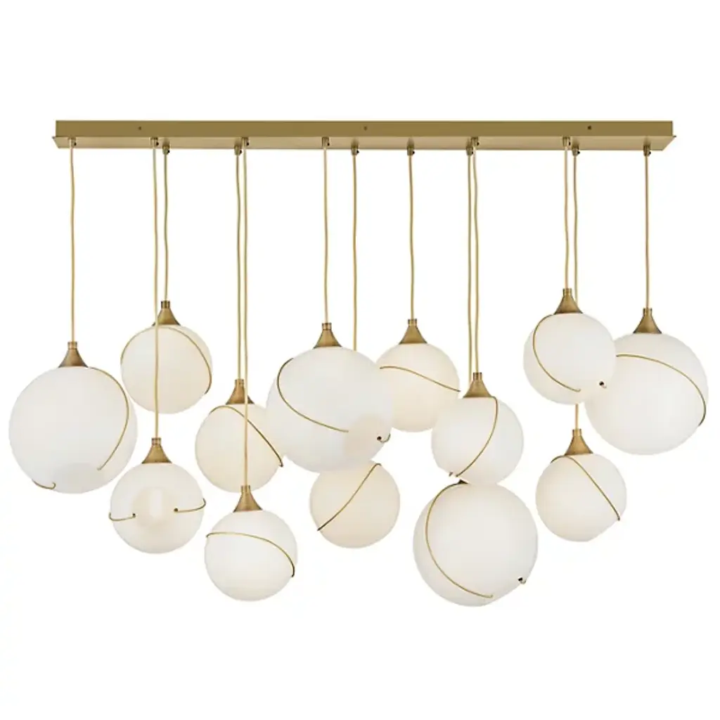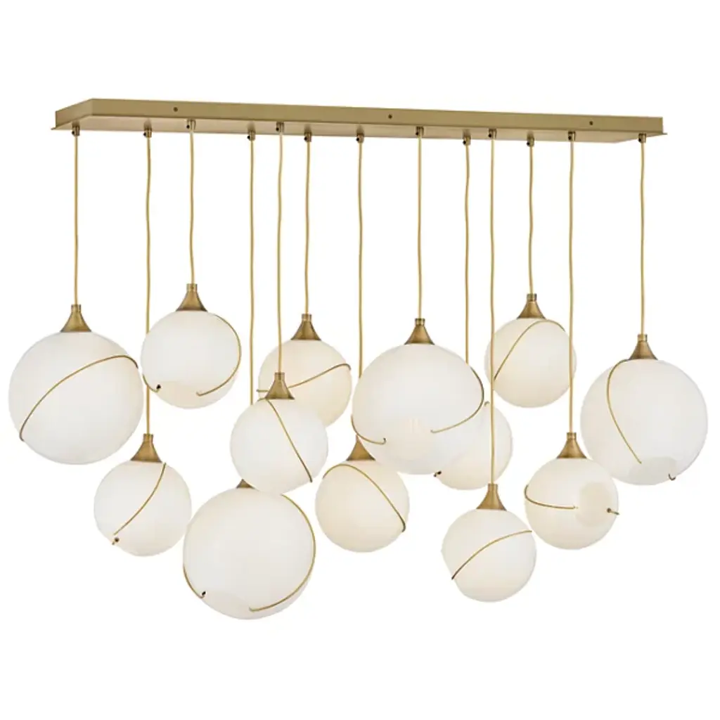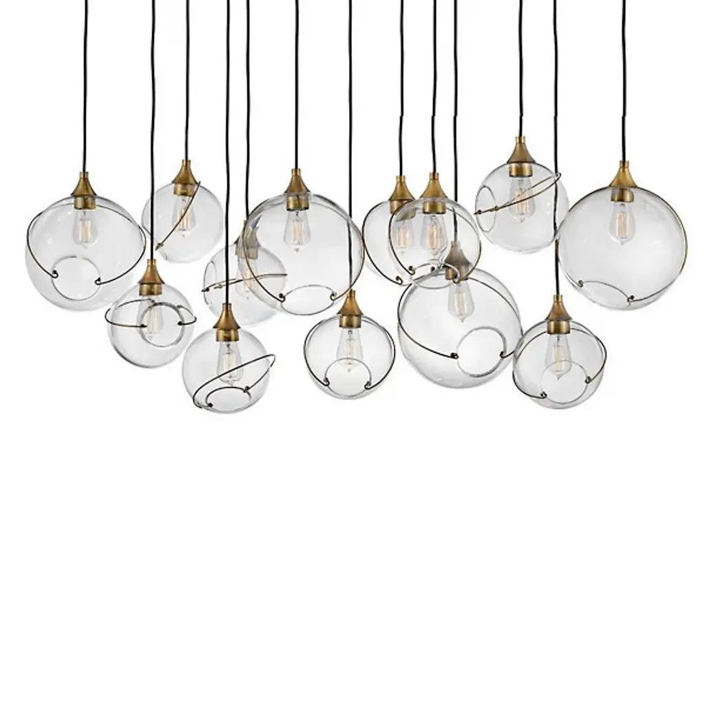 Make a decorative statement while enhancing the ambiance by adding the Skye Linear Suspension by Hinkley Lighting to your kitchen or dining area. A unique approach to mid-century modern style, this fixture features a smooth, elongated canopy that drops several thin black cables to suspend open glass orbs of various sizes. Thin metal banding adorns each globe, adding decorative charm and intriguing asymmetrical quality. Its warm light glistens through the glass to brighten the room with a warm glow.