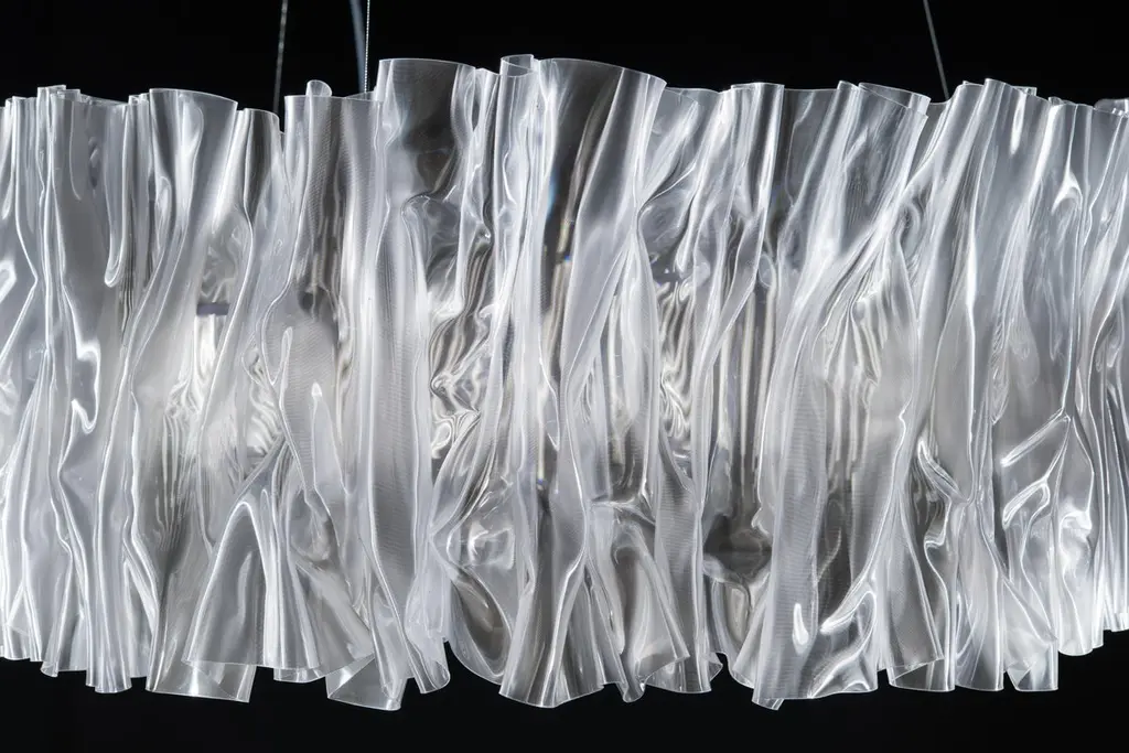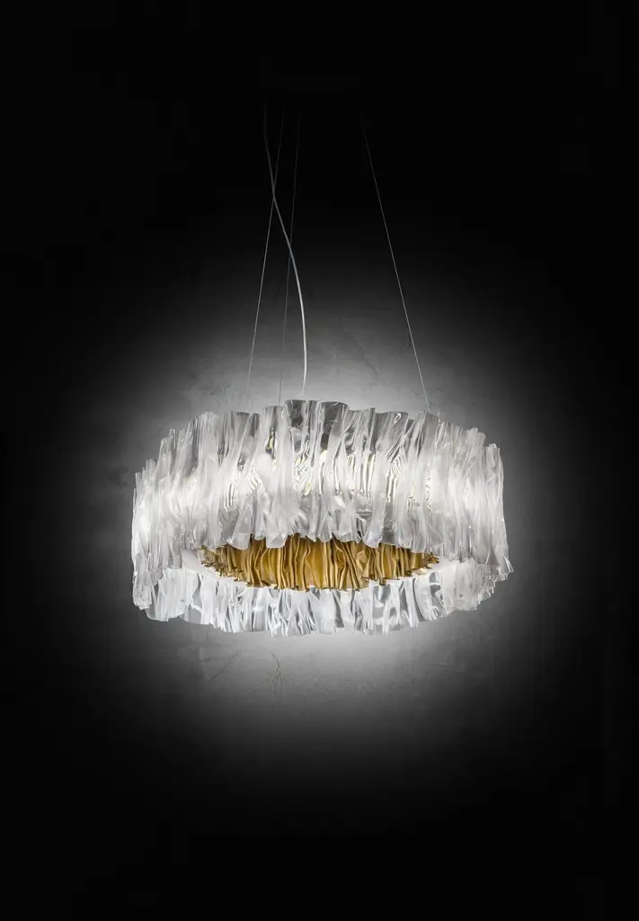 Marc Sadler explores the infinite possibilities of Slamp’s technopolymers with Accordèon, conjuring the image of a textile plissé or an accordion’s bellows. The collection is a sure marker of the new contemporary narrative that sees design, fashion, artisan technique and technology in permanent interaction. The LED crown, in 2.700 or 3.000 Kelvin according to choice, reaches up to 5.700 lumen, and can be dimmed.Size: Ø 57 cm x 20 cm / Ø 22-1/4” x H 7-3/4” maximum cable length 140 cm / 55”Available colors: Gold, silver and whiteMaterials: Lentiflex / Goldflex or SteelflexLight source: LED: 51W - 100~240V 5.700 Lumen 2700 Kelvin or 3.000 Kelvin Dimmable with: PWM, 0-10 or Potentiometer, USA version Triac Dimmable.