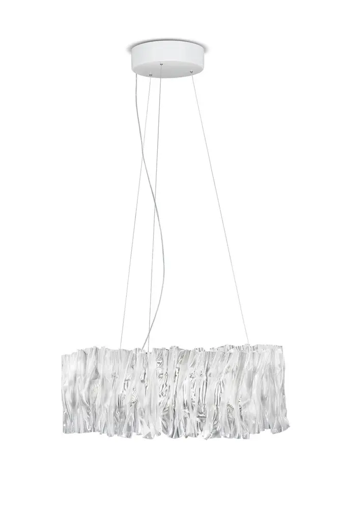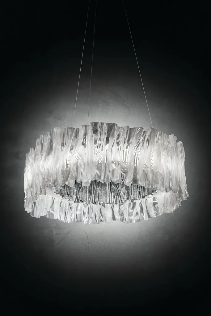 Marc Sadler explores the infinite possibilities of Slamp’s technopolymers with Accordèon, conjuring the image of a textile plissé or an accordion’s bellows. The collection is a sure marker of the new contemporary narrative that sees design, fashion, artisan technique and technology in permanent interaction. The LED crown, in 2.700 or 3.000 kelvin according to choice, reaches up to 5.700 Lumen, and can be dimmed.Size: Ø 57 cm x 20 cm / Ø 22-1/4” x H 7-3/4” maximum cable length 140 cm / 55”Available colors: Gold, silver, and whiteMaterials: Lentiflex / Goldflex or SteelflexLight source: LED: 51W - 100~240V 5.700 Lumen 2700 Kelvin or 3.000 Kelvin dimmable with: PWM, 0-10 or potentiometer, USA version Triac dimmable.Hand-Molded Patented ProcessTechnoforming, a material manipulation technique using heat, was developed with Marc Sadler for the Accordéon, Tulip, and LaFleur collections. Slamp’s technopolymer is brought to a softened state and then hand-manipulated - allowing it to give life, with a hi-tech material, to unique pieces and shapes that are never mechanically reproducible.