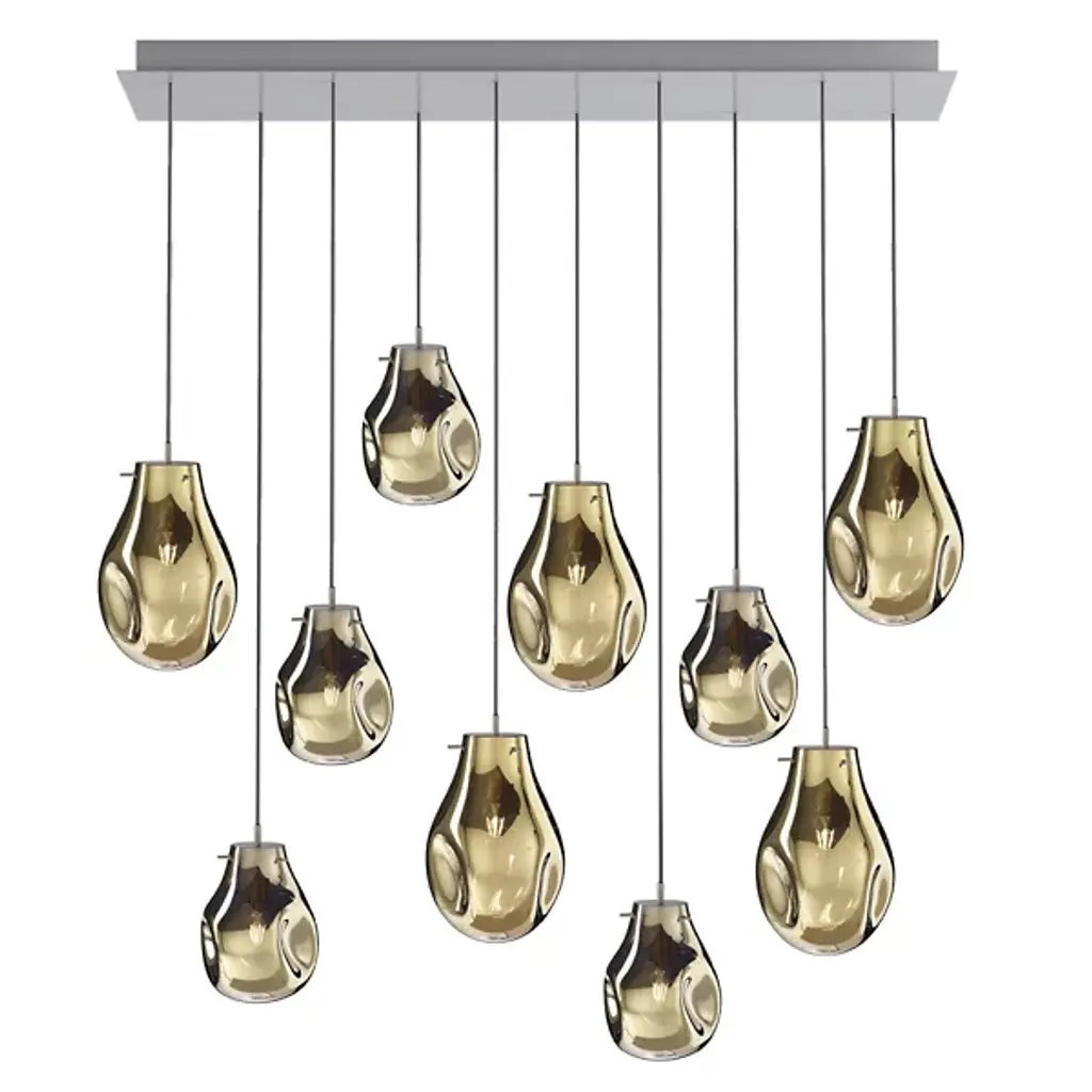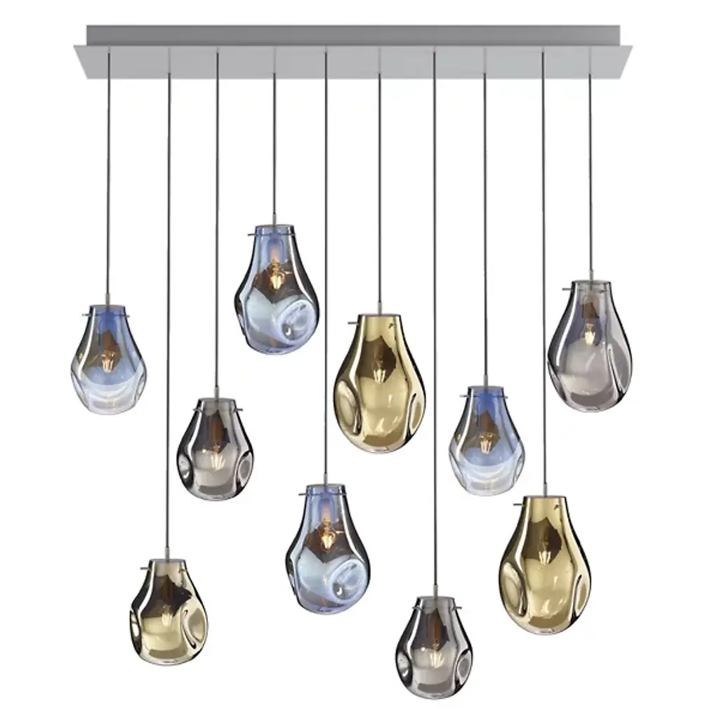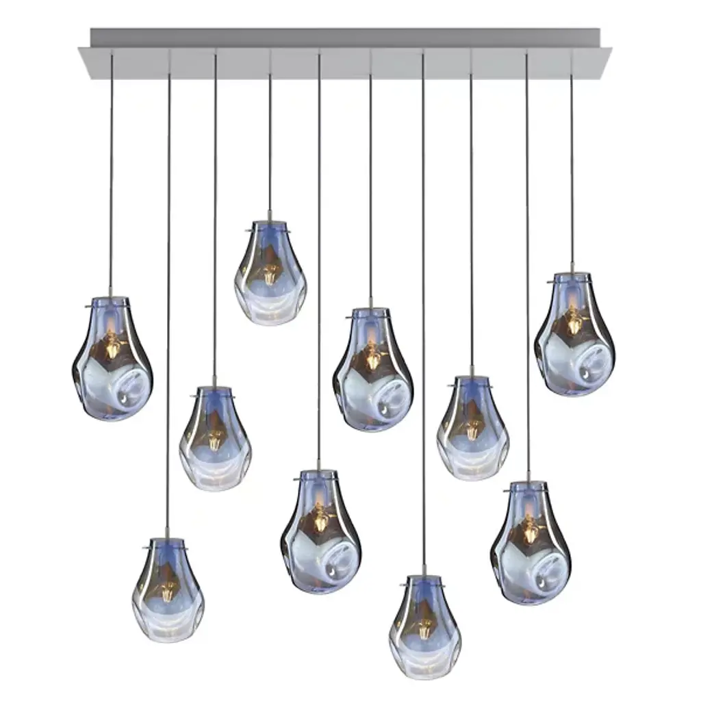 The Soap Linear Suspension from Bomma blends varied colors, transparency, and ever-changing shapes. When lit, its metallic sheen transforms into a stunning iridescent and translucent display, revealing the crystal. Handblown without a mold, a seemingly perfect drop of molten glass takes on a unique shape and color, making every piece unique. Create striking compositions by grouping multiple light fixtures or mixing their color schemes, adding a dynamic and artistic element to any space.