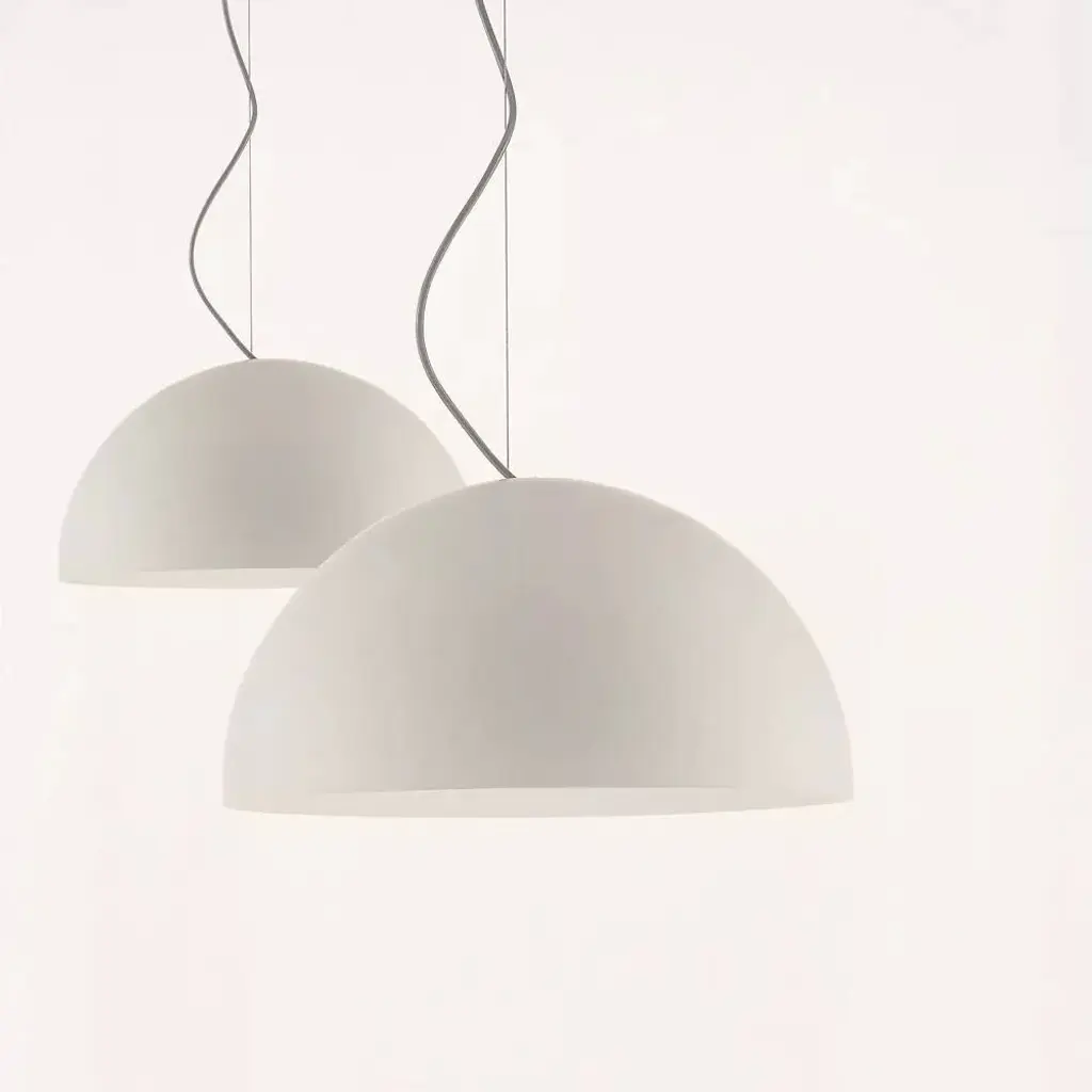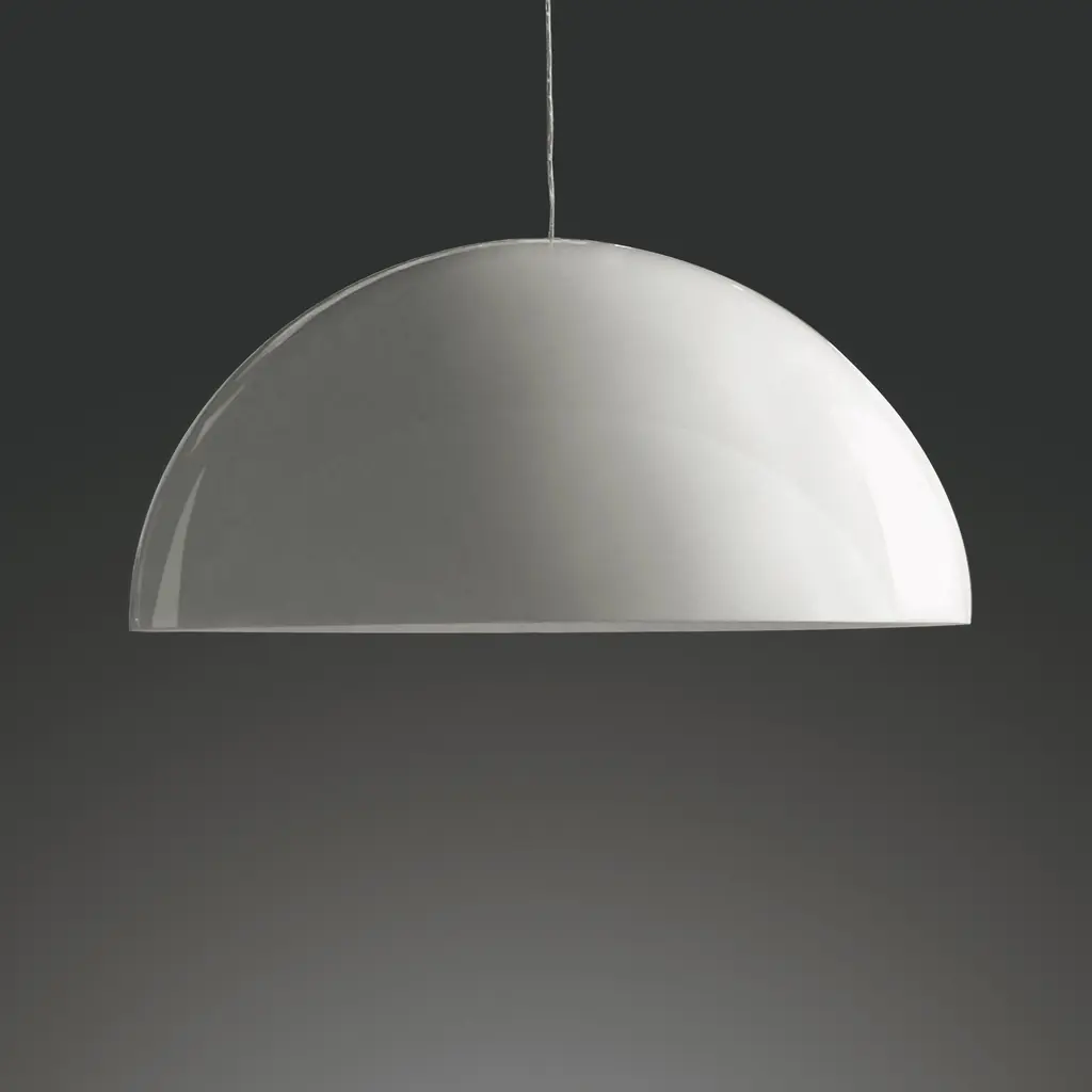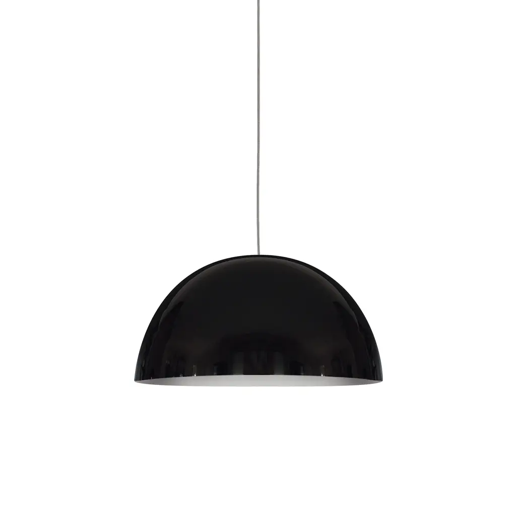 The Sonora Suspension Lamp, introduced in 1976, features a hemispherical shade crafted from turned aluminum, providing direct and reflected light. Designed by Vico Magistretti, known for his focus on geometric simplicity, the lamp is available in 4 sizes and various finishes, including black with a white interior and gold with a white interior.